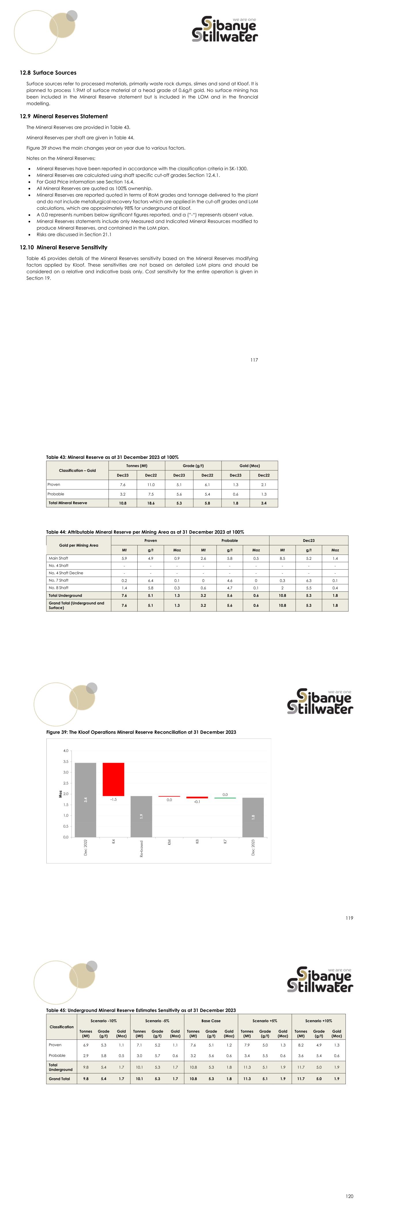 117 12.8 Surface Sources Surface sources refer to processed materials, primarily waste rock dumps, slimes and sand at Kloof. It is planned to process 1.9Mt of surface material at a head grade of 0.6g/t gold. No surface mining has been included in the Mineral Reserve statement but is included in the LOM and in the financial modelling. 12.9 Mineral Reserves Statement The Mineral Reserves are provided in Table 43. Mineral Reserves per shaft are given in Table 44. Figure 39 shows the main changes year on year due to various factors. Notes on the Mineral Reserves;  Mineral Reserves have been reported in accordance with the classification criteria in SK-1300.  Mineral Reserves are calculated using shaft specific cut-off grades Section 12.4.1.  For Gold Price information see Section 16.4.  All Mineral Reserves are quoted as 100% ownership.  Mineral Reserves are reported quoted in terms of RoM grades and tonnage delivered to the plant and do not include metallurgical recovery factors which are applied in the cut-off grades and LoM calculations, which are approximately 98% for underground at Kloof.  A 0.0 represents numbers below significant figures reported, and a (“-“) represents absent value.  Mineral Reserves statements include only Measured and Indicated Mineral Resources modified to produce Mineral Reserves, and contained in the LoM plan.  Risks are discussed in Section 21.1 12.10 Mineral Reserve Sensitivity Table 45 provides details of the Mineral Reserves sensitivity based on the Mineral Reserves modifying factors applied by Kloof. These sensitivities are not based on detailed LoM plans and should be considered on a relative and indicative basis only. Cost sensitivity for the entire operation is given in Section 19. Table 43: Mineral Reserve as at 31 December 2023 at 100% Classification – Gold Tonnes (Mt) Grade (g/t) Gold (Moz) Dec23 Dec22 Dec23 Dec22 Dec23 Dec22 Proven 7.6 11.0 5.1 6.1 1.3 2.1 Probable 3.2 7.5 5.6 5.4 0.6 1.3 Total Mineral Reserve 10.8 18.6 5.3 5.8 1.8 3.4 Table 44: Attributable Mineral Reserve per Mining Area as at 31 December 2023 at 100% Gold per Mining Area Proven Probable Dec23 Mt g/t Moz Mt g/t Moz Mt g/t Moz Main Shaft 5.9 4.9 0.9 2.6 5.8 0.5 8.5 5.2 1.4 No. 4 Shaft - - - - - - - - - No. 4 Shaft Decline - - - - - - - - - No. 7 Shaft 0.2 6.4 0.1 0 4.6 0 0.3 6.3 0.1 No. 8 Shaft 1.4 5.8 0.3 0.6 4.7 0.1 2 5.5 0.4 Total Underground 7.6 5.1 1.3 3.2 5.6 0.6 10.8 5.3 1.8 Grand Total (Underground and Surface) 7.6 5.1 1.3 3.2 5.6 0.6 10.8 5.3 1.8 119 Figure 39: The Kloof Operations Mineral Reserve Reconciliation at 31 December 2023 120 Table 45: Underground Mineral Reserve Estimates Sensitivity as at 31 December 2023 Classification Scenario -10% Scenario -5% Base Case Scenario +5% Scenario +10% Tonnes (Mt) Grade (g/t) Gold (Moz) Tonnes (Mt) Grade (g/t) Gold (Moz) Tonnes (Mt) Grade (g/t) Gold (Moz) Tonnes (Mt) Grade (g/t) Gold (Moz) Tonnes (Mt) Grade (g/t) Gold (Moz) Proven 6.9 5.3 1.1 7.1 5.2 1.1 7.6 5.1 1.2 7.9 5.0 1.3 8.2 4.9 1.3 Probable 2.9 5.8 0.5 3.0 5.7 0.6 3.2 5.6 0.6 3.4 5.5 0.6 3.6 5.4 0.6 Total Underground 9.8 5.4 1.7 10.1 5.3 1.7 10.8 5.3 1.8 11.3 5.1 1.9 11.7 5.0 1.9 Grand Total 9.8 5.4 1.7 10.1 5.3 1.7 10.8 5.3 1.8 11.3 5.1 1.9 11.7 5.0 1.9