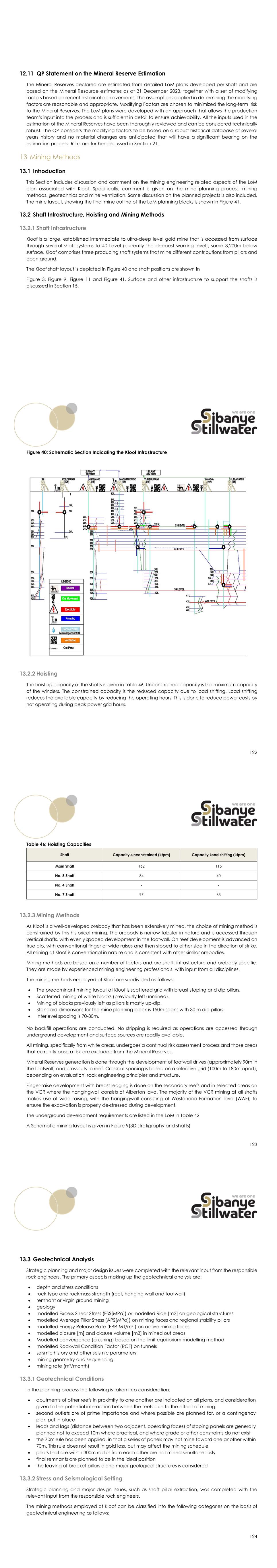 12.11 QP Statement on the Mineral Reserve Estimation The Mineral Reserves declared are estimated from detailed LoM plans developed per shaft and are based on the Mineral Resource estimates as at 31 December 2023, together with a set of modifying factors based on recent historical achievements. The assumptions applied in determining the modifying factors are reasonable and appropriate. Modifying Factors are chosen to minimized the long-term risk to the Mineral Reserves. The LoM plans were developed with an approach that allows the production team’s input into the process and is sufficient in detail to ensure achievability. All the inputs used in the estimation of the Mineral Reserves have been thoroughly reviewed and can be considered technically robust. The QP considers the modifying factors to be based on a robust historical database of several years history and no material changes are anticipated that will have a significant bearing on the estimation process. Risks are further discussed in Section 21. 13 Mining Methods 13.1 Introduction This Section includes discussion and comment on the mining engineering related aspects of the LoM plan associated with Kloof. Specifically, comment is given on the mine planning process, mining methods, geotechnics and mine ventilation. Some discussion on the planned projects is also included. The mine layout, showing the final mine outline of the LoM planning blocks is shown in Figure 41. 13.2 Shaft Infrastructure, Hoisting and Mining Methods 13.2.1 Shaft Infrastructure Kloof is a large, established intermediate to ultra-deep level gold mine that is accessed from surface through several shaft systems to 40 Level (currently the deepest working level), some 3,200m below surface. Kloof comprises three producing shaft systems that mine different contributions from pillars and open ground. The Kloof shaft layout is depicted in Figure 40 and shaft positions are shown in Figure 3, Figure 9, Figure 11 and Figure 41. Surface and other infrastructure to support the shafts is discussed in Section 15. 122 Figure 40: Schematic Section Indicating the Kloof Infrastructure 13.2.2 Hoisting The hoisting capacity of the shafts is given in Table 46. Unconstrained capacity is the maximum capacity of the winders. The constrained capacity is the reduced capacity due to load shifting. Load shifting reduces the available capacity by reducing the operating hours. This is done to reduce power costs by not operating during peak power grid hours. 123 Table 46: Hoisting Capacities Shaft Capacity-unconstrained (ktpm) Capacity Load shifting (ktpm) Main Shaft 162 115 No. 8 Shaft 84 40 No. 4 Shaft - - No. 7 Shaft 97 63 13.2.3 Mining Methods As Kloof is a well-developed orebody that has been extensively mined, the choice of mining method is constrained by this historical mining. The orebody is narrow tabular in nature and is accessed through vertical shafts, with evenly spaced development in the footwall. On reef development is advanced on true dip, with conventional finger or wide raises and then stoped to either side in the direction of strike. All mining at Kloof is conventional in nature and is consistent with other similar orebodies. Mining methods are based on a number of factors and are shaft, infrastructure and orebody specific. They are made by experienced mining engineering professionals, with input from all disciplines. The mining methods employed at Kloof are subdivided as follows:  The predominant mining layout at Kloof is scattered grid with breast stoping and dip pillars.  Scatterred mining of white blocks (previously left unmined).  Mining of blocks previously left as pillars is mostly up-dip.  Standard dimensions for the mine planning block is 150m spans with 30 m dip pillars.  Interlevel spacing is 70-80m. No backfill operations are conducted. No stripping is required as operations are accessed through underground development and surface sources are readily available. All mining, specifically from white areas, undergoes a continual risk assessment process and those areas that currently pose a risk are excluded from the Mineral Reserves. Mineral Reserves generation is done through the development of footwall drives (approximately 90m in the footwall) and crosscuts to reef. Crosscut spacing is based on a selective grid (100m to 180m apart), depending on evaluation, rock engineering principles and structure. Finger-raise development with breast ledging is done on the secondary reefs and in selected areas on the VCR where the hangingwall consists of Alberton lava. The majority of the VCR mining at all shafts makes use of wide raising, with the hangingwall consisting of Westonaria Formation lava (WAF), to ensure the excavation is properly de-stressed during development. The underground development requirements are listed in the LoM in Table 42 A Schematic mining layout is given in Figure 9(3D stratigraphy and shafts) 124 13.3 Geotechnical Analysis Strategic planning and major design issues were completed with the relevant input from the responsible rock engineers. The primary aspects making up the geotechnical analysis are:  depth and stress conditions  rock type and rockmass strength (reef, hanging wall and footwall)  remnant or virgin ground mining  geology  modelled Excess Shear Stress (ESS[MPa]) or modelled Ride [m3] on geological structures  modelled Average Pillar Stress (APS[MPa]) on mining faces and regional stability pillars  modelled Energy Release Rate (ERR[MJ/m²]) on active mining faces  modelled closure [m] and closure volume [m3] in mined out areas  Modelled convergence (crushing) based on the limit equilibrium modelling method  modelled Rockwall Condition Factor (RCF) on tunnels  seismic history and other seismic parameters  mining geometry and sequencing  mining rate (m²/month) 13.3.1 Geotechnical Conditions In the planning process the following is taken into consideration:  abutments of other reef