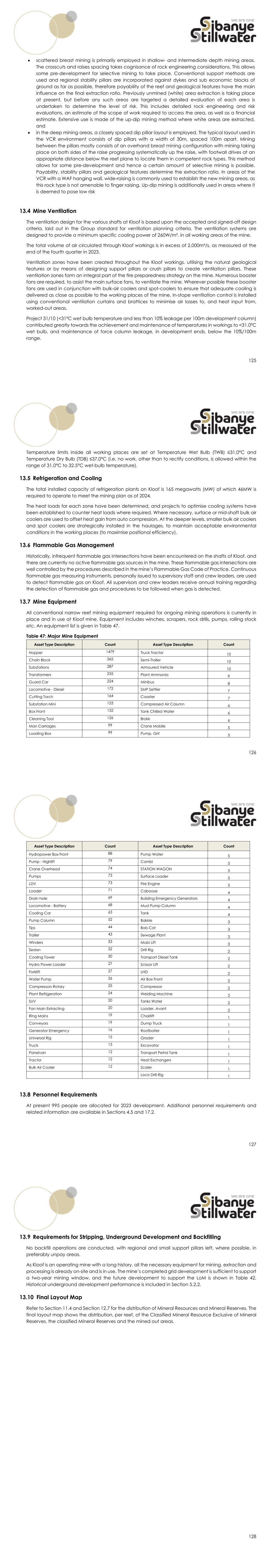 125  scattered breast mining is primarily employed in shallow- and intermediate depth mining areas. The crosscuts and raises spacing takes cognisance of rock engineering considerations. This allows some pre-development for selective mining to take place. Conventional support methods are used and regional stability pillars are incorporated against dykes and sub economic blocks of ground as far as possible, therefore payability of the reef and geological features have the main influence on the final extraction ratio. Previously unmined (white) area extraction is taking place at present, but before any such areas are targeted a detailed evaluation of each area is undertaken to determine the level of risk. This includes detailed rock engineering and risk evaluations, an estimate of the scope of work required to access the area, as well as a financial estimate. Extensive use is made of the up-dip mining method where white areas are extracted, and  in the deep mining areas, a closely spaced dip pillar layout is employed. The typical layout used in the VCR environment consists of dip pillars with a width of 30m, spaced 100m apart. Mining between the pillars mostly consists of an overhand breast mining configuration with mining taking place on both sides of the raise progressing systematically up the raise, with footwall drives at an appropriate distance below the reef plane to locate them in competent rock types. This method allows for some pre-development and hence a certain amount of selective mining is possible. Payability, stability pillars and geological features determine the extraction ratio. In areas of the VCR with a WAF hanging wall, wide-raising is commonly used to establish the new mining areas, as this rock type is not amenable to finger raising. Up-dip mining is additionally used in areas where it is deemed to pose low risk 13.4 Mine Ventilation The ventilation design for the various shafts at Kloof is based upon the accepted and signed-off design criteria, laid out in the Group standard for ventilation planning criteria. The ventilation systems are designed to provide a minimum specific cooling power of 260W/m², in all working areas of the mine. The total volume of air circulated through Kloof workings is in excess of 2,000m³/s, as measured at the end of the fourth quarter in 2023. Ventilation zones have been created throughout the Kloof workings, utilising the natural geological features or by means of designing support pillars or crush pillars to create ventilation pillars. These ventilation zones form an integral part of the fire preparedness strategy on the mine. Numerous booster fans are required, to assist the main surface fans, to ventilate the mine. Wherever possible these booster fans are used in conjunction with bulk-air coolers and spot-coolers to ensure that adequate cooling is delivered as close as possible to the working places of the mine. In-stope ventilation control is installed using conventional ventilation curtains and brattices to minimise air losses to, and heat input from, worked-out areas. Project 31/10 (<31ºC wet bulb temperature and less than 10% leakage per 100m development column) contributed greatly towards the achievement and maintenance of temperatures in workings to <31.0ºC wet bulb, and maintenance of force column leakage, in development ends, below the 10%/100m range. 126 Temperature limits inside all working places are set at Temperature Wet Bulb (TWB) ≤31.0°C and Temperature Dry Bulb (TDB) ≤37.0°C (i.e. no work, other than to rectify conditions, is allowed within the range of 31.0°C to 32.5°C wet-bulb temperature). 13.5 Refrigeration and Cooling The total installed capacity of refrigeration plants on Kloof is 165 megawatts (MW) of which 46MW is required to operate to meet the mining plan as of 2024. The heat loads for each zone have been determined, and projects to optimise cooling systems have been established to counter heat loads where required. Where necessary, surface or mid-shaft bulk air coolers are used to offset heat gain from auto compression. At the deeper levels, smaller bulk air coolers and spot coolers are strategically installed in the haulages, to maintain acceptable environmental conditions in the working places (to maximise positional efficiency). 13.6 Flammable Gas Management Historically, infrequent flammable gas intersections have been encountered on the shafts of Kloof, and there are currently no active flammable gas sources in the mine. These flammable gas intersections are well controlled by the procedures described in the mine’s Flammable Gas Code of Practice. Continuous flammable gas measuring instruments, personally issued to supervisory staff and crew leaders, are used to detect flammable gas on Kloof. All supervisors and crew leaders receive annual training regarding the detection of flammable gas and procedures to be followed when gas is detected. 13.7 Mine Equipment All conventional narrow reef mining equipment required for ongoing mining operations is currently in place and in use at Kloof mine. Equipment includes winches, scrapers, rock drills, pumps, rolling stock etc. An equipment list is given in Table 47. Table 47: Major Mine Equipment Asset Type Description Count Asset Type Description Count Hopper 1479 Truck Tractor 10 Chain Block 365 Semi-Trailer 10 Substations 287 Armoured Vehicle 10 Transformers 235 Plant Ammonia 9 Guard Car 224 Minibus 8 Locomotive - Diesel 172 SMP Settler 7 Cutting Torch 164 Coaster 7 Substation Mini 153 Compressed Air Column 6 Box Front 132 Tank Chilled Water 6 Cleaning Tool 126 Brokk 6 Man Carriages 99 Crane Mobile 5 Loading Box 99 Pump, Grit 5 127 Asset Type Description Count Asset Type Description Count Hydropower Box Front 88 Pump Water 5 Pump - Highlift 79 Combi 5 Crane Overhead 74 STATION WAGON 5 Pumps 73 Surface Loader 5 LDV 73 Fire Engine 5 Loader 71 Caboose 4 Drain hole 69 Building Emergency Generators 4 Locomotive - Battery 68 Mud Pump Column 4 Cooling C