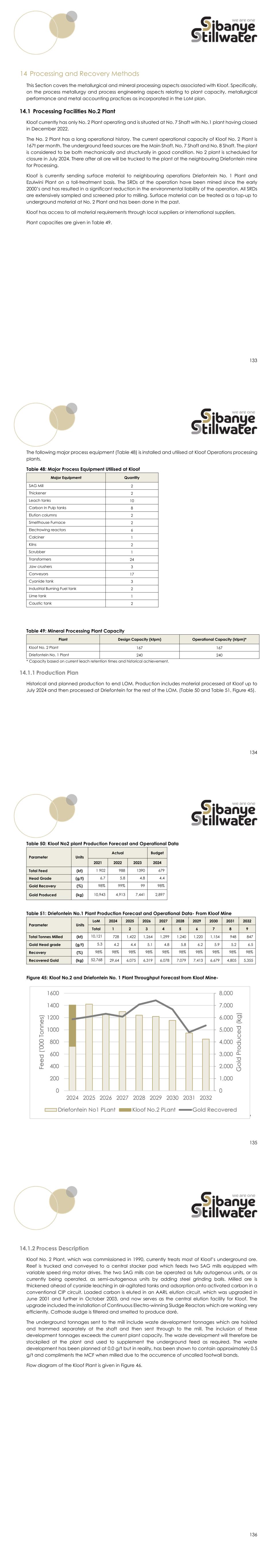 133 14 Processing and Recovery Methods This Section covers the metallurgical and mineral processing aspects associated with Kloof. Specifically, on the process metallurgy and process engineering aspects relating to plant capacity, metallurgical performance and metal accounting practices as incorporated in the LoM plan. 14.1 Processing Facilities No.2 Plant Kloof currently has only No. 2 Plant operating and is situated at No. 7 Shaft with No.1 plant having closed in December 2022. The No. 2 Plant has a long operational history. The current operational capacity of Kloof No. 2 Plant is 167t per month. The underground feed sources are the Main Shaft, No. 7 Shaft and No. 8 Shaft. The plant is considered to be both mechanically and structurally in good condition. No 2 plant is scheduled for closure in July 2024. There after all ore will be trucked to the plant at the neighbouring Driefontein mine for Processing. Kloof is currently sending surface material to neighbouring operations Driefontein No. 1 Plant and Ezulwini Plant on a toll-treatment basis. The SRDs at the operation have been mined since the early 2000’s and has resulted in a significant reduction in the environmental liability of the operation. All SRDs are extensively sampled and screened prior to milling. Surface material can be treated as a top-up to underground material at No. 2 Plant and has been done in the past. Kloof has access to all material requirements through local suppliers or international suppliers. Plant capacities are given in Table 49. 134 The following major process equipment (Table 48) is installed and utilised at Kloof Operations processing plants. Table 48: Major Process Equipment Utilised at Kloof Major Equipment Quantity SAG Mill 2 Thickener 2 Leach tanks 10 Carbon In Pulp tanks 8 Elution columns 2 Smelthouse Furnace 2 Electrowing reactors 6 Calciner 1 Kilns 2 Scrubber 1 Transformers 24 Jaw crushers 3 Conveyors 17 Cyanide tank 3 Industrial Burning Fuel tank 2 Lime tank 1 Caustic tank 2 Table 49: Mineral Processing Plant Capacity Plant Design Capacity (ktpm) Operational Capacity (ktpm)* Kloof No. 2 Plant 167 167 Driefontein No. 1 Plant 240 240 * Capacity based on current leach retention times and historical achievement. 14.1.1 Production Plan Historical and planned production to end LOM. Production includes material processed at Kloof up to July 2024 and then processed at Driefontein for the rest of the LOM. (Table 50 and Table 51, Figure 45). 135 Table 50: Kloof No2 plant Production Forecast and Operational Data Parameter Units Actual Budget 2021 2022 2023 2024 Total Feed (kt) 1 902 988 1390 679 Head Grade (g/t) 6,7 5,8 4.8 4.4 Gold Recovery (%) 98% 99% 99 98% Gold Produced (kg) 10,943 4,913 7,441 2,897 Table 51: Driefontein No.1 Plant Production Forecast and Operational Data- From Kloof Mine Parameter Units LoM 2024 2025 2026 2027 2028 2029 2030 2031 2032 Total 1 2 3 4 5 6 7 8 9 Total Tonnes Milled (kt) 10,121 728 1,422 1,264 1,299 1,240 1,220 1,154 948 847 Gold Head grade (g/t) 5.3 4.2 4.4 5.1 4.8 5.8 6.2 5.9 5.2 6.5 Recovery (%) 98% 98% 98% 98% 98% 98% 98% 98% 98% 98% Recovered Gold (kg) 52,768 29,64 6,075 6,319 6,078 7,079 7,413 6,679 4,805 5,355 Figure 45: Kloof No.2 and Driefontein No. 1 Plant Throughput Forecast from Kloof Mine- 136 14.1.2 Process Description Kloof No. 2 Plant, which was commissioned in 1990, currently treats most of Kloof’s underground ore. Reef is trucked and conveyed to a central stacker pad which feeds two SAG mills equipped with variable speed ring motor drives. The two SAG mills can be operated as fully autogenous units, or as currently being operated, as semi-autogenous units by adding steel grinding balls. Milled ore is thickened ahead of cyanide leaching in air-agitated tanks and adsorption onto activated carbon in a conventional CIP circuit. Loaded carbon is eluted in an AARL elution circuit, which was upgraded in June 2001 and further in October 2003, and now serves as the central elution facility for Kloof. The upgrade included the installation of Continuous Electro-winning Sludge Reactors which are working very efficiently. Cathode sludge is filtered and smelted to produce doré. The underground tonnages sent to the mill include waste development tonnages which are hoisted and trammed separately at the shaft and then sent through to the mill. The inclusion of these development tonnages exceeds the current plant capacity. The waste development will therefore be stockpiled at the plant and used to supplement the underground feed as required. The waste development has been planned at 0.0 g/t but in reality, has been shown to contain approximately 0.5 g/t and compliments the MCF when milled due to the occurrence of uncalled footwall bands. Flow diagram of the Kloof Plant is given in Figure 46.