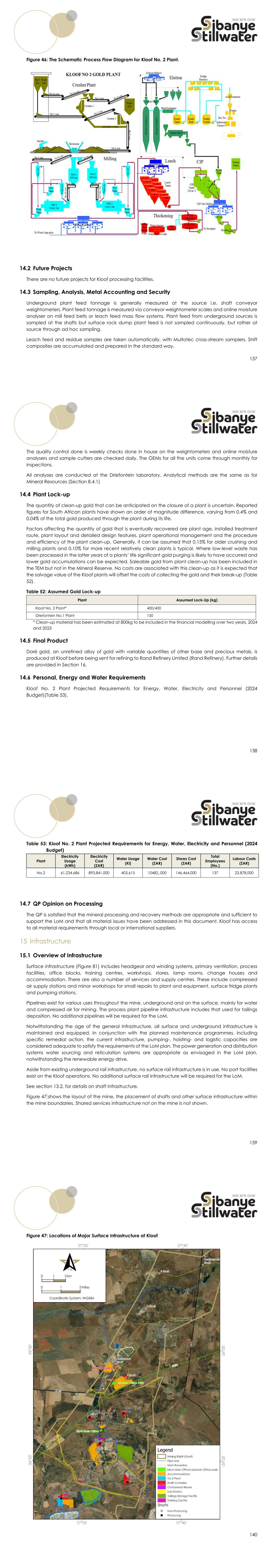 137 Figure 46: The Schematic Process Flow Diagram for Kloof No. 2 Plant. 14.2 Future Projects There are no future projects for Kloof processing facilities. 14.3 Sampling, Analysis, Metal Accounting and Security Underground plant feed tonnage is generally measured at the source i.e. shaft conveyor weightometers. Plant feed tonnage is measured via conveyor weightometer scales and online moisture analyser on mill feed belts or leach feed mass flow systems. Plant feed from underground sources is sampled at the shafts but surface rock dump plant feed is not sampled continuously, but rather at source through ad hoc sampling. Leach feed and residue samples are taken automatically, with Multotec cross-stream samplers. Shift composites are accumulated and prepared in the standard way. 138 The quality control done is weekly checks done in house on the weightometers and online moisture analysers and sample cutters are checked daily. The OEMs for all the units come through monthly for inspections. All analyses are conducted at the Driefontein laboratory. Analytical methods are the same as for Mineral Resources (Section 8.4.1) 14.4 Plant Lock-up The quantity of clean-up gold that can be anticipated on the closure of a plant is uncertain. Reported figures for South African plants have shown an order of magnitude difference, varying from 0.4% and 0.04% of the total gold produced through the plant during its life. Factors affecting the quantity of gold that is eventually recovered are plant age, installed treatment route, plant layout and detailed design features, plant operational management and the procedure and efficiency of the plant clean-up. Generally, it can be assumed that 0.15% for older crushing and milling plants and 0.10% for more recent relatively clean plants is typical. Where low-level waste has been processed in the latter years of a plants’ life significant gold purging is likely to have occurred and lower gold accumulations can be expected. Saleable gold from plant clean-up has been included in the TEM but not in the Mineral Reserve. No costs are associated with this clean-up as it is expected that the salvage value of the Kloof plants will offset the costs of collecting the gold and their break-up (Table 52). Table 52: Assumed Gold Lock-up Plant Assumed Lock-Up (kg) Kloof No. 2 Plant* 400/400 Driefontein No.1 Plant 150 * Clean-up material has been estimated at 800kg to be included in the financial modelling over two years, 2024 and 2025 14.5 Final Product Doré gold, an unrefined alloy of gold with variable quantities of other base and precious metals, is produced at Kloof before being sent for refining to Rand Refinery Limited (Rand Refinery). Further details are provided in Section 16. 14.6 Personal, Energy and Water Requirements Kloof No. 2 Plant Projected Requirements for Energy, Water, Electricity and Personnel (2024 Budget)(Table 53). 139 Table 53: Kloof No. 2 Plant Projected Requirements for Energy, Water, Electricity and Personnel (2024 Budget) Plant Electricity Usage (kWh) Electricity Cost (ZAR) Water Usage (Kl) Water Cost (ZAR) Stores Cost (ZAR) Total Employees (No.) Labour Costs (ZAR) No.2 61,234,686 893,841,000 403,615 10482,,000 146,464,000 137 23,878,000 14.7 QP Opinion on Processing The QP is satisfied that the mineral processing and recovery methods are appropriate and sufficient to support the LoM and that all material issues have been addressed in this document. Kloof has access to all material requirements through local or international suppliers. 15 Infrastructure 15.1 Overview of Infrastructure Surface infrastructure (Figure 81) includes headgear and winding systems, primary ventilation, process facilities, office blocks, training centres, workshops, stores, lamp rooms, change houses and accommodation. There are also a number of services and supply centres. These include compressed air supply stations and minor workshops for small repairs to plant and equipment, surface fridge plants and pumping stations. Pipelines exist for various uses throughout the mine, underground and on the surface, mainly for water and compressed air for mining. The process plant pipeline infrastructure includes that used for tailings deposition. No additional pipelines will be required for the LoM. Notwithstanding the age of the general infrastructure, all surface and underground infrastructure is maintained and equipped. In conjunction with the planned maintenance programmes, including specific remedial action, the current infrastructure, pumping-, hoisting- and logistic capacities are considered adequate to satisfy the requirements of the LoM plan. The power generation and distribution systems water sourcing and reticulation systems are appropriate as envisaged in the LoM plan, notwithstanding the renewable energy drive. Aside from existing underground rail infrastructure, no surface rail infrastructure is in use. No port facilities exist on the Kloof operations. No additional surface rail infrastructure will be required for the LoM. See section 13.2, for details on shaft infrastructure. Figure 47 shows the layout of the mine, the placement of shafts and other surface infrastructure within the mine boundaries. Shared services infrastructure not on the mine is not shown. 140 Figure 47: Locations of Major Surface Infrastructure at Kloof