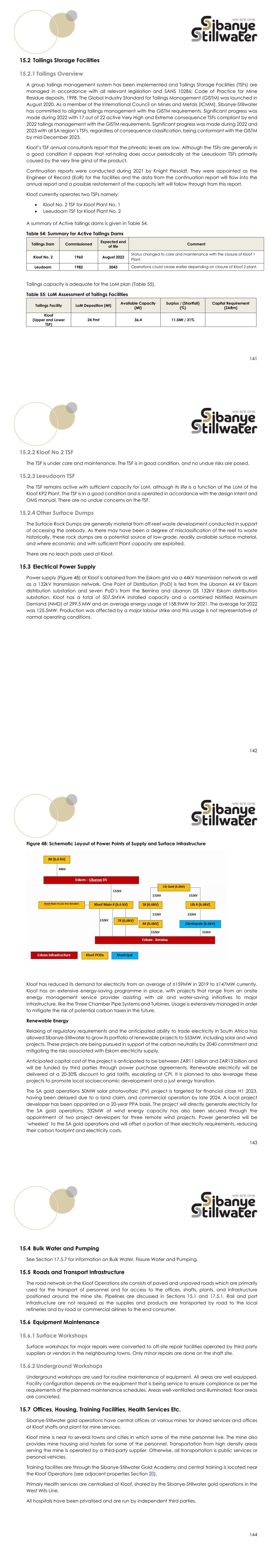 141 15.2 Tailings Storage Facilities 15.2.1 Tailings Overview A group tailings management system has been implemented and Tailings Storage Facilities (TSFs) are managed in accordance with all relevant legislation and SANS 10286: Code of Practice for Mine Residue deposits, 1998. The Global Industry Standard for Tailings Management (GISTM) was launched in August 2020. As a member of the International Council on Mines and Metals (ICMM), Sibanye-Stillwater has committed to aligning tailings management with the GISTM requirements. Significant progress was made during 2022 with 17 out of 22 active Very High and Extreme consequence TSFs compliant by end 2022 tailings management with the GISTM requirements. Significant progress was made during 2022 and 2023 with all SA region’s TSFs, regardless of consequence classification, being conformant with the GISTM by mid-December 2023. Kloof’s TSF annual consultants report that the phreatic levels are low. Although the TSFs are generally in a good condition it appears that rat-holing does occur periodically at the Leeudoorn TSFs primarily caused by the very fine grind of the product. Continuation reports were conducted during 2021 by Knight Piesoldt. They were appointed as the Engineer of Record (EoR) for the facilities and the data from the continuation report will flow into the annual report and a possible restatement of the capacity left will follow through from this report. Kloof currently operates two TSFs namely:  Kloof No. 2 TSF for Kloof Plant No. 1  Leeudoorn TSF for Kloof Plant No. 2 A summary of Active tailings dams is given in Table 54. Table 54: Summary for Active Tailings Dams Tailings Dam Commissioned Expected end of life Comment Kloof No. 2 1960 August 2022 Status changed to care and maintenance with the closure of Kloof 1 Plant. Leudoorn 1982 2043 Operations could cease earlier depending on closure of Kloof 2 plant. Tailings capacity is adequate for the LoM plan (Table 55). Table 55: LoM Assessment of Tailings Facilities Tailings Facility LoM Deposition (Mt) Available Capacity (Mt) Surplus / (Shortfall) (%) Capital Requirement (ZARm) Kloof (Upper and Lower TSF) 24.9mt 36.4 11.5Mt / 31% 142 15.2.2 Kloof No 2 TSF The TSF is under care and maintenance. The TSF is in good condition, and no undue risks are posed. 15.2.3 Leeudoorn TSF The TSF remains active with sufficient capacity for LoM, although its life is a function of the LoM of the Kloof KP2 Plant. The TSF is in a good condition and is operated in accordance with the design intent and OMS manual. There are no undue concerns on the TSF. 15.2.4 Other Surface Dumps The Surface Rock Dumps are generally material from off-reef waste development conducted in support of accessing the orebody. As there may have been a degree of misclassification of the reef to waste historically, these rock dumps are a potential source of low-grade, readily available surface material, and where economic and with sufficient Plant capacity are exploited. There are no leach pads used at Kloof. 15.3 Electrical Power Supply Power supply (Figure 48) at Kloof is obtained from the Eskom grid via a 44kV transmission network as well as a 132kV transmission network. One Point of Distribution (PoD) is fed from the Libanon 44 kV Eskom distribution substation and seven PoD’s from the Bernina and Libanon DS 132kV Eskom distribution substation. Kloof has a total of 507.5MVA installed capacity and a combined Notified Maximum Demand (NMD) of 299.5 MW and an average energy usage of 158.9MW for 2021. The average for 2022 was 125.5MW. Production was affected by a major labour strike and this usage is not representative of normal operating conditions. 143 Figure 48: Schematic Layout of Power Points of Supply and Surface Infrastructure Kloof has reduced its demand for electricity from an average of ±159MW in 2019 to ±147MW currently. Kloof has an extensive energy-saving programme in place, with projects that range from an onsite energy management service provider assisting with air and water-saving initiatives to major infrastructure, like the Three Chamber Pipe Systems and Turbines. Usage is extensively managed in order to mitigate the risk of potential carbon taxes in the future. Renewable Energy Relaxing of regulatory requirements and the anticipated ability to trade electricity in South Africa has allowed Sibanye-Stillwater to grow its portfolio of renewable projects to 553MW, including solar and wind projects. These projects are being pursued in support of the carbon neutrality by 2040 commitment and mitigating the risks associated with Eskom electricity supply. Anticipated capital cost of the project is anticipated to be between ZAR11 billion and ZAR13 billion and will be funded by third parties through power purchase agreements. Renewable electricity will be delivered at a 20-30% discount to grid tariffs, escalating at CPI. It is planned to also leverage these projects to promote local socioeconomic development and a just energy transition. The SA gold operations 50MW solar photovoltaic (PV) project is targeted for financial close H1 2023, having been delayed due to a land claim, and commercial operation by late 2024. A local project developer has been appointed on a 20-year PPA basis. The project will directly generate electricity for the SA gold operations. 332MW of wind energy capacity has also been secured through the appointment of two project developers for three remote wind projects. Power generated will be ‘wheeled’ to the SA gold operations and will offset a portion of their electricity requirements, reducing their carbon footprint and electricity costs. 144 15.4 Bulk Water and Pumping See Section 17.5.7 for information on Bulk Water, Fissure Water and Pumping. 15.5 Roads and Transport Infrastructure The road network on the Kloof Operations site consists of paved and unpaved roads which are primarily used for the transport of personnel and for access to the offices, shafts, plants, and infrastructur
