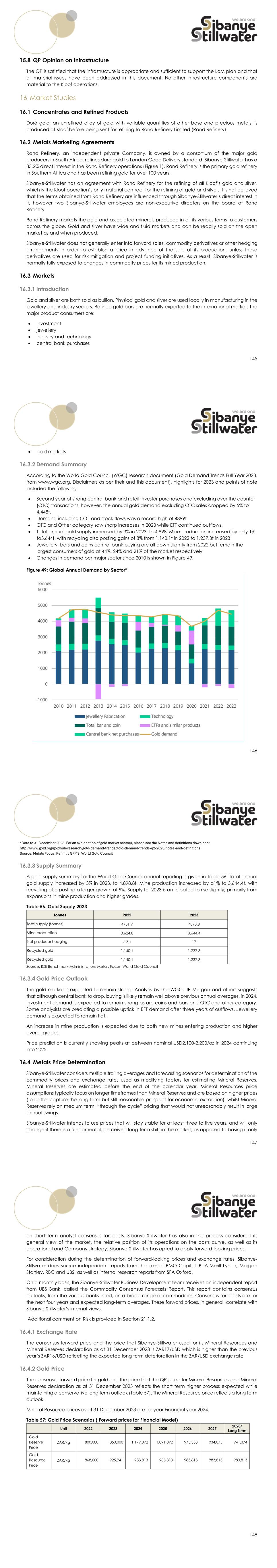 145 15.8 QP Opinion on Infrastructure The QP is satisfied that the infrastructure is appropriate and sufficient to support the LoM plan and that all material issues have been addressed in this document. No other infrastructure components are material to the Kloof operations. 16 Market Studies 16.1 Concentrates and Refined Products Doré gold, an unrefined alloy of gold with variable quantities of other base and precious metals, is produced at Kloof before being sent for refining to Rand Refinery Limited (Rand Refinery). 16.2 Metals Marketing Agreements Rand Refinery, an independent private Company, is owned by a consortium of the major gold producers in South Africa, refines doré gold to London Good Delivery standard. Sibanye-Stillwater has a 33.2% direct interest in the Rand Refinery operations (Figure 1). Rand Refinery is the primary gold refinery in Southern Africa and has been refining gold for over 100 years. Sibanye-Stillwater has an agreement with Rand Refinery for the refining of all Kloof’s gold and silver, which is the Kloof operation’s only material contract for the refining of gold and silver. It is not believed that the terms obtained from Rand Refinery are influenced through Sibanye-Stillwater’s direct interest in it, however two Sibanye-Stillwater employees are non-executive directors on the board of Rand Refinery. Rand Refinery markets the gold and associated minerals produced in all its various forms to customers across the globe. Gold and silver have wide and fluid markets and can be readily sold on the open market as and when produced. Sibanye-Stillwater does not generally enter into forward sales, commodity derivatives or other hedging arrangements in order to establish a price in advance of the sale of its production, unless these derivatives are used for risk mitigation and project funding initiatives. As a result, Sibanye-Stillwater is normally fully exposed to changes in commodity prices for its mined production. 16.3 Markets 16.3.1 Introduction Gold and silver are both sold as bullion. Physical gold and silver are used locally in manufacturing in the jewellery and industry sectors. Refined gold bars are normally exported to the international market. The major product consumers are:  investment  jewellery  industry and technology  central bank purchases 146  gold markets 16.3.2 Demand Summary According to the World Gold Council (WGC) research document (Gold Demand Trends Full Year 2023, from www.wgc.org. Disclaimers as per their and this document), highlights for 2023 and points of note included the following:  Second year of strong central bank and retail investor purchases and excluding over the counter (OTC) transactions, however, the annual gold demand excluding OTC sales dropped by 5% to 4,448t,  Demand including OTC and stock flows was a record high of 4899t  OTC and Other category saw sharp increases in 2023 while ETF continued outflows.  Total annual gold supply increased by 3% in 2023, to 4,898. Mine production increased by only 1% to3,644t, with recycling also posting gains of 8% from 1,140.1t in 2022 to 1,237.3t in 2023  Jewellery, bars and coins central bank buying are all down slightly from 2022 but remain the largest consumers of gold at 44%, 24% and 21% of the market respectively  Changes in demand per major sector since 2010 is shown in Figure 49. Figure 49: Global Annual Demand by Sector* 147 *Data to 31 December 2023. For an explanation of gold market sectors, please see the Notes and definitions download: http://www.gold.org/goldhub/research/gold-demand-trends/gold-demand-trends-q2-2023/notes-and-definitions Source: Metals Focus, Refinitiv GFMS, World Gold Council 16.3.3 Supply Summary A gold supply summary for the World Gold Council annual reporting is given in Table 56. Total annual gold supply increased by 3% in 2023, to 4,898.8t. Mine production increased by a1% to 3,644.4t, with recycling also posting a larger growth of 9%. Supply for 2023 is anticipated to rise slightly, primarily from expansions in mine production and higher grades. Table 56: Gold Supply 2023 Tonnes 2022 2023 Total supply (tonnes) 4751.9 4898.8 Mine production 3,624.8 3,644.4 Net producer hedging -13.1 17 Recycled gold 1,140.1 1,237.3 Recycled gold 1,140.1 1,237.3 Source: ICE Benchmark Administration, Metals Focus, World Gold Council 16.3.4 Gold Price Outlook The gold market is expected to remain strong. Analysis by the WGC, JP Morgan and others suggests that although central bank to drop, buying is likely remain well above previous annual averages, in 2024. Investment demand is expected to remain strong as are coins and bars and OTC and other category. Some analysists are predicting a possible uptick in EFT demand after three years of outflows. Jewellery demand is expected to remain flat. An increase in mine production is expected due to both new mines entering production and higher overall grades. Price prediction is currently showing peaks at between nominal USD2,100-2,200/oz in 2024 continuing into 2025. 16.4 Metals Price Determination Sibanye-Stillwater considers multiple trailing averages and forecasting scenarios for determination of the commodity prices and exchange rates used as modifying factors for estimating Mineral Reserves. Mineral Reserves are estimated before the end of the calendar year. Mineral Resources price assumptions typically focus on longer timeframes than Mineral Reserves and are based on higher prices (to better capture the long-term but still reasonable prospect for economic extraction), whilst Mineral Reserves rely on medium term, “through the cycle” pricing that would not unreasonably result in large annual swings. Sibanye-Stillwater intends to use prices that will stay stable for at least three to five years, and will only change if there is a fundamental, perceived long-term shift in the market, as opposed to basing it only 148 on short term analyst consensus forecasts. Sibanye-Stillwater has also