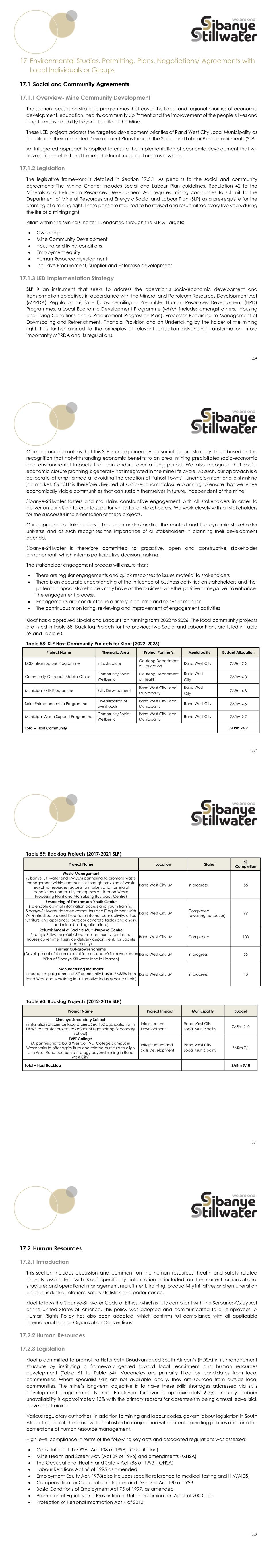 149 17 Environmental Studies, Permitting, Plans, Negotiations/ Agreements with Local Individuals or Groups 17.1 Social and Community Agreements 17.1.1 Overview- Mine Community Development The section focuses on strategic programmes that cover the Local and regional priorities of economic development, education, health, community upliftment and the improvement of the people’s lives and long-term sustainability beyond the life of the Mine. These LED projects address the targeted development priorities of Rand West City Local Municipality as identified in their Integrated Development Plans through the Social and Labour Plan commitments (SLP). An integrated approach is applied to ensure the implementation of economic development that will have a ripple effect and benefit the local municipal area as a whole. 17.1.2 Legislation The legislative framework is detailed in Section 17.5.1. As pertains to the social and community agreements The Mining Charter includes Social and Labour Plan guidelines. Regulation 42 to the Minerals and Petroleum Resources Development Act requires mining companies to submit to the Department of Mineral Resources and Energy a Social and Labour Plan (SLP) as a pre-requisite for the granting of a mining right. These pans are required to be revised and resubmitted every five years during the life of a mining right. Pillars within the Mining Charter III, endorsed through the SLP & Targets:  Ownership  Mine Community Development  Housing and living conditions  Employment equity  Human Resource development  Inclusive Procurement, Supplier and Enterprise development 17.1.3 LED Implementation Strategy SLP is an instrument that seeks to address the operation’s socio-economic development and transformation objectives in accordance with the Mineral and Petroleum Resources Development Act (MPRDA) Regulation 46 (a – f), by detailing a Preamble, Human Resources Development (HRD) Programmes, a Local Economic Development Programme (which includes amongst others, Housing and Living Conditions and a Procurement Progression Plan), Processes Pertaining to Management of Downscaling and Retrenchment, Financial Provision and an Undertaking by the holder of the mining right. It is further aligned to the principles of relevant legislation advancing transformation, more importantly MPRDA and its regulations. 150 Of importance to note is that this SLP is underpinned by our social closure strategy. This is based on the recognition that notwithstanding economic benefits to an area, mining precipitates socio-economic and environmental impacts that can endure over a long period. We also recognise that socio- economic closure planning is generally not integrated in the mine life cycle. As such, our approach is a deliberate attempt aimed at avoiding the creation of “ghost towns”, unemployment and a shrinking job market. Our SLP is therefore directed at socio-economic closure planning to ensure that we leave economically viable communities that can sustain themselves in future, independent of the mine. Sibanye-Stillwater fosters and maintains constructive engagement with all stakeholders in order to deliver on our vision to create superior value for all stakeholders. We work closely with all stakeholders for the successful implementation of these projects. Our approach to stakeholders is based on understanding the context and the dynamic stakeholder universe and as such recognises the importance of all stakeholders in planning their development agenda. Sibanye-Stillwater is therefore committed to proactive, open and constructive stakeholder engagement, which informs participative decision-making. The stakeholder engagement process will ensure that:  There are regular engagements and quick responses to issues material to stakeholders  There is an accurate understanding of the influence of business activities on stakeholders and the potential impact stakeholders may have on the business, whether positive or negative, to enhance the engagement process.  Engagements are conducted in a timely, accurate and relevant manner  The continuous monitoring, reviewing and improvement of engagement activities Kloof has a approved Slocial and Labour Plan running form 2022 to 2026. The local community projects are listed in Table 58. Back log Projects for the previous two Social and Labour Plans are listed in Table 59 and Table 60. Table 58: SLP Host Community Projects for Kloof (2022-2026) Project Name Thematic Area Project Partner/s Municipality Budget Allocation ECD Infrastructure Programme Infrastructure Gauteng Department of Education Rand West City ZARm 7.2 Community Outreach Mobile Clinics Community Social Wellbeing Gauteng Department of Health Rand West City ZARm 4.8 Municipal Skills Programme Skills Development Rand West City Local Municipality Rand West City ZARm 4.8 Solar Entrepreneurship Programme Diversification of Livelihoods Rand West City Local Municipality Rand West City ZARm 4.6 Municipal Waste Support Programme Community Social Wellbeing Rand West City Local Municipality Rand West City ZARm 2.7 Total – Host Community ZARm 24.2 151 Table 59: Backlog Projects (2017-2021 SLP) Project Name Location Status % Completion Waste Management (Sibanye_Stillwater and RWCLM partnering to promote waste management within communities through provision of waste recycling resources, access to market, and training of beneficiary community enterprises at Libanon Waste Processing Plant and Mohlakeng Buy-back Centre) Rand West City LM In progress 55 Resourcing of Toekomsrus Youth Centre (To enable optimal information access and youth training, Sibanye-Stillwater donated computers and IT equipment with Wi-Fi infrastructure and fixed-term internet connectivity, office furniture and appliances, outdoor concrete tables and chairs, and minor building alterations) Rand West City LM Completed (awaiting handover) 99 Refurbishment of Badirile Multi-Purpose Centre (Sibanye-Stillwater refurbi