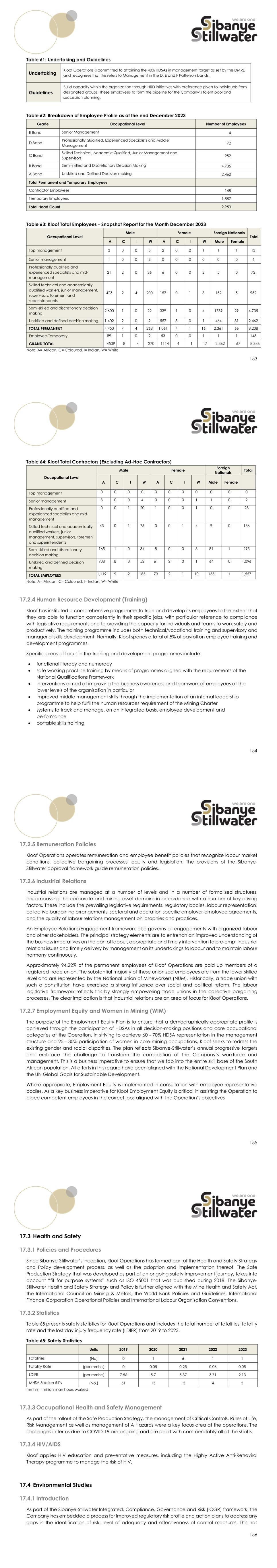 153 Table 61: Undertaking and Guidelines Table 62: Breakdown of Employee Profile as at the end December 2023 Grade Occupational Level Number of Employees E Band Senior Management 4 D Band Professionally Qualified, Experienced Specialists and Middle Management 72 C Band Skilled Technical, Academic Qualified, Junior Management and Supervisors 952 B Band Semi-Skilled and Discretionary Decision Making 4,735 A Band Unskilled and Defined Decision making 2,462 Total Permanent and Temporary Employees Contractor Employees 148 Temporary Employees 1,557 Total Head Count 9,953 Table 63: Kloof Total Employees - Snapshot Report for the Month December 2023 Occupational Level Male Female Foreign Nationals Total A C I W A C I W Male Female Top management 3 0 0 5 2 0 0 1 1 1 13 Senior management 1 0 0 3 0 0 0 0 0 0 4 Professionally qualified and experienced specialists and mid- management 21 2 0 36 6 0 0 2 5 0 72 Skilled technical and academically qualified workers, junior management, supervisors, foremen, and superintendents 423 2 4 200 157 0 1 8 152 5 952 Semi-skilled and discretionary decision making 2,600 1 0 22 339 1 0 4 1739 29 4,735 Unskilled and defined decision making 1,402 2 0 2 557 3 0 1 464 31 2,462 TOTAL PERMANENT 4,450 7 4 268 1,061 4 1 16 2,361 66 8,238 Employee-Temporary 89 1 0 2 53 0 0 1 1 1 148 GRAND TOTAL 4539 8 4 270 1114 4 1 17 2,362 67 8,386 Note: A= African, C= Coloured, I= Indian, W= White. Undertaking Kloof Operations is committed to attaining the 40% HDSAs in management target as set by the DMRE and recognizes that this refers to Management in the D, E and F Patterson bands. Guidelines Build capacity within the organization through HRD initiatives with preference given to individuals from designated groups. These employees to form the pipeline for the Company’s talent pool and succession planning. 154 Table 64: Kloof Total Contractors (Excluding Ad-Hoc Contractors) Occupational Level Male Female Foreign Nationals Total A C I W A C I W Male Female Top management 0 0 0 0 0 0 0 0 0 0 0 Senior management 3 0 0 4 0 0 0 1 1 0 9 Professionally qualified and experienced specialists and mid- management 0 0 1 20 1 0 0 1 0 0 23 Skilled technical and academically qualified workers, junior management, supervisors, foremen, and superintendents 43 0 1 75 3 0 1 4 9 0 136 Semi-skilled and discretionary decision making 165 1 0 34 8 0 0 3 81 1 293 Unskilled and defined decision making 908 8 0 52 61 2 0 1 64 0 1,096 TOTAL EMPLOYEES 1,119 9 2 185 73 2 1 10 155 1 1,557 Note: A= African, C= Coloured, I= Indian, W= White 17.2.4 Human Resource Development (Training) Kloof has instituted a comprehensive programme to train and develop its employees to the extent that they are able to function competently in their specific jobs, with particular reference to compliance with legislative requirements and to providing the capacity for individuals and teams to work safely and productively. The training programme includes both technical/vocational training and supervisory and managerial skills development. Normally, Kloof spends a total of 5% of payroll on employee training and development programmes. Specific areas of focus in the training and development programmes include:  functional literacy and numeracy  safe working practice training by means of programmes aligned with the requirements of the National Qualifications Framework  interventions aimed at improving the business awareness and teamwork of employees at the lower levels of the organisation in particular  improved middle management skills through the implementation of an internal leadership programme to help fulfil the human resources requirement of the Mining Charter  systems to track and manage, on an integrated basis, employee development and performance  portable skills training 155 17.2.5 Remuneration Policies Kloof Operations operates remuneration and employee benefit policies that recognize labour market conditions, collective bargaining processes, equity and legislation. The provisions of the Sibanye- Stillwater approval framework guide remuneration policies. 17.2.6 Industrial Relations Industrial relations are managed at a number of levels and in a number of formalized structures, encompassing the corporate and mining asset domains in accordance with a number of key driving factors. These include the prevailing legislative requirements, regulatory bodies, labour representation, collective bargaining arrangements, sectoral and operation specific employer-employee agreements, and the quality of labour relations management philosophies and practices. An Employee Relations/Engagement framework also governs all engagements with organized labour and other stakeholders. The principal strategy elements are to entrench an improved understanding of the business imperatives on the part of labour, appropriate and timely intervention to pre-empt industrial relations issues and timely delivery by management on its undertakings to labour and to maintain labour harmony continuously. Approximately 94.22% of the permanent employees of Kloof Operations are paid up members of a registered trade union. The substantial majority of these unionized employees are from the lower skilled level and are represented by the National Union of Mineworkers (NUM). Historically, a trade union with such a constitution have exercised a strong influence over social and political reform. The labour legislative framework reflects this by strongly empowering trade unions in the collective bargaining processes. The clear implication is that industrial relations are an area of focus for Kloof Operations. 17.2.7 Employment Equity and Women in Mining (WIM) The purpose of the Employment Equity Plan is to ensure that a demographically appropriate profile is achieved through the participation of HDSAs in all decision-making positions and core occupational categories at the Operation. In striving to achieve 60 - 70% HDSA representation in the management structure and 25 