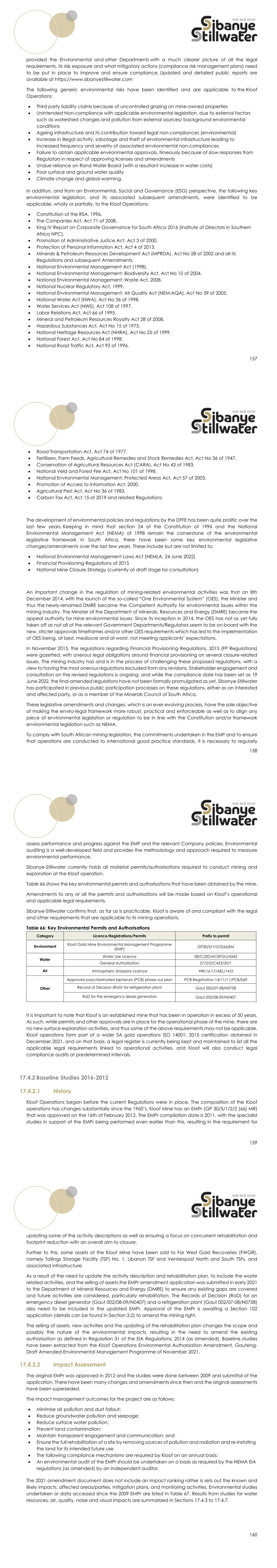 157 provided the Environmental and other Departments with a much clearer picture of all the legal requirements, its risk exposure and what mitigatory actions (compliance risk management plans) need to be put in place to improve and ensure compliance. Updated and detailed public reports are available at https://www.sibanyestillwater.com The following generic environmental risks have been identified and are applicable to the Kloof Operations:  Third party liability claims because of uncontrolled grazing on mine-owned properties  Unintended Non-compliance with applicable environmental legislation, due to external factors such as watershed changes and pollution from external sources/ background environmental conditions  Ageing infrastructure and its contribution toward legal non-compliances (environmental)  Increase in illegal activity, sabotage and theft of environmental infrastructure leading to increased frequency and severity of associated environmental non-compliances  Failure to obtain applicable environmental approvals, timeously because of slow responses from Regulators in respect of approving licenses and amendments  Undue reliance on Rand Water Board (with a resultant increase in water costs)  Poor surface and ground water quality  Climate change and global warming. In addition, and from an Environmental, Social and Governance (ESG) perspective, the following key environmental legislation, and its associated subsequent amendments, were identified to be applicable, wholly or partially, to the Kloof Operations:  Constitution of the RSA, 1996.  The Companies Act, Act 71 of 2008.  King IV Report on Corporate Governance for South Africa 2016 (Institute of Directors in Southern Africa NPC).  Promotion of Administrative Justice Act, Act 3 of 2000.  Protection of Personal Information Act, Act 4 of 2013.  Minerals & Petroleum Resources Development Act (MPRDA), Act No 28 of 2002 and all its Regulations and subsequent Amendments.  National Environmental Management Act (1998).  National Environmental Management: Biodiversity Act, Act No 10 of 2004.  National Environmental Management: Waste Act, 2008.  National Nuclear Regulatory Act, 1999.  National Environmental Management: Air Quality Act (NEM:AQA), Act No 39 of 2005.  National Water Act (NWA), Act No 36 of 1998.  Water Services Act (NWS), Act 108 of 1997.  Labor Relations Act, Act 66 of 1995.  Mineral and Petroleum Resources Royalty Act 28 of 2008.  Hazardous Substances Act, Act No 15 of 1973.  National Heritage Resources Act (NHRA), Act No 25 of 1999.  National Forest Act, Act No 84 of 1998.  National Road Traffic Act, Act 93 of 1996. 158  Road Transportation Act, Act 74 of 1977.  Fertilizers, Farm Feeds, Agricultural Remedies and Stock Remedies Act, Act No 36 of 1947.  Conservation of Agricultural Resources Act (CARA), Act No 43 of 1983.  National Veld and Forest Fire Act, Act No 101 of 1998.  National Environmental Management: Protected Areas Act, Act 57 of 2003.  Promotion of Access to Information Act, 2000.  Agricultural Pest Act, Act No 36 of 1983.  Carbon Tax Act, Act 15 of 2019 and related Regulations The development of environmental policies and regulations by the DFFE has been quite prolific over the last few years. Keeping in mind that section 24 of the Constitution of 1996 and the National Environmental Management Act (NEMA) of 1998 remain the cornerstone of the environmental legislative framework in South Africa, there have been some key environmental legislative changes/amendments over the last few years. These include but are not limited to:  National Environmental Management Laws Act (NEMLA, 24 June 2022)  Financial Provisioning Regulations of 2015  National Mine Closure Strategy (currently at draft stage for consultation) An important change in the regulation of mining-related environmental activities was that on 8th December 2014, with the launch of the so-called “One Environmental System” (OES), the Minister and thus the newly-renamed DMRE became the Competent Authority for environmental issues within the mining industry. The Minister of the Department of Minerals, Resources and Energy (DMRE) became the appeal authority for mine environmental issues. Since its inception in 2014, the OES has not as yet fully taken off as not all of the relevant Government Departments/Regulators seem to be on-board with the new, stricter approvals timeframes and/or other OES requirements which has led to the implementation of OES being, at best, mediocre and at worst, not meeting applicants’ expectations. In November 2015, the regulations regarding Financial Provisioning Regulations, 2015 (FP Regulations) were gazetted, with onerous legal obligations around financial provisioning on several closure-related issues. The mining industry has and is in the process of challenging these proposed regulations, with a view to having the most onerous regulations excluded from any revisions. Stakeholder engagement and consultation on the revised regulations is ongoing, and while the compliance date has been set as 19 June 2022, the final amended regulations have not been formally promulgated as yet. Sibanye-Stillwater has participated in previous public participation processes on these regulations, either as an interested and affected party, or as a member of the Minerals Council of South Africa. These legislative amendments and changes, which is an ever-evolving process, have the sole objective of making the enviro-legal framework more robust, practical and enforceable as well as to align any piece of environmental legislation or regulation to be in line with the Constitution and/or framework environmental legislation such as NEMA. To comply with South African mining legislation, the commitments undertaken in the EMP and to ensure that operations are conducted to international good practice standards, it is necessary to regularly 159