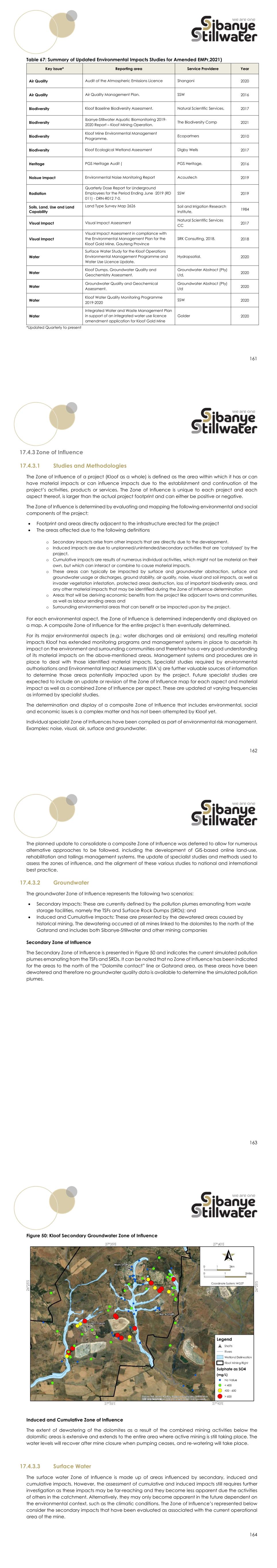 161 Table 67: Summary of Updated Environmental Impacts Studies for Amended EMPr,2021) Key Issue* Reporting area Service Providere Year Air Quality Audit of the Atmospheric Emissions Licence Shangoni 2020 Air Quality Air Quality Management Plan. SSW 2016 Biodiversity Kloof Baseline Biodiversity Assessment. Natural Scientific Services, 2017 Biodiversity ibanye-Stillwater Aquatic Biomonitoring 2019- 2020 Report – Kloof Mining Operation. The Biodiversity Comp 2021 Biodiversity Kloof Mine Environmental Management Programme. Ecopartners 2010 Biodiversity Kloof Ecological Wetland Assessment Digby Wells 2017 Heritage PGS Heritage Audit ( PGS Heritage, 2016 Noisue Impact Environmental Noise Monitoring Report Acoustech 2019 Radiation Quarterly Dose Report for Underground Employees for the Period Ending June ·2019 (RD 011) - DRN-R012 7-0. SSW 2019 Soils, Land, Use and Land Capability Land Type Survey Map 2626 Soil and Irrigation Research Institute, 1984 Visual Impact Visual Impact Assessment Natural Scientific Services CC 2017 Visual Impact Visual Impact Assessment in compliance with the Environmental Management Plan for the Kloof Gold Mine, Gauteng Province SRK Consulting, 2018. 2018 Water Surface Water Study for the Kloof Operations Environmental Management Programme and Water Use Licence Update. Hydropsatial. 2020 Water Kloof Dumps. Groundwater Quality and Geochemistry Assessment. Groundwater Abstract (Pty) Ltd, 2020 Water Groundwater Quality and Geochemical Assessment. Groundwater Abstract (Pty) Ltd 2020 Water Kloof Water Quality Monitoring Programme 2019-2020 SSW 2020 Water Integrated Water and Waste Management Plan in support of an integrated water use licence amendment application for Kloof Gold Mine Golder 2020 *Updated Quarterly to present 162 17.4.3 Zone of Influence 17.4.3.1 Studies and Methodologies The Zone of Influence of a project (Kloof as a whole) is defined as the area within which it has or can have material impacts or can influence impacts due to the establishment and continuation of the project’s activities, products or services. The Zone of Influence is unique to each project and each aspect thereof, is larger than the actual project footprint and can either be positive or negative. The Zone of Influence is determined by evaluating and mapping the following environmental and social components of the project:  Footprint and areas directly adjacent to the infrastructure erected for the project  The areas affected due to the following definitions o Secondary impacts arise from other impacts that are directly due to the development. o Induced impacts are due to unplanned/unintended/secondary activities that are ‘catalysed’ by the project. o Cumulative impacts are results of numerous individual activities, which might not be material on their own, but which can interact or combine to cause material impacts. o These areas can typically be impacted by surface and groundwater abstraction, surface and groundwater usage or discharges, ground stability, air quality, noise, visual and soil impacts, as well as invader vegetation infestation, protected areas destruction, loss of important biodiversity areas, and any other material impacts that may be identified during the Zone of Influence determination o Areas that will be deriving economic benefits from the project like adjacent towns and communities, as well as labour sending areas and o Surrounding environmental areas that can benefit or be impacted upon by the project. For each environmental aspect, the Zone of Influence is determined independently and displayed on a map. A composite Zone of Influence for the entire project is then eventually determined. For its major environmental aspects (e.g.: water discharges and air emissions) and resulting material impacts Kloof has extended monitoring programs and management systems in place to ascertain its impact on the environment and surrounding communities and therefore has a very good understanding of its material impacts on the above-mentioned areas. Management systems and procedures are in place to deal with those identified material impacts. Specialist studies required by environmental authorisations and Environmental Impact Assessments (EIA’s) are further valuable sources of information to determine those areas potentially impacted upon by the project. Future specialist studies are expected to include an update or revision of the Zone of Influence map for each aspect and material impact as well as a combined Zone of Influence per aspect. These are updated at varying frequencies as informed by specialist studies. The determination and display of a composite Zone of Influence that includes environmental, social and economic issues is a complex matter and has not been attempted by Kloof yet. Individual specialist Zone of Influences have been compiled as part of environmental risk management. Examples: noise, visual, air, surface and groundwater. 163 The planned update to consolidate a composite Zone of Influence was deferred to allow for numerous alternative approaches to be followed, including the development of GIS-based online land-use, rehabilitation and tailings management systems, the update of specialist studies and methods used to assess the zones of influence, and the alignment of these various studies to national and international best practice. 17.4.3.2 Groundwater The groundwater Zone of Influence represents the following two scenarios:  Secondary Impacts: These are currently defined by the pollution plumes emanating from waste storage facilities, namely the TSFs and Surface Rock Dumps (SRDs); and  Induced and Cumulative Impacts: These are presented by the dewatered areas caused by historical mining. The dewatering occurred at all mines linked to the dolomites to the north of the Gatsrand and includes both Sibanye-Stillwater and other mining companies Secondary Zone of Influence The Secondary Zone of Influence is presented in Figure 50 and indicates the 