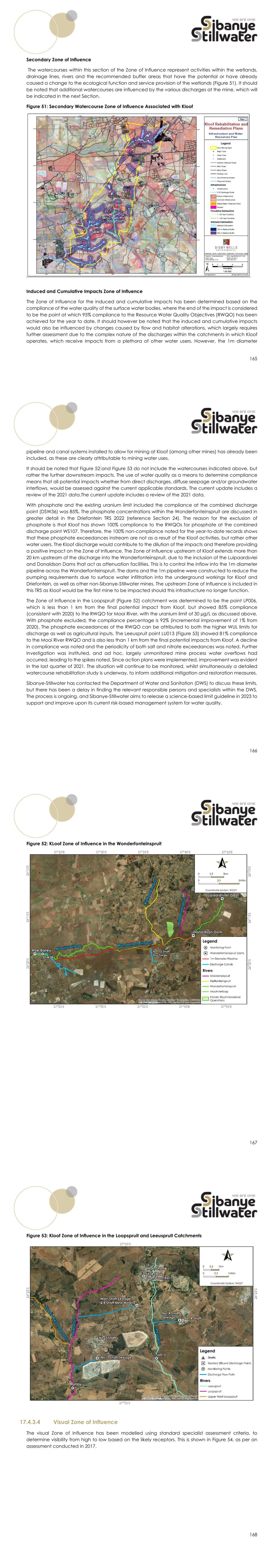 165 Secondary Zone of Influence The watercourses within this section of the Zone of Influence represent activities within the wetlands, drainage lines, rivers and the recommended buffer areas that have the potential or have already caused a change to the ecological function and service provision of the wetlands (Figure 51). It should be noted that additional watercourses are influenced by the various discharges at the mine, which will be indicated in the next Section. Figure 51: Secondary Watercourse Zone of Influence Associated with Kloof Induced and Cumulative Impacts Zone of Influence The Zone of Influence for the induced and cumulative impacts has been determined based on the compliance of the water quality of the surface water bodies, where the end of the impact is considered to be the point at which 95% compliance to the Resource Water Quality Objectives (RWQO) has been achieved for the year to date. It should however be noted that the induced and cumulative impacts would also be influenced by changes caused by flow and habitat alterations, which largely requires further assessment due to the complex nature of the discharges within the catchments in which Kloof operates, which receive impacts from a plethora of other water users. However, the 1m diameter 166 pipeline and canal systems installed to allow for mining at Kloof (among other mines) has already been included, as these are clearly attributable to mining water uses. It should be noted that Figure 52 and Figure 53 do not include the watercourses indicated above, but rather the further downstream impacts. The use of water quality as a means to determine compliance means that all potential impacts whether from direct discharges, diffuse seepage and/or groundwater interflows, would be assessed against the current applicable standards. The current update includes a review of the 2021 data.The current update includes a review of the 2021 data. With phosphate and the existing uranium limit included the compliance at the combined discharge point (DSW36) was 85%. The phosphate concentrations within the Wonderfonteinspruit are discussed in greater detail in the Driefontein TRS 2022 (reference Section 24). The reason for the exclusion of phosphate is that Kloof has shown 100% compliance to the RWQOs for phosphate at the combined discharge point WS107. Therefore, the 100% non-compliance noted for the year-to-date records shows that these phosphate exceedances instream are not as a result of the Kloof activities, but rather other water users. The Kloof discharge would contribute to the dilution of the impacts and therefore providing a positive impact on the Zone of Influence. The Zone of Influence upstream of Kloof extends more than 20 km upstream of the discharge into the Wonderfonteinspruit, due to the inclusion of the Luipaardsvlei and Donaldson Dams that act as attenuation facilities. This is to control the inflow into the 1m diameter pipeline across the Wonderfonteinspruit. The dams and the 1m pipeline were constructed to reduce the pumping requirements due to surface water infiltration into the underground workings for Kloof and Driefontein, as well as other non-Sibanye-Stillwater mines. The upstream Zone of Influence is included in this TRS as Kloof would be the first mine to be impacted should this infrastructure no longer function. The Zone of Influence in the Loopspruit (Figure 52) catchment was determined to be the point LP006, which is less than 1 km from the final potential impact from Kloof, but showed 85% compliance (consistent with 2020) to the RWQO for Mooi River, with the uranium limit of 30 µg/L as discussed above. With phosphate excluded, the compliance percentage is 92% (incremental improvement of 1% from 2020). The phosphate exceedances of the RWQO can be attributed to both the higher WUL limits for discharge as well as agricultural inputs. The Leeuspruit point LU013 (Figure 53) showed 81% compliance to the Mooi River RWQO and is also less than 1 km from the final potential impacts from Kloof. A decline in compliance was noted and the periodicity of both salt and nitrate exceedances was noted. Further investigation was instituted, and ad hoc, largely unmonitored mine process water overflows had occurred, leading to the spikes noted. Since action plans were implemented, improvement was evident in the last quarter of 2021. The situation will continue to be monitored, whilst simultaneously a detailed watercourse rehabilitation study is underway, to inform additional mitigation and restoration measures. Sibanye-Stillwater has contacted the Department of Water and Sanitation (DWS) to discuss these limits, but there has been a delay in finding the relevant responsible persons and specialists within the DWS. The process is ongoing, and Sibanye-Stillwater aims to release a science-based limit guideline in 2023 to support and improve upon its current risk-based management system for water quality. 167 Figure 52: KLoof Zone of Influence in the Wonderfonteinspruit 168 Figure 53: Kloof Zone of Influence in the Loopspruit and Leeuspruit Catchments 17.4.3.4 Visual Zone of Influence The visual Zone of Influence has been modelled using standard specialist assessment criteria, to determine visibility from high to low based on the likely receptors. This is shown in Figure 54, as per an assessment conducted in 2017.