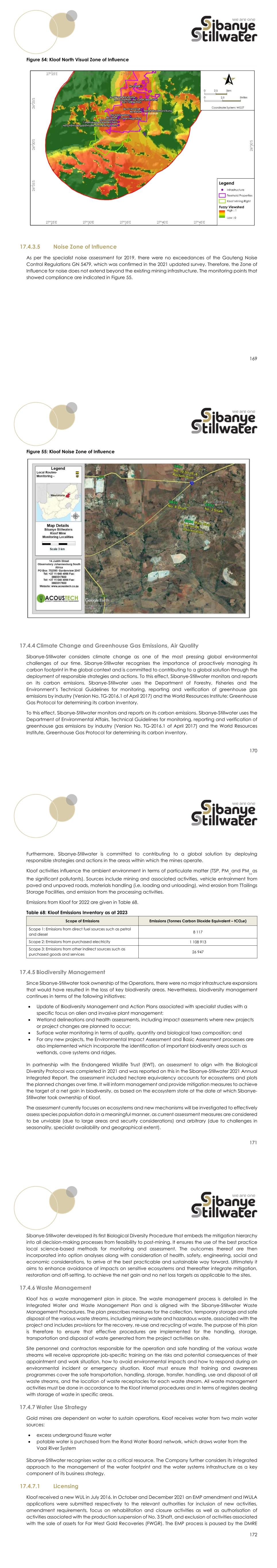 169 Figure 54: Kloof North Visual Zone of Influence 17.4.3.5 Noise Zone of Influence As per the specialist noise assessment for 2019, there were no exceedances of the Gauteng Noise Control Regulations GN 5479, which was confirmed in the 2021 updated survey. Therefore, the Zone of Influence for noise does not extend beyond the existing mining infrastructure. The monitoring points that showed compliance are indicated in Figure 55. 170 Figure 55: Kloof Noise Zone of Influence 17.4.4 Climate Change and Greenhouse Gas Emissions, Air Quality Sibanye-Stillwater considers climate change as one of the most pressing global environmental challenges of our time. Sibanye-Stillwater recognises the importance of proactively managing its carbon footprint in the global context and is committed to contributing to a global solution through the deployment of responsible strategies and actions. To this effect, Sibanye-Stillwater monitors and reports on its carbon emissions. Sibanye-Stillwater uses the Department of Forestry, Fisheries and the Environment’s Technical Guidelines for monitoring, reporting and verification of greenhouse gas emissions by industry (Version No. TG-2016.1 of April 2017) and the World Resources Institute: Greenhouse Gas Protocol for determining its carbon inventory. To this effect, Sibanye-Stillwater monitors and reports on its carbon emissions. Sibanye-Stillwater uses the Department of Environmental Affairs, Technical Guidelines for monitoring, reporting and verification of greenhouse gas emissions by industry (Version No. TG-2016.1 of April 2017) and the World Resources Institute, Greenhouse Gas Protocol for determining its carbon inventory. 171 Furthermore, Sibanye-Stillwater is committed to contributing to a global solution by deploying responsible strategies and actions in the areas within which the mines operate. Kloof activities influence the ambient environment in terms of particulate matter (TSP, PM 10 and PM 2.5 as the significant pollutants). Sources include mining and associated activities, vehicle entrainment from paved and unpaved roads, materials handling (i.e. loading and unloading), wind erosion from TTailings Storage Facilities, and emission from the processing activities. Emissions from Kloof for 2022 are given in Table 68. Table 68: Kloof Emissions Inventory as at 2023 Scope of Emissions Emissions (Tonnes Carbon Dioxide Equivalent – tCO2e) Scope 1: Emissions from direct fuel sources such as petrol and diesel 8 117 Scope 2: Emissions from purchased electricity 1 108 913 Scope 3: Emissions from other indirect sources such as purchased goods and services 26 947 17.4.5 Biodiversity Management Since Sibanye-Stillwater took ownership of the Operations, there were no major infrastructure expansions that would have resulted in the loss of key biodiversity areas. Nevertheless, biodiversity management continues in terms of the following initiatives:  Update of Biodiversity Management and Action Plans associated with specialist studies with a specific focus on alien and invasive plant management;  Wetland delineations and health assessments, including impact assessments where new projects or project changes are planned to occur;  Surface water monitoring in terms of quality, quantity and biological taxa composition; and  For any new projects, the Environmental Impact Assessment and Basic Assessment processes are also implemented which incorporate the identification of important biodiversity areas such as wetlands, cave systems and ridges. In partnership with the Endangered Wildlife Trust (EWT), an assessment to align with the Biological Diversity Protocol was completed in 2021 and was reported on this in the Sibanye-Stillwater 2021 Annual Integrated Report. The assessment included hectare equivalency accounts for ecosystems and plots the planned changes over time. It will inform management and provide mitigation measures to achieve the target of a net gain in biodiversity, as based on the ecosystem state at the date at which Sibanye- Stillwater took ownership of Kloof. The assessment currently focuses on ecosystems and new mechanisms will be investigated to effectively assess species population data in a meaningful manner, as current assessment measures are considered to be unviable (due to large areas and security considerations) and arbitrary (due to challenges in seasonality, specialist availability and geographical extent). 172 Sibanye-Stillwater developed its first Biological Diversity Procedure that embeds the mitigation hierarchy into all decision-making processes from feasibility to post-mining. It ensures the use of the best practice local science-based methods for monitoring and assessment. The outcomes thereof are then incorporated into option analyses along with consideration of health, safety, engineering, social and economic considerations, to arrive at the best practicable and sustainable way forward. Ultimately it aims to enhance avoidance of impacts on sensitive ecosystems and thereafter integrate mitigation, restoration and off-setting, to achieve the net gain and no net loss targets as applicable to the sites. 17.4.6 Waste Management Kloof has a waste management plan in place. The waste management process is detailed in the Integrated Water and Waste Management Plan and is aligned with the Sibanye-Stillwater Waste Management Procedures. The plan prescribes measures for the collection, temporary storage and safe disposal of the various waste streams, including mining waste and hazardous waste, associated with the project and includes provisions for the recovery, re-use and recycling of waste. The purpose of this plan is therefore to ensure that effective procedures are implemented for the handling, storage, transportation and disposal of waste generated from the project activities on site. Site personnel and contractors responsible for the operation and safe handling of the various waste streams will receive appropriate job-specific training