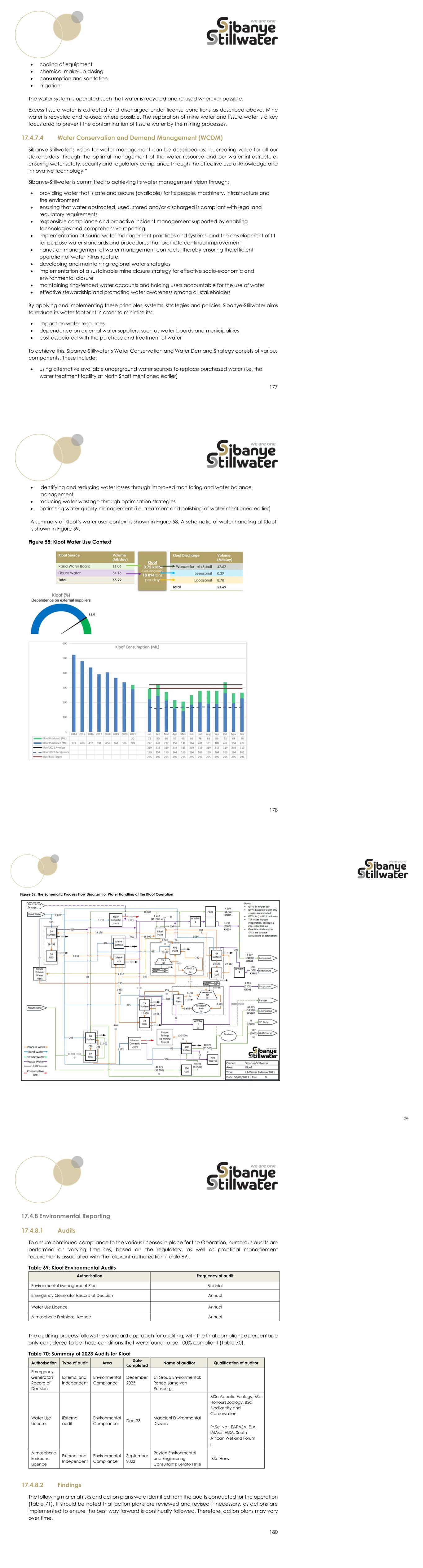 177  cooling of equipment  chemical make-up dosing  consumption and sanitation  irrigation The water system is operated such that water is recycled and re-used wherever possible. Excess fissure water is extracted and discharged under license conditions as described above. Mine water is recycled and re-used where possible. The separation of mine water and fissure water is a key focus area to prevent the contamination of fissure water by the mining processes. 17.4.7.4 Water Conservation and Demand Management (WCDM) Sibanye-Stillwater’s vision for water management can be described as: “…creating value for all our stakeholders through the optimal management of the water resource and our water infrastructure, ensuring water safety, security and regulatory compliance through the effective use of knowledge and innovative technology.” Sibanye-Stillwater is committed to achieving its water management vision through:  providing water that is safe and secure (available) for its people, machinery, infrastructure and the environment  ensuring that water abstracted, used, stored and/or discharged is compliant with legal and regulatory requirements  responsible compliance and proactive incident management supported by enabling technologies and comprehensive reporting  implementation of sound water management practices and systems, and the development of fit for purpose water standards and procedures that promote continual improvement  hands-on management of water management contracts, thereby ensuring the efficient operation of water infrastructure  developing and maintaining regional water strategies  implementation of a sustainable mine closure strategy for effective socio-economic and environmental closure  maintaining ring-fenced water accounts and holding users accountable for the use of water  effective stewardship and promoting water awareness among all stakeholders By applying and implementing these principles, systems, strategies and policies, Sibanye-Stillwater aims to reduce its water footprint in order to minimise its:  impact on water resources  dependence on external water suppliers, such as water boards and municipalities  cost associated with the purchase and treatment of water To achieve this, Sibanye-Stillwater’s Water Conservation and Water Demand Strategy consists of various components. These include:  using alternative available underground water sources to replace purchased water (i.e. the water treatment facility at North Shaft mentioned earlier) 178  Identifying and reducing water losses through improved monitoring and water balance management  reducing water wastage through optimisation strategies  optimising water quality management (i.e. treatment and polishing of water mentioned earlier) A summary of Kloof’s water user context is shown in Figure 58. A schematic of water handling at Kloof is shown in Figure 59. Figure 58: Kloof Water Use Context 179 Figure 59: The Schematic Process Flow Diagram for Water Handling at the Kloof Operation 180 17.4.8 Environmental Reporting 17.4.8.1 Audits To ensure continued compliance to the various licenses in place for the Operation, numerous audits are performed on varying timelines, based on the regulatory, as well as practical management requirements associated with the relevant authorization (Table 69). Table 69: Kloof Environmental Audits Authorisation Frequency of audit Environmental Management Plan Biennial Emergency Generator Record of Decision Annual Water Use Licence Annual Atmospheric Emissions Licence Annual The auditing process follows the standard approach for auditing, with the final compliance percentage only considered to be those conditions that were found to be 100% compliant (Table 70). Table 70: Summary of 2023 Audits for Kloof Authorisation Type of audit Area Date completed Name of auditor Qualification of auditor Emergency Generators Record of Decision External and independent Environmental Compliance December 2023 Ci Group Environmental: Renee Janse van Rensburg Water Use License IExternal audit Environmental Compliance Dec-23 Madeleni Environmental Division MSc Aquatic Ecology, BSc Honours Zoology, BSc Biodiversity and Conservation Pr.Sci.Nat, EAPASA, ELA, IAIAsa, ESSA, South African Wetland Forum I Atmospheric Emissions Licence External and Independent Environmental Compliance September 2023 Rayten Environmental and Engineering Consultants: Lerato Tshisi BSc Hons 17.4.8.2 Findings The following material risks and action plans were identified from the audits conducted for the operation (Table 71). It should be noted that action plans are reviewed and revised if necessary, as actions are implemented to ensure the best way forward is continually followed. Therefore, action plans may vary over time.