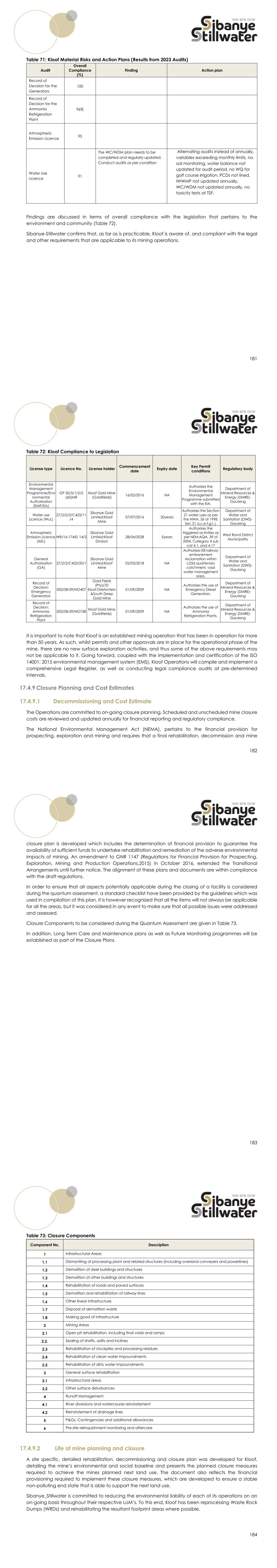 181 Table 71: Kloof Material Risks and Action Plans (Results from 2023 Audits) Audit Overall Compliance (%) Finding Action plan Record of Decision for the Generators 100 Record of Decision for the Ammonia Refrigeration Plant 96% Atmospheric Emission Licence 95 Water Use Licence 91 The WC/WDM plan needs to be completed and regularly updated. Conduct audits as per condition Alternating audits instead of annually, variables exceeding monthly limits, no soil monitoring, water balance not updated for audit period, no WQ for golf course irrigation, PCDs not lined, IWWMP not updated annually, WC/WDM not updated annually, no toxicity tests at TSF. Findings are discussed in terms of overall compliance with the legislation that pertains to the environment and community (Table 72). Sibanye-Stillwater confirms that, as far as is practicable, Kloof is aware of, and compliant with the legal and other requirements that are applicable to its mining operations. 182 Table 72: Kloof Compliance to Legislation License type Licence No. License holder Commencement date Expiry date Key Permit conditions Regulatory body Environmental Management Programme/Envi ronmental Authorisation (EMP/EA) GP 30/5/1/2/2 (60)MR Kloof Gold Mine (Goldfields) 16/02/2016 NA Authorizes the Environmental Management Programme submitted with the EIA. Department of Mineral Resources & Energy (DMRE)- Gauteng Water use Licence (WuL) 27/2/2/2/C423/11 /4 Sibanye Gold Limited:Kloof Mine 07/07/2016 20years Authorizes the Section 21 water uses as per the NWA, 36 of 1998. Sec 21 a,c,e,f,g,I, j. Department of Water and Sanitation (DWS)- Gauteng Atmospheric Emission Licence (AEL) WR/16-17AEL 14/2 Sibanye Gold Limited:Kloof Division 28/04/2028 5years Authorizes the triggered activities as per NEM:AQA, 39 of 2004. Category 4 sub cat 4.1, and 4.17 West Rand District Municipality General Authorisation (GA) 27/2/2/C423/20/1 Sibanye Gold Limited:Kloof Mine 02/03/2018 NA Authorizes K8 railway embankment reclamation within c23d quartenary catchment, vaal water management area. Department of Water and Sanitation (DWS)- Gauteng Record of Decision: Emergency Generators 002/08-09/NO407 Gold Fields (Pty)LTD Kloof,Driefontein &South Deep Gold Mine 01/09/2009 NA Authorizes the use of Emergency Diesel Generators. Department of Mineral Resources & Energy (DMRE)- Gauteng Record of Decision: Ammonia Refrigeration Plant 002/08-09/NO758 Kloof Gold Mine (Goldfields) 01/09/2009 NA Authorizes the use of Ammonia Refrigeration Plants. Department of Mineral Resources & Energy (DMRE)- Gauteng It is important to note that Kloof is an established mining operation that has been in operation for more than 50 years. As such, whilst permits and other approvals are in place for the operational phase of the mine, there are no new surface exploration activities, and thus some of the above requirements may not be applicable to it. Going forward, coupled with the implementation and certification of the ISO 14001: 2015 environmental management system (EMS), Kloof Operations will compile and implement a comprehensive Legal Register, as well as conducting legal compliance audits at pre-determined intervals. 17.4.9 Closure Planning and Cost Estimates 17.4.9.1 Decommissioning and Cost Estimate The Operations are committed to on-going closure planning. Scheduled and unscheduled mine closure costs are reviewed and updated annually for financial reporting and regulatory compliance. The National Environmental Management Act (NEMA), pertains to the financial provision for prospecting, exploration and mining and requires that a final rehabilitation, decommission and mine 183 closure plan is developed which includes the determination of financial provision to guarantee the availability of sufficient funds to undertake rehabilitation and remediation of the adverse environmental impacts of mining. An amendment to GNR 1147 (Regulations for Financial Provision for Prospecting, Exploration, Mining and Production Operations,2015) in October 2016, extended the Transitional Arrangements until further notice. The alignment of these plans and documents are within compliance with the draft regulations. In order to ensure that all aspects potentially applicable during the closing of a facility is considered during the quantum assessment, a standard checklist have been provided by the guidelines which was used in compilation of this plan. It is however recognized that all the items will not always be applicable for all the areas, but it was considered in any event to make sure that all possible issues were addressed and assessed. Closure Components to be considered during the Quantum Assessment are given in Table 73. In addition, Long Term Care and Maintenance plans as well as Future Monitoring programmes will be established as part of the Closure Plans. 184 Table 73: Closure Components Component No. Description 1 Infrastructural Areas 1.1 Dismantling of processing plant and related structures (including overland conveyers and powerlines) 1.2 Demolition of steel buildings and structures 1.3 Demolition of other buildings and structures 1.4 Rehabilitation of roads and paved surfaces 1.5 Demolition and rehabilitation of railway lines 1.6 Other linear infrastructure 1.7 Disposal of demolition waste 1.8 Making good of infrastructure 2 Mining Areas 2.1 Open pit rehabilitation, including final voids and ramps 2.2. Sealing of shafts, adits and inclines 2.3 Rehabilitation of stockpiles and processing residues 2.4 Rehabilitation of clean water impoundments 2.5 Rehabilitation of dirty water impoundments 3 General surface rehabilitation 3.1 Infrastructural areas 3.2 Other surface disturbances 4 Runoff Management 4.1 River diversions and watercourse reinstatement 4.2 Reinstatement of drainage lines 5 P&Gs, Contingencies and additional allowances 6 Pre-site relinquishment monitoring and aftercare 17.4.9.2 Life of mine planning and closure A site specific, detailed rehabilitation, decommissioning and closure plan was develo