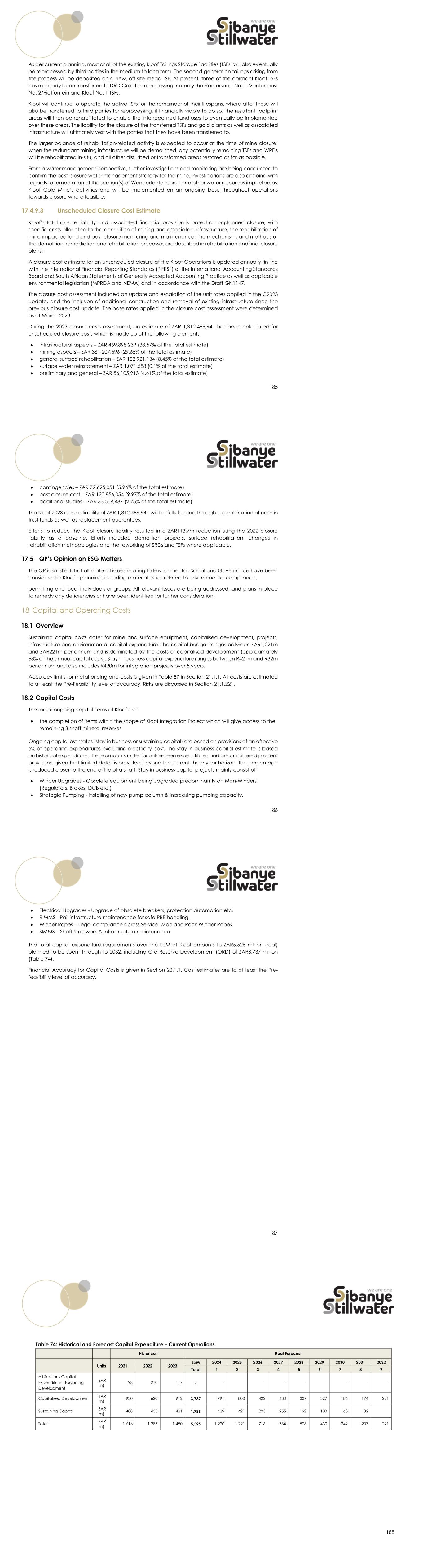 185 As per current planning, most or all of the existing Kloof Tailings Storage Facilities (TSFs) will also eventually be reprocessed by third parties in the medium-to long term. The second-generation tailings arising from the process will be deposited on a new, off-site mega-TSF. At present, three of the dormant Kloof TSFs have already been transferred to DRD Gold for reprocessing, namely the Venterspost No. 1, Venterspost No. 2/Rietfontein and Kloof No. 1 TSFs. Kloof will continue to operate the active TSFs for the remainder of their lifespans, where after these will also be transferred to third parties for reprocessing, if financially viable to do so. The resultant footprint areas will then be rehabilitated to enable the intended next land uses to eventually be implemented over these areas. The liability for the closure of the transferred TSFs and gold plants as well as associated infrastructure will ultimately vest with the parties that they have been transferred to. The larger balance of rehabilitation-related activity is expected to occur at the time of mine closure, when the redundant mining infrastructure will be demolished, any potentially remaining TSFs and WRDs will be rehabilitated in-situ, and all other disturbed or transformed areas restored as far as possible. From a water management perspective, further investigations and monitoring are being conducted to confirm the post-closure water management strategy for the mine. Investigations are also ongoing with regards to remediation of the section(s) of Wonderfonteinspruit and other water resources impacted by Kloof Gold Mine’s activities and will be implemented on an ongoing basis throughout operations towards closure where feasible. 17.4.9.3 Unscheduled Closure Cost Estimate Kloof’s total closure liability and associated financial provision is based on unplanned closure, with specific costs allocated to the demolition of mining and associated infrastructure, the rehabilitation of mine-impacted land and post-closure monitoring and maintenance. The mechanisms and methods of the demolition, remediation and rehabilitation processes are described in rehabilitation and final closure plans. A closure cost estimate for an unscheduled closure at the Kloof Operations is updated annually, in line with the International Financial Reporting Standards (“IFRS”) of the International Accounting Standards Board and South African Statements of Generally Accepted Accounting Practice as well as applicable environmental legislation (MPRDA and NEMA) and in accordance with the Draft GN1147. The closure cost assessment included an update and escalation of the unit rates applied in the C2023 update, and the inclusion of additional construction and removal of existing infrastructure since the previous closure cost update. The base rates applied in the closure cost assessment were determined as at March 2023. During the 2023 closure costs assessment, an estimate of ZAR 1,312,489,941 has been calculated for unscheduled closure costs which is made up of the following elements:  infrastructural aspects – ZAR 469,898,239 (38,57% of the total estimate)  mining aspects – ZAR 361,207,596 (29,65% of the total estimate)  general surface rehabilitation – ZAR 102,921,134 (8,45% of the total estimate)  surface water reinstatement – ZAR 1,071,588 (0.1% of the total estimate)  preliminary and general – ZAR 56,105,913 (4.61% of the total estimate) 186  contingencies – ZAR 72,625,051 (5.96% of the total estimate)  post closure cost – ZAR 120,856,054 (9,97% of the total estimate)  additional studies – ZAR 33,509,487 (2.75% of the total estimate) The Kloof 2023 closure liability of ZAR 1,312,489,941 will be fully funded through a combination of cash in trust funds as well as replacement guarantees. Efforts to reduce the Kloof closure liability resulted in a ZAR113.7m reduction using the 2022 closure liability as a baseline. Efforts included demolition projects, surface rehabilitation, changes in rehabilitation methodologies and the reworking of SRDs and TSFs where applicable. 17.5 QP’s Opinion on ESG Matters The QP is satisfied that all material issues relating to Environmental, Social and Governance have been considered in Kloof’s planning, including material issues related to environmental compliance, permitting and local individuals or groups. All relevant issues are being addressed, and plans in place to remedy any deficiencies or have been identified for further consideration. 18 Capital and Operating Costs 18.1 Overview Sustaining capital costs cater for mine and surface equipment, capitalised development, projects, infrastructure and environmental capital expenditure. The capital budget ranges between ZAR1,221m and ZAR221m per annum and is dominated by the costs of capitalised development (approximately 68% of the annual capital costs). Stay-in-business capital expenditure ranges between R421m and R32m per annum and also includes R420m for integration projects over 5 years. Accuracy limits for metal pricing and costs is given in Table 87 in Section 21.1.1. All costs are estimated to at least the Pre-Feasibility level of accuracy. Risks are discussed in Section 21.1.221. 18.2 Capital Costs The major ongoing capital items at Kloof are:  the completion of items within the scope of Kloof Integration Project which will give access to the remaining 3 shaft mineral reserves Ongoing capital estimates (stay in business or sustaining capital) are based on provisions of an effective 5% of operating expenditures excluding electricity cost. The stay-in-business capital estimate is based on historical expenditure. These amounts cater for unforeseen expenditures and are considered prudent provisions, given that limited detail is provided beyond the current three-year horizon. The percentage is reduced closer to the end of life of a shaft. Stay in business capital projects mainly consist of  Winder Upgrades - Obsolete equ