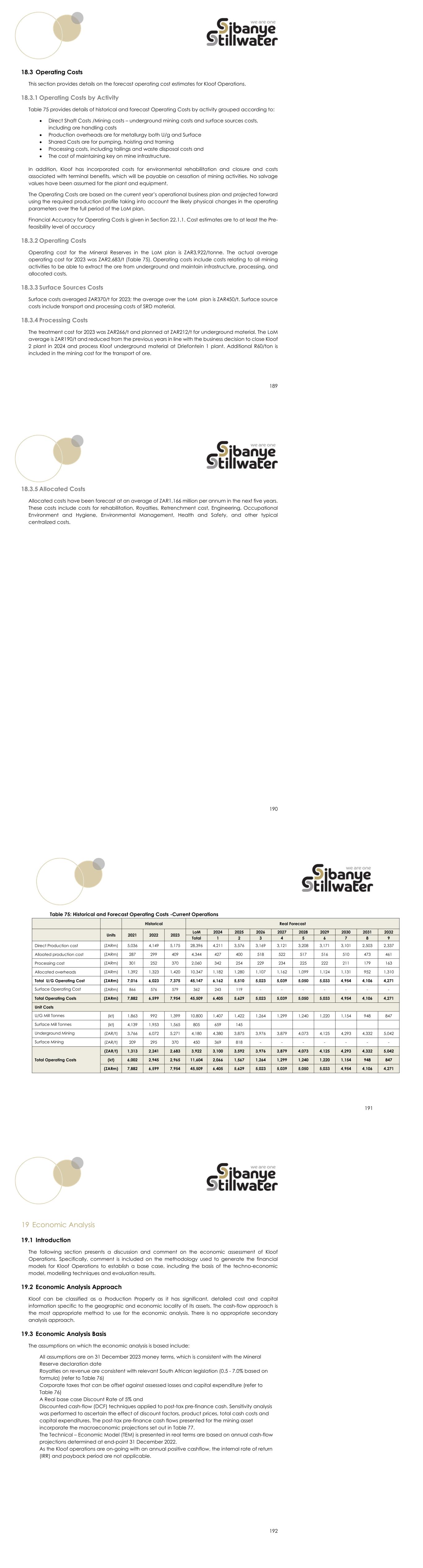 189 18.3 Operating Costs This section provides details on the forecast operating cost estimates for Kloof Operations. 18.3.1 Operating Costs by Activity Table 75 provides details of historical and forecast Operating Costs by activity grouped according to:  Direct Shaft Costs /Mining costs – underground mining costs and surface sources costs, including ore handling costs  Production overheads are for metallurgy both U/g and Surface  Shared Costs are for pumping, hoisting and traming  Processing costs, including tailings and waste disposal costs and  The cost of maintaining key on mine infrastructure. In addition, Kloof has incorporated costs for environmental rehabilitation and closure and costs associated with terminal benefits, which will be payable on cessation of mining activities. No salvage values have been assumed for the plant and equipment. The Operating Costs are based on the current year’s operational business plan and projected forward using the required production profile taking into account the likely physical changes in the operating parameters over the full period of the LoM plan. Financial Accuracy for Operating Costs is given in Section 22.1.1. Cost estimates are to at least the Pre- feasibility level of accuracy 18.3.2 Operating Costs Operating cost for the Mineral Reserves in the LoM plan is ZAR3,922/tonne. The actual average operating cost for 2023 was ZAR2,683/t (Table 75). Operating costs include costs relating to all mining activities to be able to extract the ore from underground and maintain infrastructure, processing, and allocated costs. 18.3.3 Surface Sources Costs Surface costs averaged ZAR370/t for 2023; the average over the LoM plan is ZAR450/t. Surface source costs include transport and processing costs of SRD material. 18.3.4 Processing Costs The treatment cost for 2023 was ZAR266/t and planned at ZAR212/t for underground material. The LoM average is ZAR190/t and reduced from the previous years in line with the business decision to close Kloof 2 plant in 2024 and process Kloof underground material at Driefontein 1 plant. Additional R60/ton is included in the mining cost for the transport of ore. 190 18.3.5 Allocated Costs Allocated costs have been forecast at an average of ZAR1,166 million per annum in the next five years. These costs include costs for rehabilitation, Royalties, Retrenchment cost, Engineering, Occupational Environment and Hygiene, Environmental Management, Health and Safety, and other typical centralized costs. 191 Table 75: Historical and Forecast Operating Costs -Current Operations Historical Real Forecast Units 2021 2022 2023 LoM 2024 2025 2026 2027 2028 2029 2030 2031 2032 Total 1 2 3 4 5 6 7 8 9 Direct Production cost (ZARm) 5,036 4,149 5,175 28,396 4,211 3,576 3,169 3,121 3,208 3,171 3,101 2,503 2,337 Alloated production cost (ZARm) 287 299 409 4,344 427 400 518 522 517 516 510 473 461 Processing cost (ZARm) 301 252 370 2,060 342 254 229 234 225 222 211 179 163 Allocated overheads (ZARm) 1,392 1,323 1,420 10,347 1,182 1,280 1,107 1,162 1,099 1,124 1,131 952 1,310 Total U/G Operating Cost (ZARm) 7,016 6,023 7,375 45,147 6,162 5,510 5,023 5,039 5,050 5,033 4,954 4,106 4,271 Surface Operating Cost (ZARm) 866 576 579 362 243 119 - - - - - - - Total Operating Costs (ZARm) 7,882 6,599 7,954 45,509 6,405 5,629 5,023 5,039 5,050 5,033 4,954 4,106 4,271 Unit Costs U/G Mill Tonnes (kt) 1,863 992 1,399 10,800 1,407 1,422 1,264 1,299 1,240 1,220 1,154 948 847 Surface Mill Tonnes (kt) 4,139 1,953 1,565 805 659 145 Underground Mining (ZAR/t) 3,766 6,072 5,271 4,180 4,380 3,875 3,976 3,879 4,073 4,125 4,293 4,332 5,042 Surface Mining (ZAR/t) 209 295 370 450 369 818 - - - - - - - Total Operating Costs (ZAR/t) 1,313 2,241 2,683 3,922 3,100 3,592 3,976 3,879 4,073 4,125 4,293 4,332 5,042 (kt) 6,002 2,945 2,965 11,604 2,066 1,567 1,264 1,299 1,240 1,220 1,154 948 847 (ZARm) 7,882 6,599 7,954 45,509 6,405 5,629 5,023 5,039 5,050 5,033 4,954 4,106 4,271 192 19 Economic Analysis 19.1 Introduction The following section presents a discussion and comment on the economic assessment of Kloof Operations. Specifically, comment is included on the methodology used to generate the financial models for Kloof Operations to establish a base case, including the basis of the techno-economic model, modelling techniques and evaluation results. 19.2 Economic Analysis Approach Kloof can be classified as a Production Property as it has significant, detailed cost and capital information specific to the geographic and economic locality of its assets. The cash-flow approach is the most appropriate method to use for the economic analysis. There is no appropriate secondary analysis approach. 19.3 Economic Analysis Basis The assumptions on which the economic analysis is based include: All assumptions are on 31 December 2023 money terms, which is consistent with the Mineral Reserve declaration date Royalties on revenue are consistent with relevant South African legislation (0.5 - 7.0% based on formula) (refer to Table 76) Corporate taxes that can be offset against assessed losses and capital expenditure (refer to Table 76) A Real base case Discount Rate of 5% and Discounted cash-flow (DCF) techniques applied to post-tax pre-finance cash. Sensitivity analysis was performed to ascertain the effect of discount factors, product prices, total cash costs and capital expenditures. The post-tax pre-finance cash flows presented for the mining asset incorporate the macroeconomic projections set out in Table 77. The Technical – Economic Model (TEM) is presented in real terms are based on annual cash-flow projections determined at end-point 31 December 2022. As the Kloof operations are on-going with an annual positive cashflow, the internal rate of return (IRR) and payback period are not applicable.