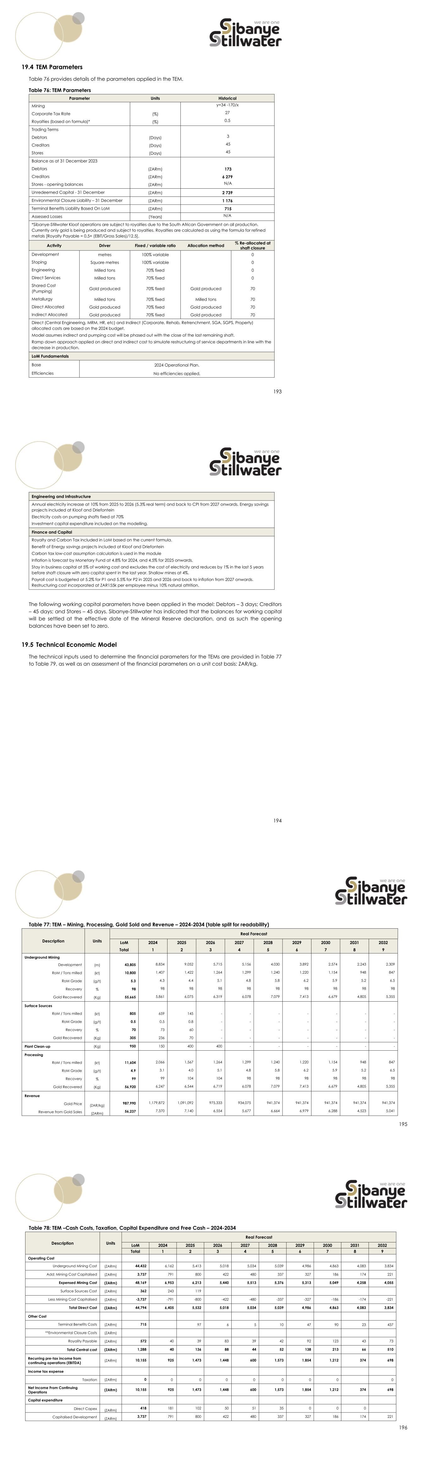 193 19.4 TEM Parameters Table 76 provides details of the parameters applied in the TEM. Table 76: TEM Parameters Parameter Units Historical Mining y=34 -170/x Corporate Tax Rate (%) 27 Royalties (based on formula)* (%) 0.5 Trading Terms Debtors (Days) 3 Creditors (Days) 45 Stores (Days) 45 Balance as at 31 December 2023 Debtors (ZARm) 173 Creditors (ZARm) 6 279 Stores - opening balances (ZARm) N/A Unredeemed Capital - 31 December (ZARm) 2 739 Environmental Closure Liability – 31 December (ZARm) 1 176 Terminal Benefits Liability Based On LoM (ZARm) 715 Assessed Losses (Years) N/A *Sibanye-Stillwater Kloof operations are subject to royalties due to the South African Government on all production. Currently only gold is being produced and subject to royalties. Royalties are calculated as using the formula for refined metals [Royalty Payable = 0.5+ (EBIT/Gross Sales)/12.5]. Activity Driver Fixed / variable ratio Allocation method % Re-allocated at shaft closure Development metres 100% variable 0 Stoping Square metres 100% variable 0 Engineering Milled tons 70% fixed 0 Direct Services Milled tons 70% fixed 0 Shared Cost (Pumping) Gold produced 70% fixed Gold produced 70 Metallurgy Milled tons 70% fixed Milled tons 70 Direct Allocated Gold produced 70% fixed Gold produced 70 Indirect Allocated Gold produced 70% fixed Gold produced 70 Direct (Central Engineering, MRM, HR, etc) and Indirect (Corporate, Rehab, Retrenchment, SGA, SGPS, Property) allocated costs are based on the 2024 budget. Model assumes indirect and pumping cost will be phased out with the close of the last remaining shaft. Ramp down approach applied on direct and indirect cost to simulate restructuring of service departments in line with the decrease in production. LoM Fundamentals Base 2024 Operational Plan. Efficiencies No efficiencies applied, 194 Engineering and Infrastructure Annual electricity increase at 10% from 2025 to 2026 (5.3% real term) and back to CPI from 2027 onwards. Energy savings projects included at Kloof and Driefontein Electricity costs on pumping shafts fixed at 70% Investment capital expenditure included on the modelling. Finance and Capital Royalty and Carbon Tax included in LoM based on the current formula. Benefit of Energy savings projects included at Kloof and Driefontein Carbon tax low-cost assumption calculation is used in the module Inflation is forecast by Monetary Fund at 4.8% for 2024, and 4.5% for 2025 onwards. Stay in business capital at 5% of working cost and excludes the cost of electricity and reduces by 1% in the last 5 years before shaft closure with zero capital spent in the last year. Shallow mines at 4%. Payroll cost is budgeted at 5.2% for P1 and 5.5% for P2 in 2025 and 2026 and back to inflation from 2027 onwards. Restructuring cost incorporated at ZAR155k per employee minus 10% natural attrition. The following working capital parameters have been applied in the model: Debtors – 3 days; Creditors – 45 days; and Stores – 45 days. Sibanye-Stillwater has indicated that the balances for working capital will be settled at the effective date of the Mineral Reserve declaration, and as such the opening balances have been set to zero. 19.5 Technical Economic Model The technical inputs used to determine the financial parameters for the TEMs are provided in Table 77 to Table 79, as well as an assessment of the financial parameters on a unit cost basis: ZAR/kg. 195 Table 77: TEM – Mining, Processing, Gold Sold and Revenue – 2024-2034 (table split for readability) Description Units Real Forecast LoM 2024 2025 2026 2027 2028 2029 2030 2031 2032 Total 1 2 3 4 5 6 7 8 9 Underground Mining Development (m) 43,805 8,834 9,052 5,715 5,156 4,030 3,892 2,574 2,243 2,309 RoM / Tons milled (kt) 10,800 1,407 1,422 1,264 1,299 1,240 1,220 1,154 948 847 RoM Grade (g/t) 5.3 4.3 4.4 5.1 4.8 5.8 6.2 5.9 5.2 6.5 Recovery % 98 98 98 98 98 98 98 98 98 98 Gold Recovered (Kg) 55,665 5,861 6,075 6,319 6,078 7,079 7,413 6,679 4,805 5,355 Surface Sources RoM / Tons milled (kt) 805 659 145 - - - - - - - RoM Grade (g/t) 0.5 0.5 0.8 - - - - - - - Recovery % 70 73 60 - - - - - - - Gold Recovered (Kg) 305 236 70 - - - - - - - Plant Clean-up (Kg) 950 150 400 400 - - - - - - Processing RoM / Tons milled (kt) 11,604 2,066 1,567 1,264 1,299 1,240 1,220 1,154 948 847 RoM Grade (g/t) 4.9 3.1 4.0 5.1 4.8 5.8 6.2 5.9 5.2 6.5 Recovery % 99 99 104 104 98 98 98 98 98 98 Gold Recovered (Kg) 56,920 6,247 6,544 6,719 6,078 7,079 7,413 6,679 4,805 5,355 Revenue Gold Price (ZAR/kg) 987,990 1,179,872 1,091,092 975,333 934,075 941,374 941,374 941,374 941,374 941,374 Revenue from Gold Sales (ZARm) 56,237 7,370 7,140 6,554 5,677 6,664 6,979 6,288 4,523 5,041 196 Table 78: TEM –Cash Costs, Taxation, Capital Expenditure and Free Cash – 2024-2034 Description Units Real Forecast LoM 2024 2025 2026 2027 2028 2029 2030 2031 2032 Total 1 2 3 4 5 6 7 8 9 Operating Cost Underground Mining Cost (ZARm) 44,432 6,162 5,413 5,018 5,034 5,039 4,986 4,863 4,083 3,834 Add: Mining Cost Capitalised (ZARm) 3,737 791 800 422 480 337 327 186 174 221 Expensed Mining Cost (ZARm) 48,169 6,953 6,213 5,440 5,513 5,376 5,313 5,049 4,258 4,055 Surface Sources Cost (ZARm) 362 243 119 Less Mining Cost Capitalised (ZARm) -3,737 -791 -800 -422 -480 -337 -327 -186 -174 -221 Total Direct Cost (ZARm) 44,794 6,405 5,532 5,018 5,034 5,039 4,986 4,863 4,083 3,834 Other Cost Terminal Benefits Costs (ZARm) 715 97 6 5 10 47 90 23 437 **Environmental Closure Costs (ZARm) Royality Payable (ZARm) 572 40 39 83 39 42 92 123 43 73 Total Central cost (ZARm) 1,288 40 136 88 44 52 138 213 66 510 Recurring pre-tax income from continuing operations (EBITDA) (ZARm) 10,155 925 1,473 1,448 600 1,573 1,854 1,212 374 698 Income tax expense Taxation (ZARm) 0 0 0 0 0 0 0 0 0 Net Income From Continuing Operations (ZARm) 10,155 925 1,473 1,448 600 1,573 1,854 1,212 374 698 Capital expenditure Direct Capex (ZARm) 418 181 102 50 51 35 0 0 0 Capitalised Development (ZARm) 3,737 791 800 422 480