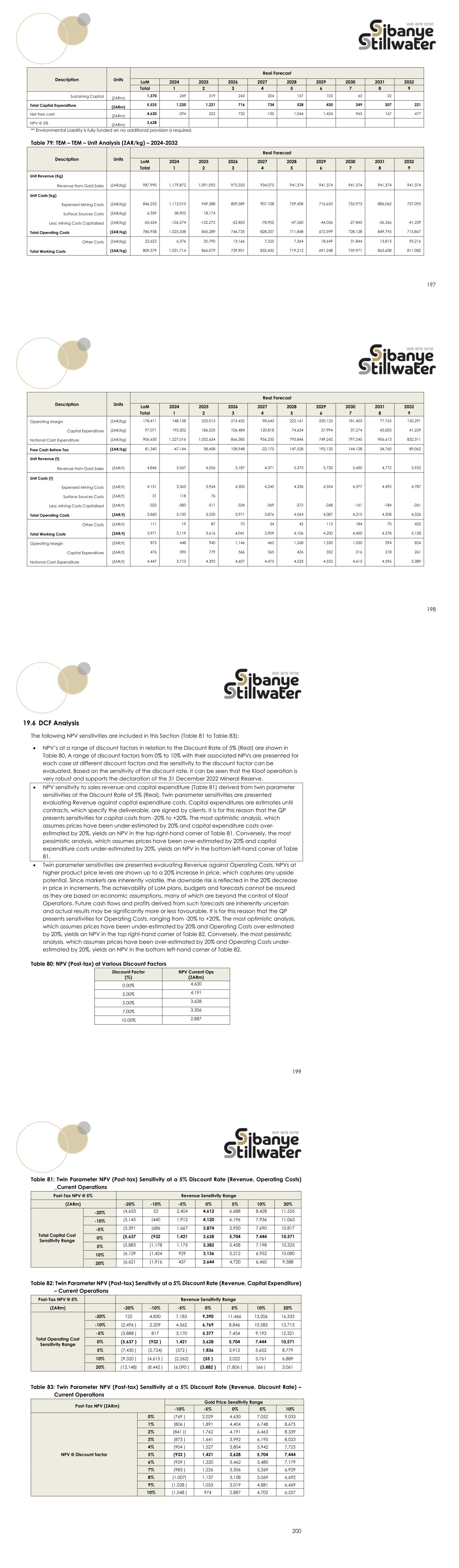 197 Description Units Real Forecast LoM 2024 2025 2026 2027 2028 2029 2030 2031 2032 Total 1 2 3 4 5 6 7 8 9 Sustaining Capital (ZARm) 1,370 249 319 243 204 157 103 63 32 Total Capital Expenditure (ZARm) 5,525 1,220 1,221 716 734 528 430 249 207 221 Net free cash (ZARm) 4,630 -294 252 732 -135 1,044 1,424 963 167 477 NPV @ 5% (ZARm) 3,628 ** Environmental Liability is fully funded an no additional provision is required. Table 79: TEM – TEM – Unit Analysis (ZAR/kg) – 2024-2032 Description Units Real Forecast LoM 2024 2025 2026 2027 2028 2029 2030 2031 2032 Total 1 2 3 4 5 6 7 8 9 Unit Revenue (Kg) Revenue from Gold Sales (ZAR/kg) 987,990 1,179,872 1,091,092 975,333 934,075 941,374 941,374 941,374 941,374 941,374 Unit Costs (kg) Expensed Mining Costs (ZAR/kg) 846,253 1,113,010 949,388 809,589 907,108 759,408 716,655 755,973 886,062 757,095 Surface Sources Costs (ZAR/kg) 6,359 38,902 18,174 Less: Mining Costs Capitalised (ZAR/kg) -65,654 -126,574 -122,272 -62,853 -78,902 -47,560 -44,056 -27,845 -36,266 -41,229 Total Operating Costs (ZAR/kg) 786,958 1,025,338 845,289 746,735 828,207 711,848 672,599 728,128 849,795 715,867 Other Costs (ZAR/kg) 22,622 6,376 20,790 13,166 7,225 7,364 18,649 31,844 13,813 95,216 Total Working Costs (ZAR/kg) 809,579 1,031,714 866,079 759,901 835,432 719,212 691,248 759,971 863,608 811,082 198 Description Units Real Forecast LoM 2024 2025 2026 2027 2028 2029 2030 2031 2032 Total 1 2 3 4 5 6 7 8 9 Operating Margin (ZAR/kg) 178,411 148,158 225,013 215,432 98,643 222,161 250,125 181,403 77,765 130,291 Capital Expenditure (ZAR/kg) 97,071 195,302 186,555 106,484 120,818 74,634 57,994 37,274 43,005 41,229 Notional Cash Expenditure (ZAR/kg) 906,650 1,227,016 1,052,634 866,385 956,250 793,846 749,242 797,245 906,613 852,311 Free Cash Before Tax (ZAR/kg) 81,340 -47,144 38,458 108,948 -22,175 147,528 192,132 144,128 34,760 89,062 Unit Revenue (t) Revenue from Gold Sales (ZAR/t) 4,846 3,567 4,556 5,187 4,371 5,375 5,720 5,450 4,772 5,952 Unit Costs (t) Expensed Mining Costs (ZAR/t) 4,151 3,365 3,964 4,305 4,245 4,336 4,354 4,377 4,492 4,787 Surface Sources Costs (ZAR/t) 31 118 76 Less: Mining Costs Capitalised (ZAR/t) -322 -383 -511 -334 -369 -272 -268 -161 -184 -261 Total Operating Costs (ZAR/t) 3,860 3,100 3,530 3,971 3,876 4,064 4,087 4,215 4,308 4,526 Other Costs (ZAR/t) 111 19 87 70 34 42 113 184 70 602 Total Working Costs (ZAR/t) 3,971 3,119 3,616 4,041 3,909 4,106 4,200 4,400 4,378 5,128 Operating Margin (ZAR/t) 875 448 940 1,146 462 1,268 1,520 1,050 394 824 Capital Expenditure (ZAR/t) 476 590 779 566 565 426 352 216 218 261 Notional Cash Expenditure (ZAR/t) 4,447 3,710 4,395 4,607 4,475 4,533 4,552 4,615 4,596 5,389 199 19.6 DCF Analysis The following NPV sensitivities are included in this Section (Table 81 to Table 83):  NPV’s at a range of discount factors in relation to the Discount Rate of 5% (Real) are shown in Table 80. A range of discount factors from 0% to 10% with their associated NPVs are presented for each case at different discount factors and the sensitivity to the discount factor can be evaluated. Based on the sensitivity of the discount rate, it can be seen that the Kloof operation is very robust and supports the declaration of the 31 December 2022 Mineral Reserve.  NPV sensitivity to sales revenue and capital expenditure (Table 81) derived from twin parameter sensitivities at the Discount Rate of 5% (Real). Twin parameter sensitivities are presented evaluating Revenue against capital expenditure costs. Capital expenditures are estimates until contracts, which specify the deliverable, are signed by clients. It is for this reason that the QP presents sensitivities for capital costs from -20% to +20%. The most optimistic analysis, which assumes prices have been under-estimated by 20% and capital expenditure costs over- estimated by 20%, yields an NPV in the top right-hand corner of Table 81. Conversely, the most pessimistic analysis, which assumes prices have been over-estimated by 20% and capital expenditure costs under-estimated by 20%, yields an NPV in the bottom left-hand corner of Table 81.  Twin parameter sensitivities are presented evaluating Revenue against Operating Costs. NPVs at higher product price levels are shown up to a 20% increase in price, which captures any upside potential. Since markets are inherently volatile, the downside risk is reflected in the 20% decrease in price in increments. The achievability of LoM plans, budgets and forecasts cannot be assured as they are based on economic assumptions, many of which are beyond the control of Kloof Operations. Future cash flows and profits derived from such forecasts are inherently uncertain and actual results may be significantly more or less favourable. It is for this reason that the QP presents sensitivities for Operating Costs, ranging from -20% to +20%. The most optimistic analysis, which assumes prices have been under-estimated by 20% and Operating Costs over-estimated by 20%, yields an NPV in the top right-hand corner of Table 82. Conversely, the most pessimistic analysis, which assumes prices have been over-estimated by 20% and Operating Costs under- estimated by 20%, yields an NPV in the bottom left-hand corner of Table 82. Table 80: NPV (Post-tax) at Various Discount Factors Discount Factor (%) NPV Current Ops (ZARm) 0.00% 4,630 2.00% 4,191 5.00% 3,628 7.00% 3,306 10.00% 2,887 200 Table 81: Twin Parameter NPV (Post-tax) Sensitivity at a 5% Discount Rate (Revenue, Operating Costs) _Current Operations Post-Tax NPV @ 5% Revenue Sensitivity Range (ZARm) -20% -10% -5% 0% 5% 10% 20% Total Capital Cost Sensitivity Range -20% (4,653 52 2,404 4,612 6,688 8,428 11,555 -10% (5,145 (440 1,912 4,120 6,196 7,936 11,063 -5% (5,391 (686 1,667 3,874 5,950 7,690 10,817 0% (5,637 (932 1,421 3,628 5,704 7,444 10,571 5% (5,883 (1,178 1,175 3,382 5,458 7,198 10,325 10% (6,129 (1,424 929 3,136 5,212 6,952 10,080 20% (6,621 (1,916 437 2,644 4,720 6,460 9,588 Table 82: Twin Parameter NP