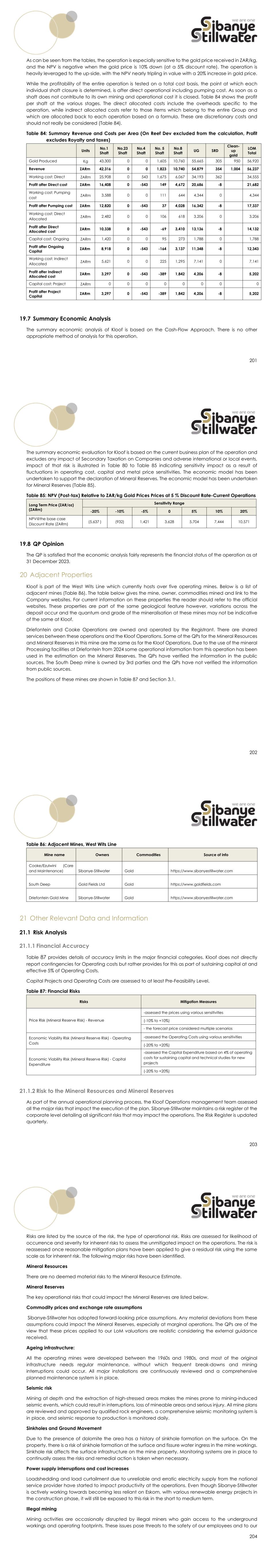 201 As can be seen from the tables, the operation is especially sensitive to the gold price received in ZAR/kg, and the NPV is negative when the gold price is 10% down (at a 5% discount rate). The operation is heavily leveraged to the up-side, with the NPV nearly tripling in value with a 20% increase in gold price. While the profitability of the entire operation is tested on a total cost basis, the point at which each individual shaft closure is determined, is after direct operational including pumping cost. As soon as a shaft does not contribute to its own mining and operational cost it is closed. Table 84 shows the profit per shaft at the various stages. The direct allocated costs include the overheads specific to the operation, while indirect allocated costs refer to those items which belong to the entire Group and which are allocated back to each operation based on a formula. These are discretionary costs and should not really be considered (Table 84). Table 84: Summary Revenue and Costs per Area (On Reef Dev excluded from the calculation, Profit excludes Royalty and taxes) Units No.1 Shaft No.23 Shaft No.4 Shaft No. 5 Shaft No.8 Shaft UG SRD Clean- up gold LOM Total Gold Produced Kg 43,300 0 0 1,605 10,760 55,665 305 950 56,920 Revenue ZARm 42,316 0 0 1,823 10,740 54,879 354 1,004 56,237 Working cost: Direct ZARm 25,908 0 543 1,675 6,067 34,193 362 34,555 Profit after Direct cost ZARm 16,408 0 -543 149 4,672 20,686 -8 21,682 Working cost: Pumping cost ZARm 3,588 0 0 111 644 4,344 0 4,344 Profit after Pumping cost ZARm 12,820 0 -543 37 4,028 16,342 -8 17,337 Working cost: Direct Allocated ZARm 2,482 0 0 106 618 3,206 0 3,206 Profit after Direct Allocated cost ZARm 10,338 0 -543 -69 3,410 13,136 -8 14,132 Capital cost: Ongoing ZARm 1,420 0 0 95 273 1,788 0 1,788 Profit after Ongoing Capital ZARm 8,918 0 -543 -164 3,137 11,348 -8 12,343 Working cost: Indirect Allocated ZARm 5,621 0 0 225 1,295 7,141 0 7,141 Profit after Indirect Allocated cost ZARm 3,297 0 -543 -389 1,842 4,206 -8 5,202 Capital cost: Project ZARm 0 0 0 0 0 0 0 0 Profit after Project Capital ZARm 3,297 0 -543 -389 1,842 4,206 -8 5,202 19.7 Summary Economic Analysis The summary economic analysis of Kloof is based on the Cash-Flow Approach. There is no other appropriate method of analysis for this operation. 202 The summary economic evaluation for Kloof is based on the current business plan of the operation and excludes any impact of Secondary Taxation on Companies and adverse international or local events, impact of that risk is illustrated in Table 80 to Table 85 indicating sensitivity impact as a result of fluctuations in operating cost, capital and metal price sensitivities. The economic model has been undertaken to support the declaration of Mineral Reserves. The economic model has been undertaken for Mineral Reserves (Table 85). Table 85: NPV (Post-tax) Relative to ZAR/kg Gold Prices Prices at 5 % Discount Rate-Current Operations Long Term Price (ZAR/oz) (ZARm) Sensitivity Range -20% -10% -5% 0 5% 10% 20% NPV@the base case Discount Rate (ZARm) (5,637 ) (932) 1,421 3,628 5.704 7,444 10,571 19.8 QP Opinion The QP is satisfied that the economic analysis fairly represents the financial status of the operation as at 31 December 2023. 20 Adjacent Properties Kloof is part of the West Wits Line which currently hosts over five operating mines. Below is a list of adjacent mines (Table 86). The table below gives the mine, owner, commodities mined and link to the Company websites. For current information on these properties the reader should refer to the official websites. These properties are part of the same geological feature however, variations across the deposit occur and the quantum and grade of the mineralisation at these mines may not be indicative of the same at Kloof. Driefontein and Cooke Operations are owned and operated by the Registrant. There are shared services between these operations and the Kloof Operations. Some of the QPs for the Mineral Resources and Mineral Reserves in this mine are the same as for the Kloof Operations. Due to the use of the mineral Processing facilities at Driefontein from 2024 some operational information from this operation has been used in the estimation on the Mineral Reserves. The QPs have verified the information in the public sources. The South Deep mine is owned by 3rd parties and the QPs have not verified the information from public sources. The positions of these mines are shown in Table 87 and Section 3.1. 203 Table 86: Adjacent Mines, West Wits Line Mine name Owners Commodities Source of info Cooke/Ezulwini (Care and Maintenance) Sibanye-Stillwater Gold https://www.sibanyestillwater.com South Deep Gold Fields Ltd Gold https://www.goldfields.com Driefontein Gold Mine Sibanye-Stillwater Gold https://www.sibanyestillwater.com 21 Other Relevant Data and Information 21.1 Risk Analysis 21.1.1 Financial Accuracy Table 87 provides details of accuracy limits in the major financial categories. Kloof does not directly report contingencies for Operating costs but rather provides for this as part of sustaining capital at and effective 5% of Operating Costs. Capital Projects and Operating Costs are assessed to at least Pre-Feasibility Level. Table 87: Financial Risks Risks Mitigation Measures Price Risk (Mineral Reserve Risk) - Revenue -assessed the prices using various sensitivities (-10% to +10%) - the forecast price considered multiple scenarios Economic Viability Risk (Mineral Reserve Risk) - Operating Costs -assessed the Operating Costs using various sensitivities (-20% to +20%) Economic Viability Risk (Mineral Reserve Risk) - Capital Expenditure -assessed the Capital Expenditure based on 4% of operating costs for sustaining capital and technical studies for new projects (-20% to +20%) 21.1.2 Risk to the Mineral Resources and Mineral Reserves As part of the annual operational planning process, the Kloof Operations management team assessed all the major risks that impact the execution 
