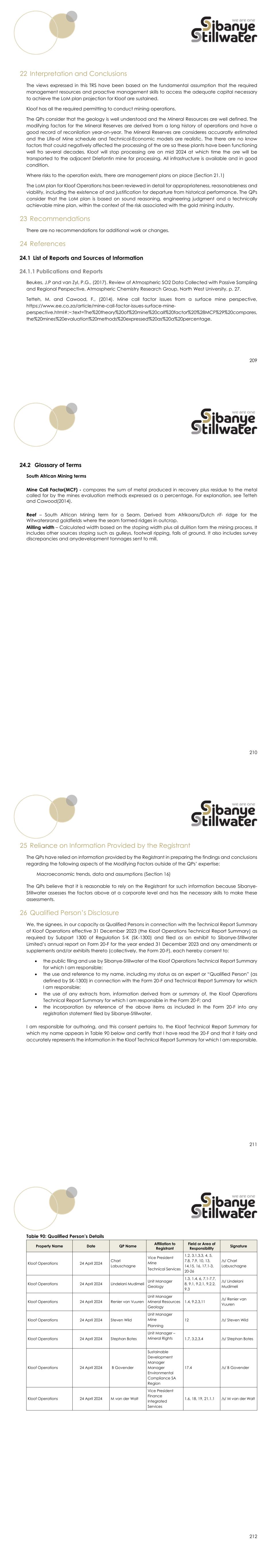 209 22 Interpretation and Conclusions The views expressed in this TRS have been based on the fundamental assumption that the required management resources and proactive management skills to access the adequate capital necessary to achieve the LoM plan projection for Kloof are sustained. Kloof has all the required permitting to conduct mining operations. The QPs consider that the geology is well understood and the Mineral Resources are well defined. The modifying factors for the Mineral Reserves are derived from a long history of operations and have a good record of reconilation year-on-year. The Mineral Reserves are consideres accuaratly estimated and the Life-of Mine schedule and Technical-Economic models are realistic. The there are no know factors that could negatively affected the processing of the ore sa these plants have been functioning well fro several decades. Kloof will stop processing ore on mid 2024 at which time the ore will be transported to the adjacent Driefontin mine for processing. All infrastructure is available and in good condition. Where risks to the operation exists, there are management plans on place (Section 21.1) The LoM plan for Kloof Operations has been reviewed in detail for appropriateness, reasonableness and viability, including the existence of and justification for departure from historical performance. The QPs consider that the LoM plan is based on sound reasoning, engineering judgment and a technically achievable mine plan, within the context of the risk associated with the gold mining industry. 23 Recommendations There are no recommendations for additional work or changes. 24 References 24.1 List of Reports and Sources of Information 24.1.1 Publications and Reports Beukes, J.P and van Zyl, P.G., (2017). Review of Atmospheric SO2 Data Collected with Passive Sampling and Regional Perspective, Atmospheric Chemistry Research Group, North West University, p. 27. Tetteh, M. and Cawood, F., (2014). Mine call factor issues from a surface mine perspective, https://www.ee.co.za/article/mine-call-factor-issues-surface-mine- perspective.html#:~:text=The%20theory%20of%20mine%20call%20factor%20%28MCF%29%20compares, the%20mines%20evaluation%20methods%20expressed%20as%20a%20percentage. 210 24.2 Glossary of Terms South African Mining terms Mine Call Factor(MCF) - compares the sum of metal produced in recovery plus residue to the metal called for by the mines evaluation methods expressed as a percentage. For explanation, see Tetteh and Cawood(2014). Reef – South African Mining term for a Seam. Derived from Afrikaans/Dutch rif- ridge for the Witwatersrand goldfields where the seam formed ridges in outcrop. Milling width – Calculated width based on the stoping width plus all dulition form the mining process. It includes other sources stoping such as gulleys, footwall ripping, falls of ground. It also includes survey discrepancies and anydevelopment tonnages sent to mill. 211 25 Reliance on Information Provided by the Registrant The QPs have relied on information provided by the Registrant in preparing the findings and conclusions regarding the following aspects of the Modifying Factors outside of the QPs’ expertise: Macroeconomic trends, data and assumptions (Section 16) The QPs believe that it is reasonable to rely on the Registrant for such information because Sibanye- Stillwater assesses the factors above at a corporate level and has the necessary skills to make these assessments. 26 Qualified Person’s Disclosure We, the signees, in our capacity as Qualified Persons in connection with the Technical Report Summary of Kloof Operations effective 31 December 2023 (the Kloof Operations Technical Report Summary) as required by Subpart 1300 of Regulation S-K (SK-1300) and filed as an exhibit to Sibanye-Stillwater Limited’s annual report on Form 20-F for the year ended 31 December 2023 and any amendments or supplements and/or exhibits thereto (collectively, the Form 20-F), each hereby consent to:  the public filing and use by Sibanye-Stillwater of the Kloof Operations Technical Report Summary for which I am responsible;  the use and reference to my name, including my status as an expert or “Qualified Person” (as defined by SK-1300) in connection with the Form 20-F and Technical Report Summary for which I am responsible;  the use of any extracts from, information derived from or summary of, the Kloof Operations Technical Report Summary for which I am responsible in the Form 20-F; and  the incorporation by reference of the above items as included in the Form 20-F into any registration statement filed by Sibanye-Stillwater. I am responsible for authoring, and this consent pertains to, the Kloof Technical Report Summary for which my name appears in Table 90 below and certify that I have read the 20-F and that it fairly and accurately represents the information in the Kloof Technical Report Summary for which I am responsible. 212 Table 90: Qualified Person’s Details Property Name Date QP Name Affiliation to Registrant Field or Area of Responsibility Signature Kloof Operations 24 April 2024 Charl Labuschagne Vice President Mine Technical Services 1,2, 3.1,3.3, 4, 5, 7.8, 7.9, 10, 13, 14,15, 16, 17.1-3, 20-26 /s/ Charl Labuschagne Kloof Operations 24 April 2024 Lindelani Mudimeli Unit Manager Geology 1.3, 1.4, 6, 7.1-7.7, 8, 9.1, 9.2.1, 9.2.2, 9.3 /s/ Lindelani Mudimeli Kloof Operations 24 April 2024 Renier van Vuuren Unit Manager Mineral Resources Geology 1.4, 9.2.3,11 /s/ Renier van Vuuren Kloof Operations 24 April 2024 Steven Wild Unit Manager Mine Planning 12 /s/ Steven Wild Kloof Operations 24 April 2024 Stephan Botes Unit Manager – Mineral Rights 1.7, 3.2,3.4 /s/ Stephan Botes Kloof Operations 24 April 2024 B Govender Sustainable Development Manager Manager Environmental Compliance SA Region 17.4 /s/ B Govender Kloof Operations 24 April 2024 M van der Walt Vice President Finance Integrated Services 1.6, 18, 19, 21.1.1 /s/ M van der Walt