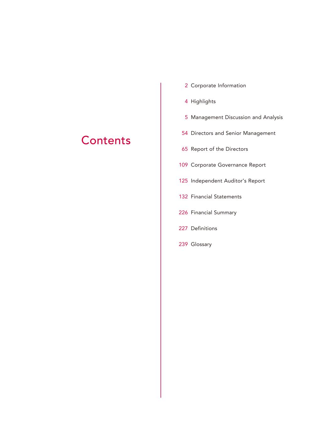 2 Corporate Information 4 Highlights 5 Management Discussion and Analysis 54 Directors and Senior Management 65 Report of the Directors 109 Corporate Governance Report 125 Independent Auditor’s Report 132 Financial Statements 226 Financial Summary 227 Definitions 239 Glossary Contents