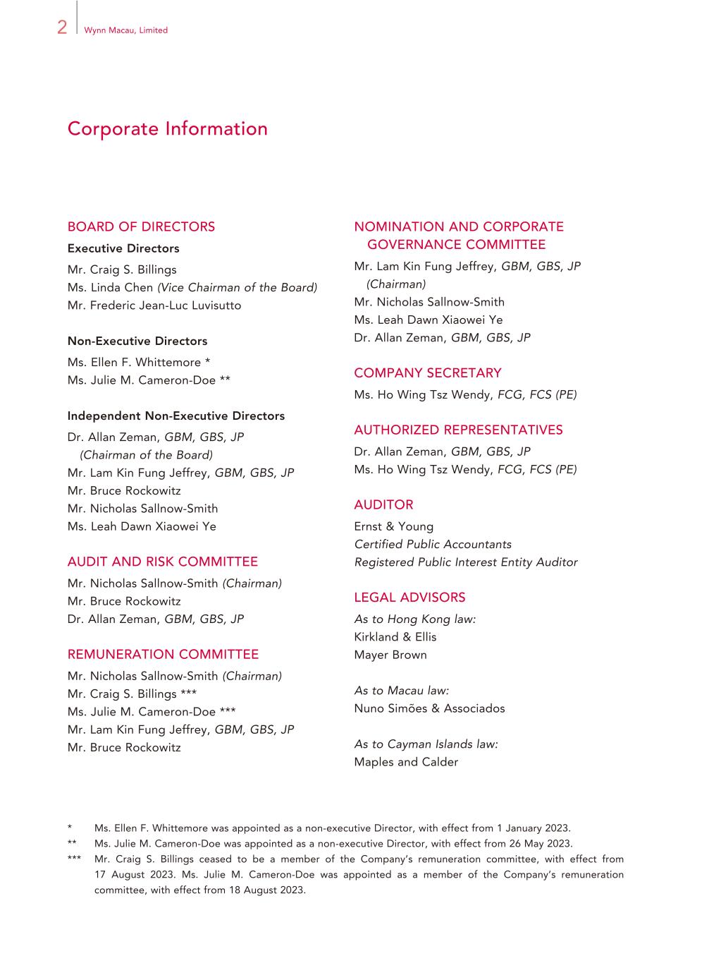 2 Wynn Macau, Limited Corporate Information * Ms. Ellen F. Whittemore was appointed as a non-executive Director, with effect from 1 January 2023. ** Ms. Julie M. Cameron-Doe was appointed as a non-executive Director, with effect from 26 May 2023. *** Mr. Craig S. Billings ceased to be a member of the Company’s remuneration committee, with effect from 17 August 2023. Ms. Julie M. Cameron-Doe was appointed as a member of the Company’s remuneration committee, with effect from 18 August 2023. BOARD OF DIRECTORS Executive Directors Mr. Craig S. Billings Ms. Linda Chen (Vice Chairman of the Board) Mr. Frederic Jean-Luc Luvisutto Non-Executive Directors Ms. Ellen F. Whittemore * Ms. Julie M. Cameron-Doe ** Independent Non-Executive Directors Dr. Allan Zeman, GBM, GBS, JP (Chairman of the Board) Mr. Lam Kin Fung Jeffrey, GBM, GBS, JP Mr. Bruce Rockowitz Mr. Nicholas Sallnow-Smith Ms. Leah Dawn Xiaowei Ye AUDIT AND RISK COMMITTEE Mr. Nicholas Sallnow-Smith (Chairman) Mr. Bruce Rockowitz Dr. Allan Zeman, GBM, GBS, JP REMUNERATION COMMITTEE Mr. Nicholas Sallnow-Smith (Chairman) Mr. Craig S. Billings *** Ms. Julie M. Cameron-Doe *** Mr. Lam Kin Fung Jeffrey, GBM, GBS, JP Mr. Bruce Rockowitz NOMINATION AND CORPORATE GOVERNANCE COMMITTEE Mr. Lam Kin Fung Jeffrey, GBM, GBS, JP (Chairman) Mr. Nicholas Sallnow-Smith Ms. Leah Dawn Xiaowei Ye Dr. Allan Zeman, GBM, GBS, JP COMPANY SECRETARY Ms. Ho Wing Tsz Wendy, FCG, FCS (PE) AUTHORIZED REPRESENTATIVES Dr. Allan Zeman, GBM, GBS, JP Ms. Ho Wing Tsz Wendy, FCG, FCS (PE) AUDITOR Ernst & Young Certified Public Accountants Registered Public Interest Entity Auditor LEGAL ADVISORS As to Hong Kong law: Kirkland & Ellis Mayer Brown As to Macau law: Nuno Simões & Associados As to Cayman Islands law: Maples and Calder