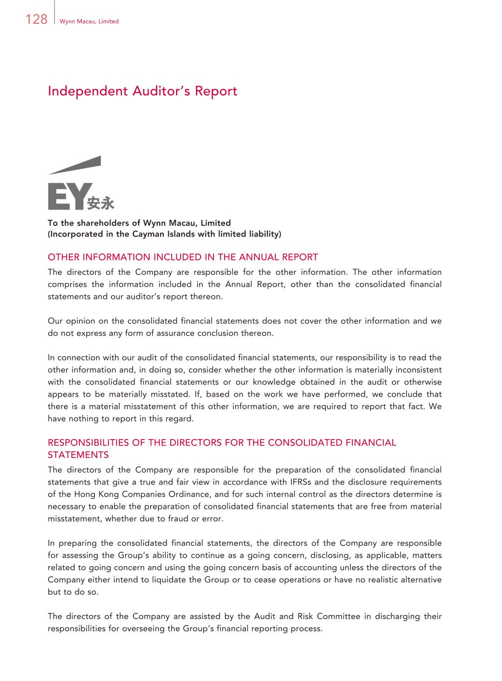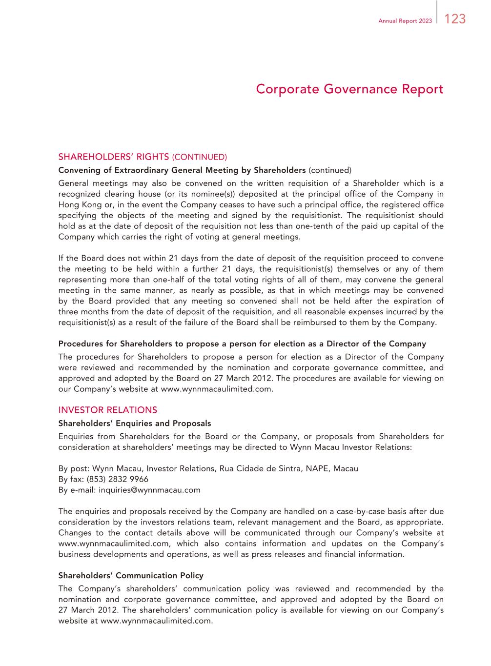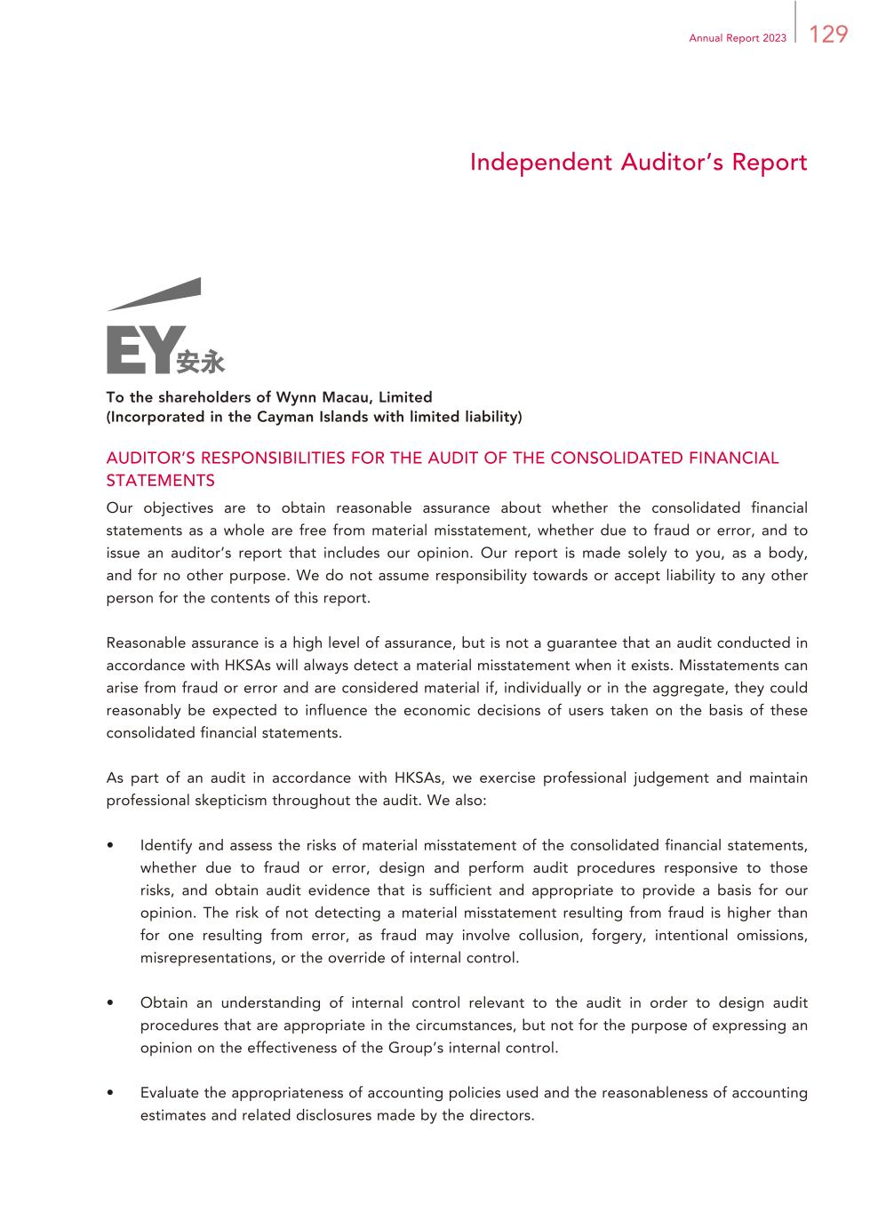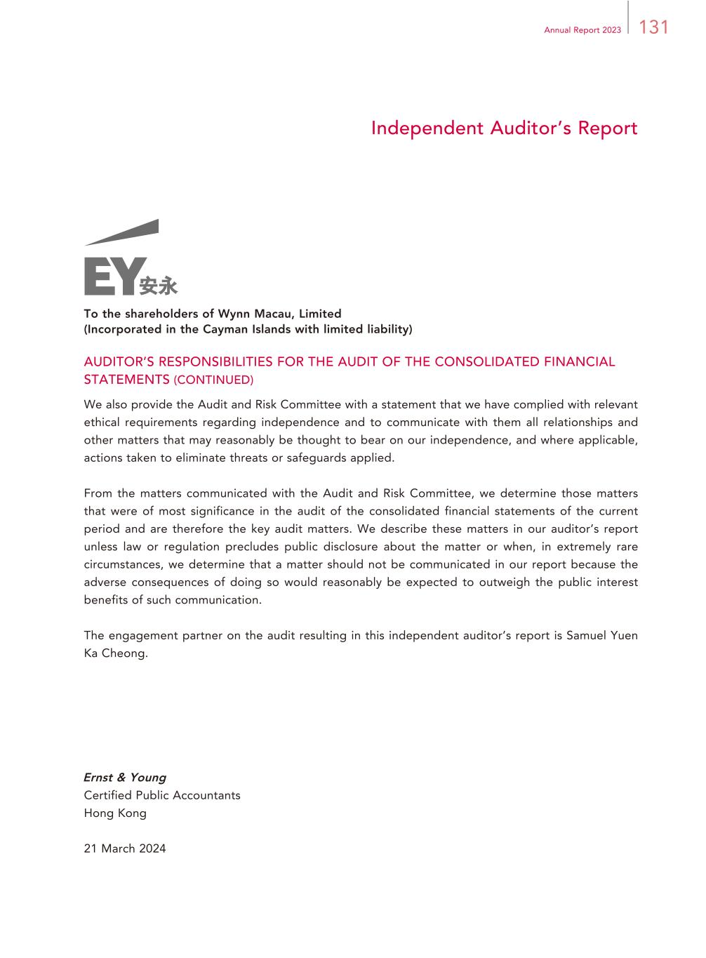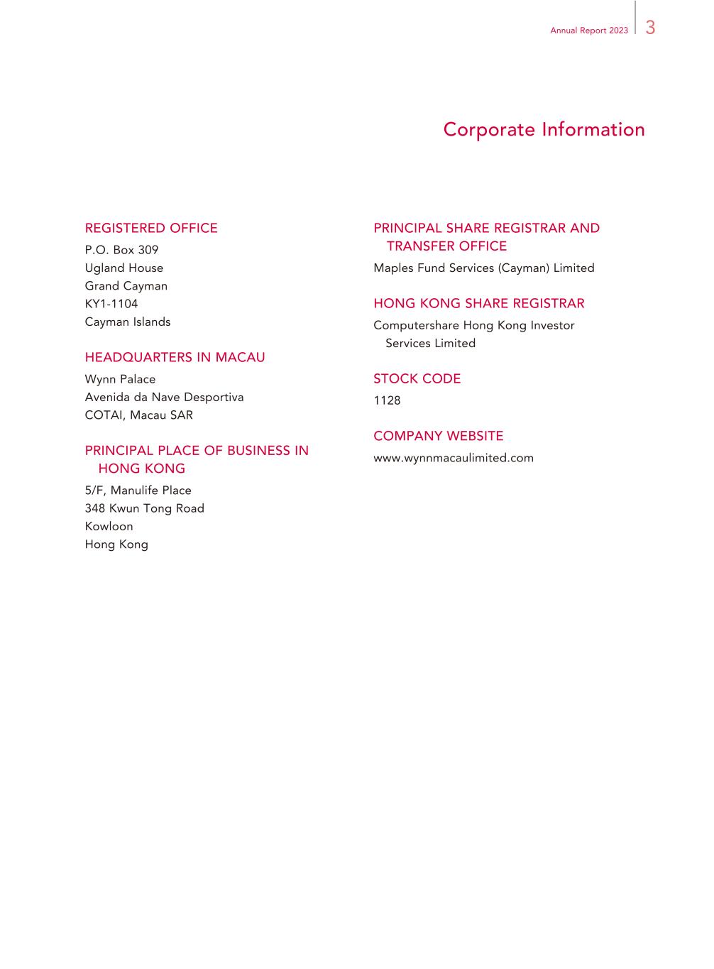 3Annual Report 2023 Corporate Information REGISTERED OFFICE P.O. Box 309 Ugland House Grand Cayman KY1-1104 Cayman Islands HEADQUARTERS IN MACAU Wynn Palace Avenida da Nave Desportiva COTAI, Macau SAR PRINCIPAL PLACE OF BUSINESS IN HONG KONG 5/F, Manulife Place 348 Kwun Tong Road Kowloon Hong Kong PRINCIPAL SHARE REGISTRAR AND TRANSFER OFFICE Maples Fund Services (Cayman) Limited HONG KONG SHARE REGISTRAR Computershare Hong Kong Investor Services Limited STOCK CODE 1128 COMPANY WEBSITE www.wynnmacaulimited.com