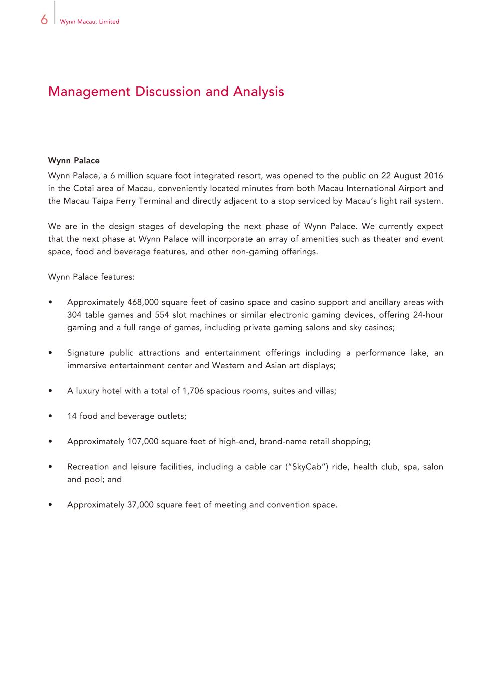 6 Wynn Macau, Limited Management Discussion and Analysis Wynn Palace Wynn Palace, a 6 million square foot integrated resort, was opened to the public on 22 August 2016 in the Cotai area of Macau, conveniently located minutes from both Macau International Airport and the Macau Taipa Ferry Terminal and directly adjacent to a stop serviced by Macau’s light rail system. We are in the design stages of developing the next phase of Wynn Palace. We currently expect that the next phase at Wynn Palace will incorporate an array of amenities such as theater and event space, food and beverage features, and other non-gaming offerings. Wynn Palace features: • Approximately 468,000 square feet of casino space and casino support and ancillary areas with 304 table games and 554 slot machines or similar electronic gaming devices, offering 24-hour gaming and a full range of games, including private gaming salons and sky casinos; • Signature public attractions and entertainment offerings including a performance lake, an immersive entertainment center and Western and Asian art displays; • A luxury hotel with a total of 1,706 spacious rooms, suites and villas; • 14 food and beverage outlets; • Approximately 107,000 square feet of high-end, brand-name retail shopping; • Recreation and leisure facilities, including a cable car (“SkyCab”) ride, health club, spa, salon and pool; and • Approximately 37,000 square feet of meeting and convention space.