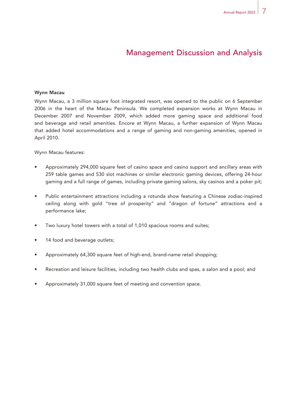 7Annual Report 2023 Management Discussion and Analysis Wynn Macau Wynn Macau, a 3 million square foot integrated resort, was opened to the public on 6 September 2006 in the heart of the Macau Peninsula. We completed expansion works at Wynn Macau in December 2007 and November 2009, which added more gaming space and additional food and beverage and retail amenities. Encore at Wynn Macau, a further expansion of Wynn Macau that added hotel accommodations and a range of gaming and non-gaming amenities, opened in April 2010. Wynn Macau features: • Approximately 294,000 square feet of casino space and casino support and ancillary areas with 259 table games and 530 slot machines or similar electronic gaming devices, offering 24-hour gaming and a full range of games, including private gaming salons, sky casinos and a poker pit; • Public entertainment attractions including a rotunda show featuring a Chinese zodiac-inspired ceiling along with gold “tree of prosperity” and “dragon of fortune” attractions and a performance lake; • Two luxury hotel towers with a total of 1,010 spacious rooms and suites; • 14 food and beverage outlets; • Approximately 64,300 square feet of high-end, brand-name retail shopping; • Recreation and leisure facilities, including two health clubs and spas, a salon and a pool; and • Approximately 31,000 square feet of meeting and convention space.