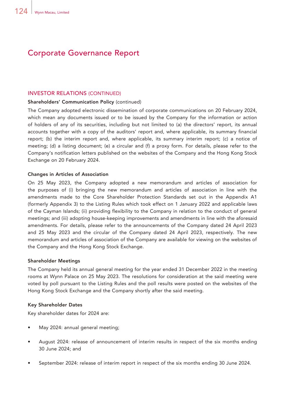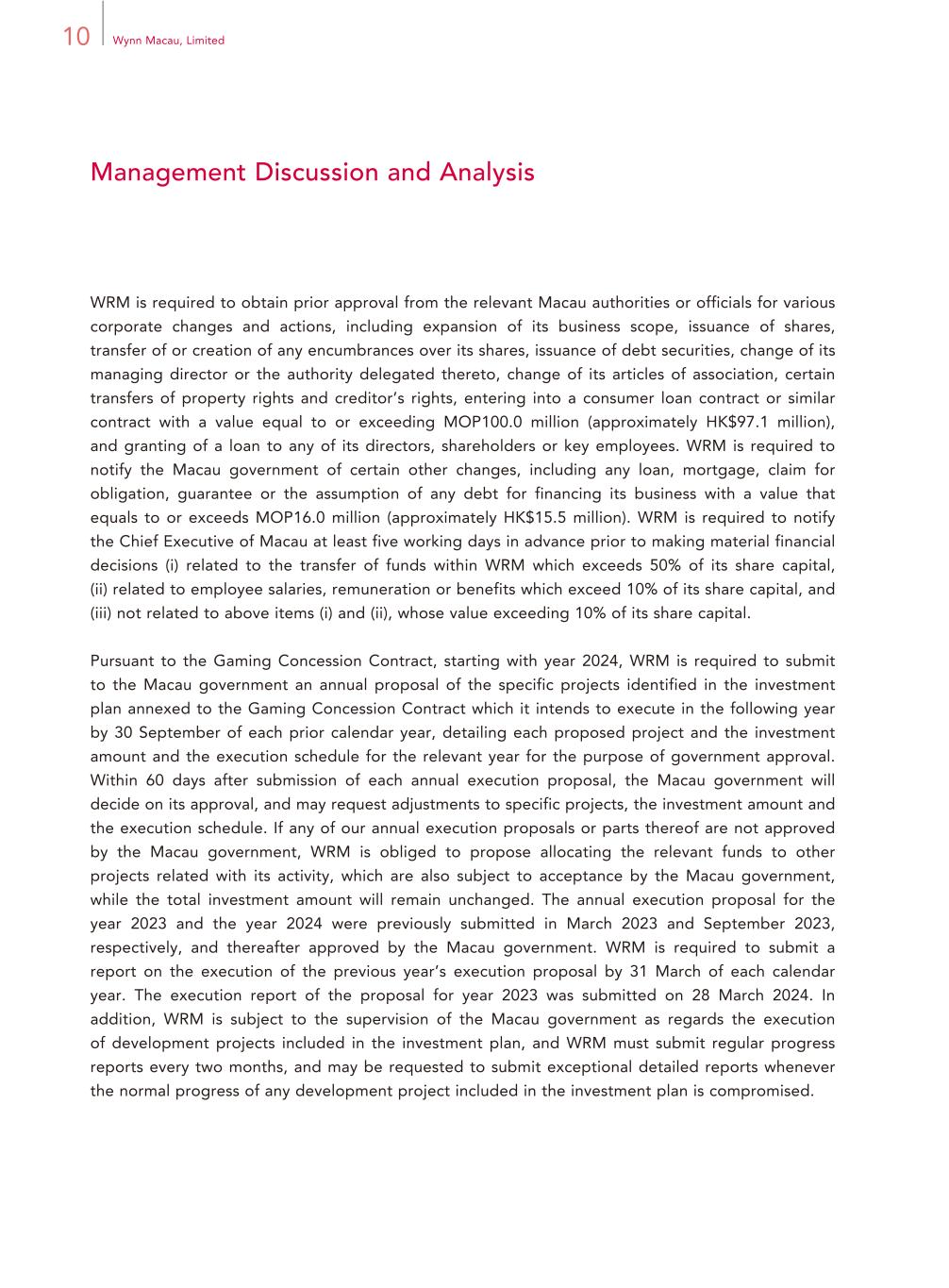 10 Wynn Macau, Limited Management Discussion and Analysis WRM is required to obtain prior approval from the relevant Macau authorities or officials for various corporate changes and actions, including expansion of its business scope, issuance of shares, transfer of or creation of any encumbrances over its shares, issuance of debt securities, change of its managing director or the authority delegated thereto, change of its articles of association, certain transfers of property rights and creditor’s rights, entering into a consumer loan contract or similar contract with a value equal to or exceeding MOP100.0 million (approximately HK$97.1 million), and granting of a loan to any of its directors, shareholders or key employees. WRM is required to notify the Macau government of certain other changes, including any loan, mortgage, claim for obligation, guarantee or the assumption of any debt for financing its business with a value that equals to or exceeds MOP16.0 million (approximately HK$15.5 million). WRM is required to notify the Chief Executive of Macau at least five working days in advance prior to making material financial decisions (i) related to the transfer of funds within WRM which exceeds 50% of its share capital, (ii) related to employee salaries, remuneration or benefits which exceed 10% of its share capital, and (iii) not related to above items (i) and (ii), whose value exceeding 10% of its share capital. Pursuant to the Gaming Concession Contract, starting with year 2024, WRM is required to submit to the Macau government an annual proposal of the specific projects identified in the investment plan annexed to the Gaming Concession Contract which it intends to execute in the following year by 30 September of each prior calendar year, detailing each proposed project and the investment amount and the execution schedule for the relevant year for the purpose of government approval. Within 60 days after submission of each annual execution proposal, the Macau government will decide on its approval, and may request adjustments to specific projects, the investment amount and the execution schedule. If any of our annual execution proposals or parts thereof are not approved by the Macau government, WRM is obliged to propose allocating the relevant funds to other projects related with its activity, which are also subject to acceptance by the Macau government, while the total investment amount will remain unchanged. The annual execution proposal for the year 2023 and the year 2024 were previously submitted in March 2023 and September 2023, respectively, and thereafter approved by the Macau government. WRM is required to submit a report on the execution of the previous year’s execution proposal by 31 March of each calendar year. The execution report of the proposal for year 2023 was submitted on 28 March 2024. In addition, WRM is subject to the supervision of the Macau government as regards the execution of development projects included in the investment plan, and WRM must submit regular progress reports every two months, and may be requested to submit exceptional detailed reports whenever the normal progress of any development project included in the investment plan is compromised.
