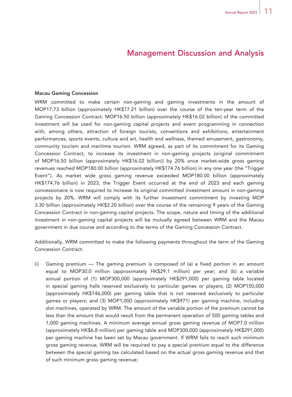11Annual Report 2023 Management Discussion and Analysis Macau Gaming Concession WRM committed to make certain non-gaming and gaming investments in the amount of MOP17.73 billion (approximately HK$17.21 billion) over the course of the ten-year term of the Gaming Concession Contract. MOP16.50 billion (approximately HK$16.02 billion) of the committed investment will be used for non-gaming capital projects and event programming in connection with, among others, attraction of foreign tourists, conventions and exhibitions, entertainment performances, sports events, culture and art, health and wellness, themed amusement, gastronomy, community tourism and maritime tourism. WRM agreed, as part of its commitment for its Gaming Concession Contract, to increase its investment in non-gaming projects (original commitment of MOP16.50 billion (approximately HK$16.02 billion)) by 20% once market-wide gross gaming revenues reached MOP180.00 billion (approximately HK$174.76 billion) in any one year (the “Trigger Event”). As market wide gross gaming revenue exceeded MOP180.00 billion (approximately HK$174.76 billion) in 2023, the Trigger Event occurred at the end of 2023 and each gaming concessionaire is now required to increase its original committed investment amount in non-gaming projects by 20%. WRM will comply with its further investment commitment by investing MOP 3.30 billion (approximately HK$3.20 billion) over the course of the remaining 9 years of the Gaming Concession Contract in non-gaming capital projects. The scope, nature and timing of the additional investment in non-gaming capital projects will be mutually agreed between WRM and the Macau government in due course and according to the terms of the Gaming Concession Contract. Additionally, WRM committed to make the following payments throughout the term of the Gaming Concession Contract: (i) Gaming premium — The gaming premium is composed of (a) a fixed portion in an amount equal to MOP30.0 million (approximately HK$29.1 million) per year; and (b) a variable annual portion of (1) MOP300,000 (approximately HK$291,000) per gaming table located in special gaming halls reserved exclusively to particular games or players; (2) MOP150,000 (approximately HK$146,000) per gaming table that is not reserved exclusively to particular games or players; and (3) MOP1,000 (approximately HK$971) per gaming machine, including slot machines, operated by WRM. The amount of the variable portion of the premium cannot be less than the amount that would result from the permanent operation of 500 gaming tables and 1,000 gaming machines. A minimum average annual gross gaming revenue of MOP7.0 million (approximately HK$6.8 million) per gaming table and MOP300,000 (approximately HK$291,000) per gaming machine has been set by Macau government. If WRM fails to reach such minimum gross gaming revenue, WRM will be required to pay a special premium equal to the difference between the special gaming tax calculated based on the actual gross gaming revenue and that of such minimum gross gaming revenue;