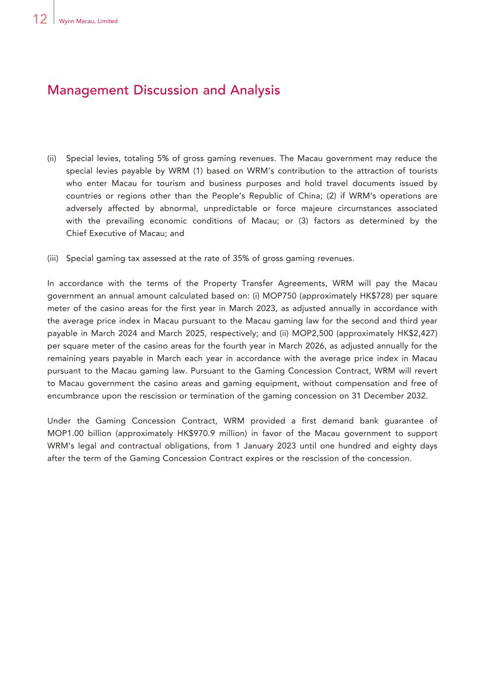 12 Wynn Macau, Limited Management Discussion and Analysis (ii) Special levies, totaling 5% of gross gaming revenues. The Macau government may reduce the special levies payable by WRM (1) based on WRM’s contribution to the attraction of tourists who enter Macau for tourism and business purposes and hold travel documents issued by countries or regions other than the People’s Republic of China; (2) if WRM’s operations are adversely affected by abnormal, unpredictable or force majeure circumstances associated with the prevailing economic conditions of Macau; or (3) factors as determined by the Chief Executive of Macau; and (iii) Special gaming tax assessed at the rate of 35% of gross gaming revenues. In accordance with the terms of the Property Transfer Agreements, WRM will pay the Macau government an annual amount calculated based on: (i) MOP750 (approximately HK$728) per square meter of the casino areas for the first year in March 2023, as adjusted annually in accordance with the average price index in Macau pursuant to the Macau gaming law for the second and third year payable in March 2024 and March 2025, respectively; and (ii) MOP2,500 (approximately HK$2,427) per square meter of the casino areas for the fourth year in March 2026, as adjusted annually for the remaining years payable in March each year in accordance with the average price index in Macau pursuant to the Macau gaming law. Pursuant to the Gaming Concession Contract, WRM will revert to Macau government the casino areas and gaming equipment, without compensation and free of encumbrance upon the rescission or termination of the gaming concession on 31 December 2032. Under the Gaming Concession Contract, WRM provided a first demand bank guarantee of MOP1.00 billion (approximately HK$970.9 million) in favor of the Macau government to support WRM’s legal and contractual obligations, from 1 January 2023 until one hundred and eighty days after the term of the Gaming Concession Contract expires or the rescission of the concession.