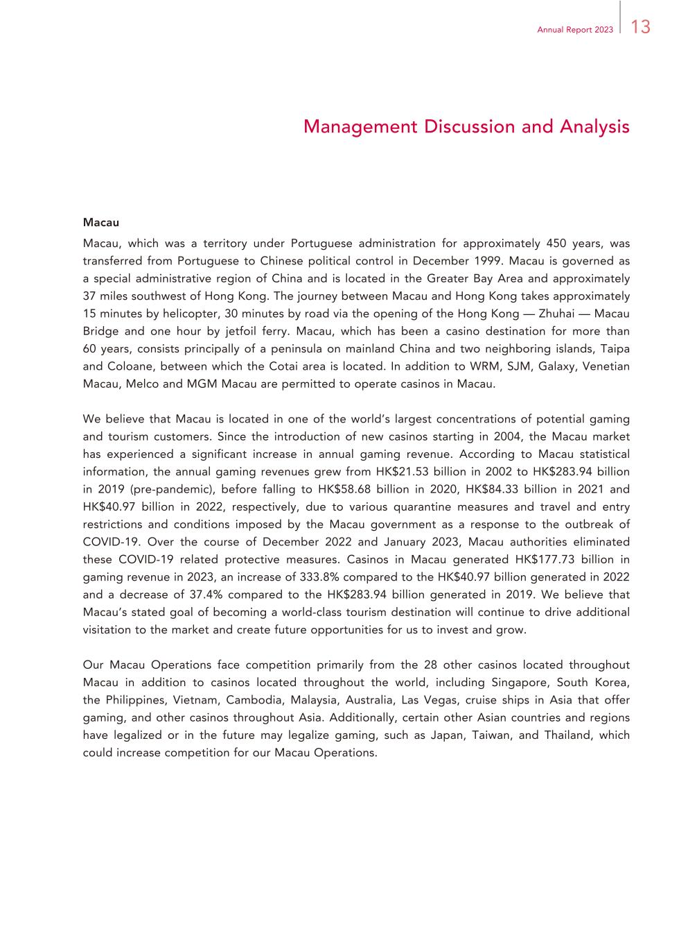 13Annual Report 2023 Management Discussion and Analysis Macau Macau, which was a territory under Portuguese administration for approximately 450 years, was transferred from Portuguese to Chinese political control in December 1999. Macau is governed as a special administrative region of China and is located in the Greater Bay Area and approximately 37 miles southwest of Hong Kong. The journey between Macau and Hong Kong takes approximately 15 minutes by helicopter, 30 minutes by road via the opening of the Hong Kong — Zhuhai — Macau Bridge and one hour by jetfoil ferry. Macau, which has been a casino destination for more than 60 years, consists principally of a peninsula on mainland China and two neighboring islands, Taipa and Coloane, between which the Cotai area is located. In addition to WRM, SJM, Galaxy, Venetian Macau, Melco and MGM Macau are permitted to operate casinos in Macau. We believe that Macau is located in one of the world’s largest concentrations of potential gaming and tourism customers. Since the introduction of new casinos starting in 2004, the Macau market has experienced a significant increase in annual gaming revenue. According to Macau statistical information, the annual gaming revenues grew from HK$21.53 billion in 2002 to HK$283.94 billion in 2019 (pre-pandemic), before falling to HK$58.68 billion in 2020, HK$84.33 billion in 2021 and HK$40.97 billion in 2022, respectively, due to various quarantine measures and travel and entry restrictions and conditions imposed by the Macau government as a response to the outbreak of COVID-19. Over the course of December 2022 and January 2023, Macau authorities eliminated these COVID-19 related protective measures. Casinos in Macau generated HK$177.73 billion in gaming revenue in 2023, an increase of 333.8% compared to the HK$40.97 billion generated in 2022 and a decrease of 37.4% compared to the HK$283.94 billion generated in 2019. We believe that Macau’s stated goal of becoming a world-class tourism destination will continue to drive additional visitation to the market and create future opportunities for us to invest and grow. Our Macau Operations face competition primarily from the 28 other casinos located throughout Macau in addition to casinos located throughout the world, including Singapore, South Korea, the Philippines, Vietnam, Cambodia, Malaysia, Australia, Las Vegas, cruise ships in Asia that offer gaming, and other casinos throughout Asia. Additionally, certain other Asian countries and regions have legalized or in the future may legalize gaming, such as Japan, Taiwan, and Thailand, which could increase competition for our Macau Operations.