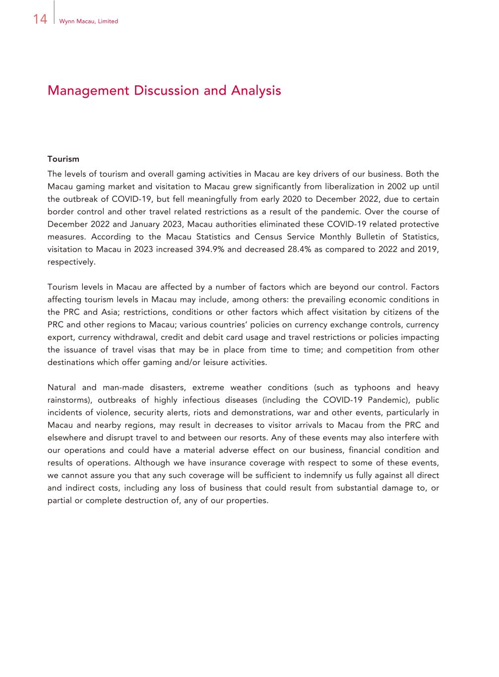 14 Wynn Macau, Limited Management Discussion and Analysis Tourism The levels of tourism and overall gaming activities in Macau are key drivers of our business. Both the Macau gaming market and visitation to Macau grew significantly from liberalization in 2002 up until the outbreak of COVID-19, but fell meaningfully from early 2020 to December 2022, due to certain border control and other travel related restrictions as a result of the pandemic. Over the course of December 2022 and January 2023, Macau authorities eliminated these COVID-19 related protective measures. According to the Macau Statistics and Census Service Monthly Bulletin of Statistics, visitation to Macau in 2023 increased 394.9% and decreased 28.4% as compared to 2022 and 2019, respectively. Tourism levels in Macau are affected by a number of factors which are beyond our control. Factors affecting tourism levels in Macau may include, among others: the prevailing economic conditions in the PRC and Asia; restrictions, conditions or other factors which affect visitation by citizens of the PRC and other regions to Macau; various countries’ policies on currency exchange controls, currency export, currency withdrawal, credit and debit card usage and travel restrictions or policies impacting the issuance of travel visas that may be in place from time to time; and competition from other destinations which offer gaming and/or leisure activities. Natural and man-made disasters, extreme weather conditions (such as typhoons and heavy rainstorms), outbreaks of highly infectious diseases (including the COVID-19 Pandemic), public incidents of violence, security alerts, riots and demonstrations, war and other events, particularly in Macau and nearby regions, may result in decreases to visitor arrivals to Macau from the PRC and elsewhere and disrupt travel to and between our resorts. Any of these events may also interfere with our operations and could have a material adverse effect on our business, financial condition and results of operations. Although we have insurance coverage with respect to some of these events, we cannot assure you that any such coverage will be sufficient to indemnify us fully against all direct and indirect costs, including any loss of business that could result from substantial damage to, or partial or complete destruction of, any of our properties.
