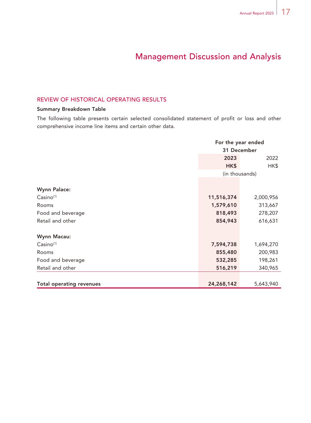 17Annual Report 2023 Management Discussion and Analysis REVIEW OF HISTORICAL OPERATING RESULTS Summary Breakdown Table The following table presents certain selected consolidated statement of profit or loss and other comprehensive income line items and certain other data. For the year ended 31 December 2023 2022 HK$ HK$ (in thousands) Wynn Palace: Casino(1) 11,516,374 2,000,956 Rooms 1,579,610 313,667 Food and beverage 818,493 278,207 Retail and other 854,943 616,631 Wynn Macau: Casino(1) 7,594,738 1,694,270 Rooms 855,480 200,983 Food and beverage 532,285 198,261 Retail and other 516,219 340,965 Total operating revenues 24,268,142 5,643,940