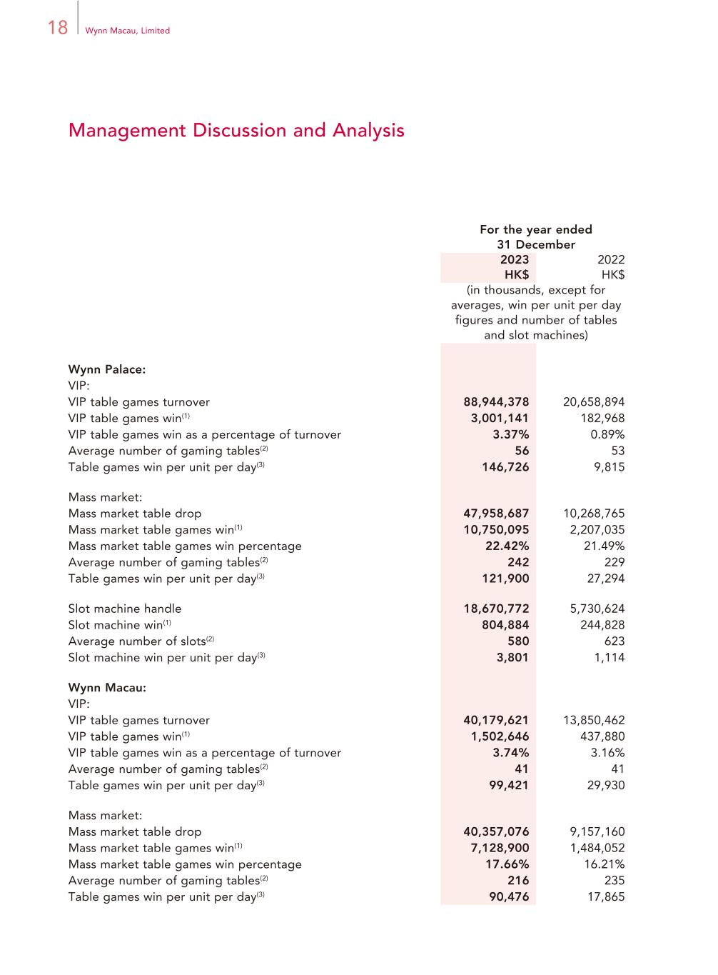 18 Wynn Macau, Limited Management Discussion and Analysis For the year ended 31 December 2023 2022 HK$ HK$ (in thousands, except for averages, win per unit per day figures and number of tables and slot machines) Wynn Palace: VIP: VIP table games turnover 88,944,378 20,658,894 VIP table games win(1) 3,001,141 182,968 VIP table games win as a percentage of turnover 3.37% 0.89% Average number of gaming tables(2) 56 53 Table games win per unit per day(3) 146,726 9,815 Mass market: Mass market table drop 47,958,687 10,268,765 Mass market table games win(1) 10,750,095 2,207,035 Mass market table games win percentage 22.42% 21.49% Average number of gaming tables(2) 242 229 Table games win per unit per day(3) 121,900 27,294 Slot machine handle 18,670,772 5,730,624 Slot machine win(1) 804,884 244,828 Average number of slots(2) 580 623 Slot machine win per unit per day(3) 3,801 1,114 Wynn Macau: VIP: VIP table games turnover 40,179,621 13,850,462 VIP table games win(1) 1,502,646 437,880 VIP table games win as a percentage of turnover 3.74% 3.16% Average number of gaming tables(2) 41 41 Table games win per unit per day(3) 99,421 29,930 Mass market: Mass market table drop 40,357,076 9,157,160 Mass market table games win(1) 7,128,900 1,484,052 Mass market table games win percentage 17.66% 16.21% Average number of gaming tables(2) 216 235 Table games win per unit per day(3) 90,476 17,865