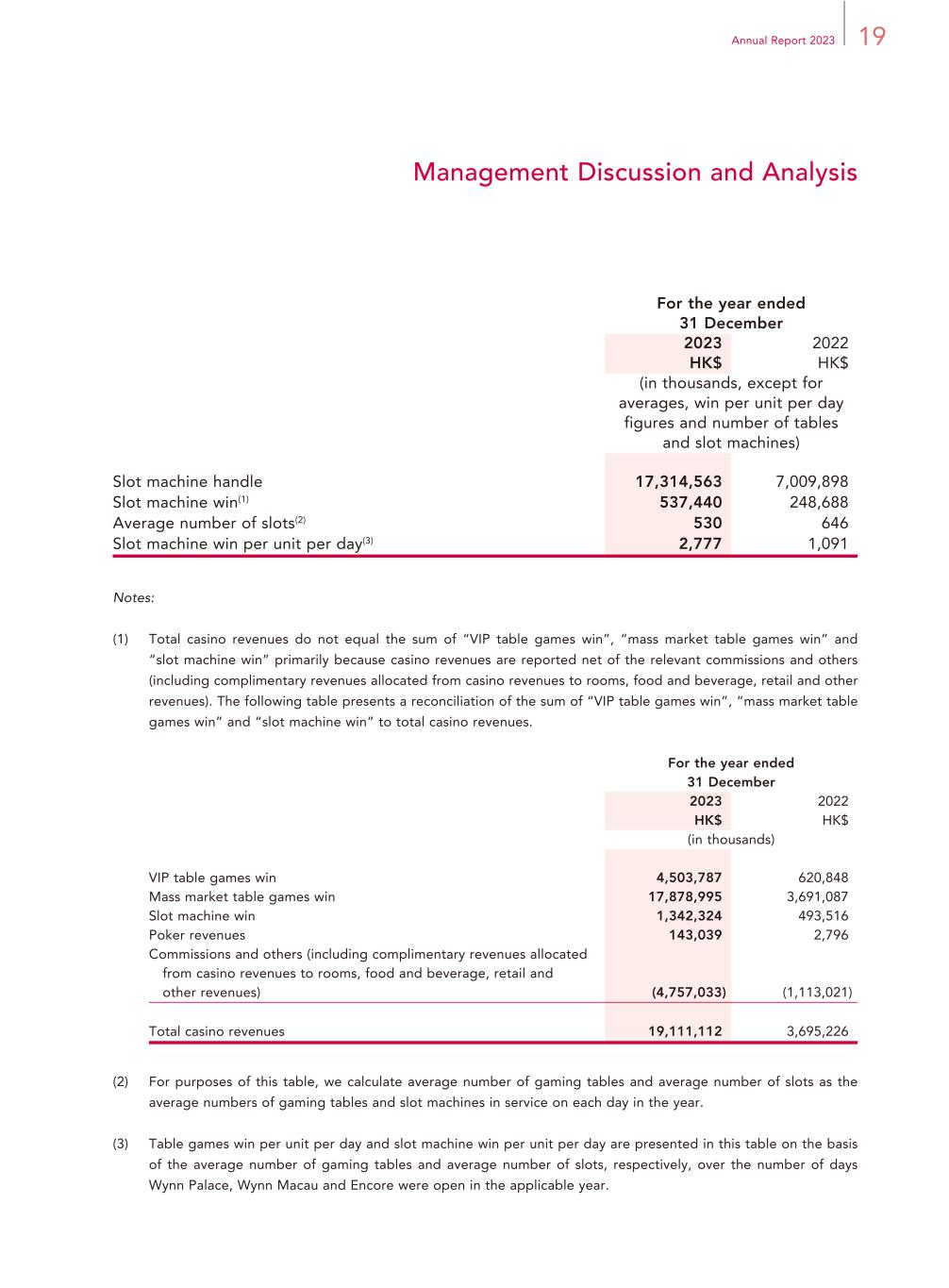 19Annual Report 2023 Management Discussion and Analysis For the year ended 31 December 2023 2022 HK$ HK$ (in thousands, except for averages, win per unit per day figures and number of tables and slot machines) Slot machine handle 17,314,563 7,009,898 Slot machine win(1) 537,440 248,688 Average number of slots(2) 530 646 Slot machine win per unit per day(3) 2,777 1,091 Notes: (1) Total casino revenues do not equal the sum of “VIP table games win”, “mass market table games win” and “slot machine win” primarily because casino revenues are reported net of the relevant commissions and others (including complimentary revenues allocated from casino revenues to rooms, food and beverage, retail and other revenues). The following table presents a reconciliation of the sum of “VIP table games win”, “mass market table games win” and “slot machine win” to total casino revenues. For the year ended 31 December 2023 2022 HK$ HK$ (in thousands) VIP table games win 4,503,787 620,848 Mass market table games win 17,878,995 3,691,087 Slot machine win 1,342,324 493,516 Poker revenues 143,039 2,796 Commissions and others (including complimentary revenues allocated from casino revenues to rooms, food and beverage, retail and other revenues) (4,757,033) (1,113,021) Total casino revenues 19,111,112 3,695,226 (2) For purposes of this table, we calculate average number of gaming tables and average number of slots as the average numbers of gaming tables and slot machines in service on each day in the year. (3) Table games win per unit per day and slot machine win per unit per day are presented in this table on the basis of the average number of gaming tables and average number of slots, respectively, over the number of days Wynn Palace, Wynn Macau and Encore were open in the applicable year.