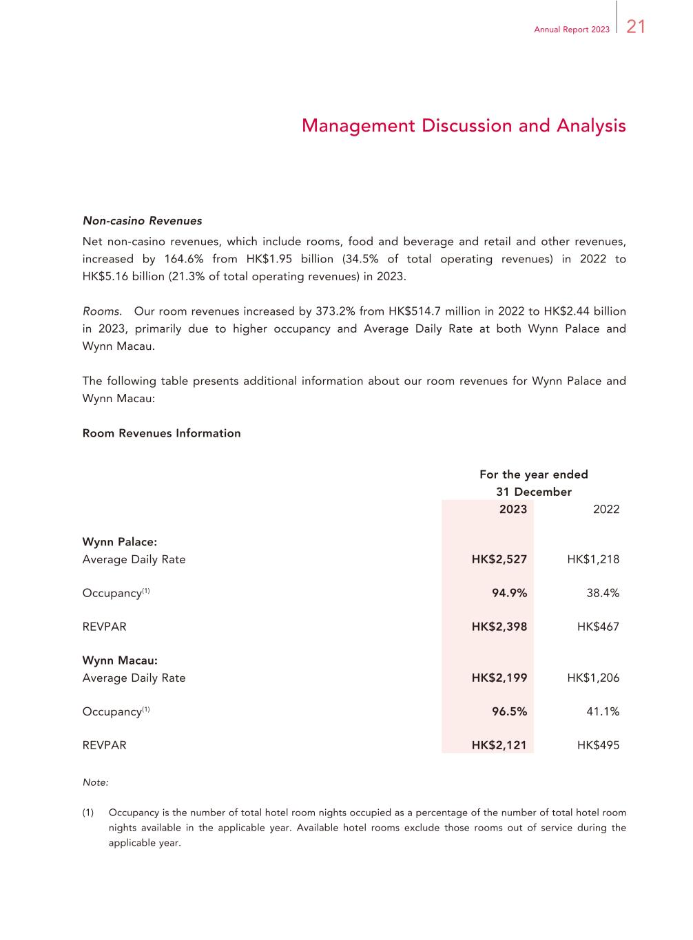 21Annual Report 2023 Management Discussion and Analysis Non-casino Revenues Net non-casino revenues, which include rooms, food and beverage and retail and other revenues, increased by 164.6% from HK$1.95 billion (34.5% of total operating revenues) in 2022 to HK$5.16 billion (21.3% of total operating revenues) in 2023. Rooms. Our room revenues increased by 373.2% from HK$514.7 million in 2022 to HK$2.44 billion in 2023, primarily due to higher occupancy and Average Daily Rate at both Wynn Palace and Wynn Macau. The following table presents additional information about our room revenues for Wynn Palace and Wynn Macau: Room Revenues Information For the year ended 31 December 2023 2022 Wynn Palace: Average Daily Rate HK$2,527 HK$1,218 Occupancy(1) 94.9% 38.4% REVPAR HK$2,398 HK$467 Wynn Macau: Average Daily Rate HK$2,199 HK$1,206 Occupancy(1) 96.5% 41.1% REVPAR HK$2,121 HK$495 Note: (1) Occupancy is the number of total hotel room nights occupied as a percentage of the number of total hotel room nights available in the applicable year. Available hotel rooms exclude those rooms out of service during the applicable year.
