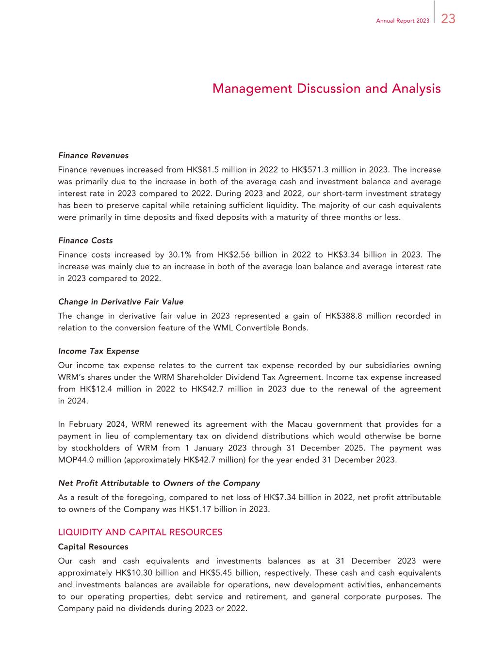 23Annual Report 2023 Management Discussion and Analysis Finance Revenues Finance revenues increased from HK$81.5 million in 2022 to HK$571.3 million in 2023. The increase was primarily due to the increase in both of the average cash and investment balance and average interest rate in 2023 compared to 2022. During 2023 and 2022, our short-term investment strategy has been to preserve capital while retaining sufficient liquidity. The majority of our cash equivalents were primarily in time deposits and fixed deposits with a maturity of three months or less. Finance Costs Finance costs increased by 30.1% from HK$2.56 billion in 2022 to HK$3.34 billion in 2023. The increase was mainly due to an increase in both of the average loan balance and average interest rate in 2023 compared to 2022. Change in Derivative Fair Value The change in derivative fair value in 2023 represented a gain of HK$388.8 million recorded in relation to the conversion feature of the WML Convertible Bonds. Income Tax Expense Our income tax expense relates to the current tax expense recorded by our subsidiaries owning WRM’s shares under the WRM Shareholder Dividend Tax Agreement. Income tax expense increased from HK$12.4 million in 2022 to HK$42.7 million in 2023 due to the renewal of the agreement in 2024. In February 2024, WRM renewed its agreement with the Macau government that provides for a payment in lieu of complementary tax on dividend distributions which would otherwise be borne by stockholders of WRM from 1 January 2023 through 31 December 2025. The payment was MOP44.0 million (approximately HK$42.7 million) for the year ended 31 December 2023. Net Profit Attributable to Owners of the Company As a result of the foregoing, compared to net loss of HK$7.34 billion in 2022, net profit attributable to owners of the Company was HK$1.17 billion in 2023. LIQUIDITY AND CAPITAL RESOURCES Capital Resources Our cash and cash equivalents and investments balances as at 31 December 2023 were approximately HK$10.30 billion and HK$5.45 billion, respectively. These cash and cash equivalents and investments balances are available for operations, new development activities, enhancements to our operating properties, debt service and retirement, and general corporate purposes. The Company paid no dividends during 2023 or 2022.