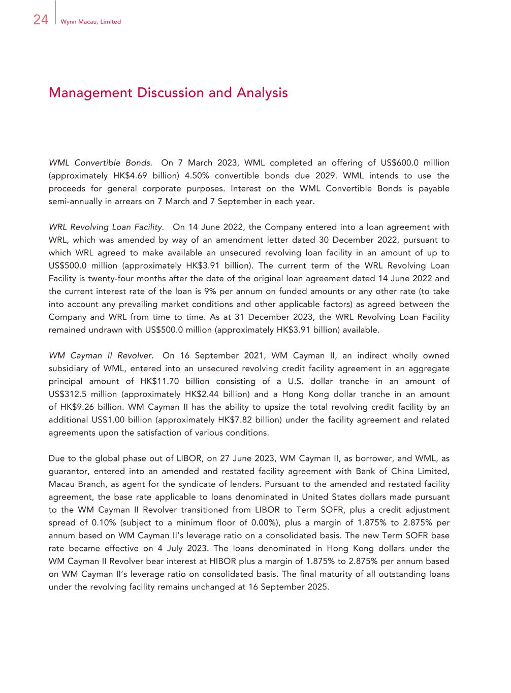 24 Wynn Macau, Limited Management Discussion and Analysis WML Convertible Bonds. On 7 March 2023, WML completed an offering of US$600.0 million (approximately HK$4.69 billion) 4.50% convertible bonds due 2029. WML intends to use the proceeds for general corporate purposes. Interest on the WML Convertible Bonds is payable semi-annually in arrears on 7 March and 7 September in each year. WRL Revolving Loan Facility. On 14 June 2022, the Company entered into a loan agreement with WRL, which was amended by way of an amendment letter dated 30 December 2022, pursuant to which WRL agreed to make available an unsecured revolving loan facility in an amount of up to US$500.0 million (approximately HK$3.91 billion). The current term of the WRL Revolving Loan Facility is twenty-four months after the date of the original loan agreement dated 14 June 2022 and the current interest rate of the loan is 9% per annum on funded amounts or any other rate (to take into account any prevailing market conditions and other applicable factors) as agreed between the Company and WRL from time to time. As at 31 December 2023, the WRL Revolving Loan Facility remained undrawn with US$500.0 million (approximately HK$3.91 billion) available. WM Cayman II Revolver. On 16 September 2021, WM Cayman II, an indirect wholly owned subsidiary of WML, entered into an unsecured revolving credit facility agreement in an aggregate principal amount of HK$11.70 billion consisting of a U.S. dollar tranche in an amount of US$312.5 million (approximately HK$2.44 billion) and a Hong Kong dollar tranche in an amount of HK$9.26 billion. WM Cayman II has the ability to upsize the total revolving credit facility by an additional US$1.00 billion (approximately HK$7.82 billion) under the facility agreement and related agreements upon the satisfaction of various conditions. Due to the global phase out of LIBOR, on 27 June 2023, WM Cayman II, as borrower, and WML, as guarantor, entered into an amended and restated facility agreement with Bank of China Limited, Macau Branch, as agent for the syndicate of lenders. Pursuant to the amended and restated facility agreement, the base rate applicable to loans denominated in United States dollars made pursuant to the WM Cayman II Revolver transitioned from LIBOR to Term SOFR, plus a credit adjustment spread of 0.10% (subject to a minimum floor of 0.00%), plus a margin of 1.875% to 2.875% per annum based on WM Cayman II’s leverage ratio on a consolidated basis. The new Term SOFR base rate became effective on 4 July 2023. The loans denominated in Hong Kong dollars under the WM Cayman II Revolver bear interest at HIBOR plus a margin of 1.875% to 2.875% per annum based on WM Cayman II’s leverage ratio on consolidated basis. The final maturity of all outstanding loans under the revolving facility remains unchanged at 16 September 2025.