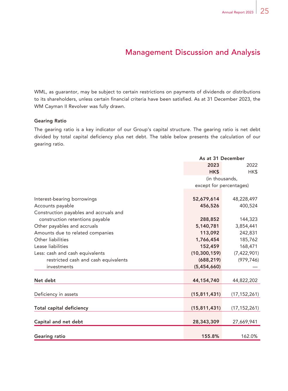 25Annual Report 2023 Management Discussion and Analysis WML, as guarantor, may be subject to certain restrictions on payments of dividends or distributions to its shareholders, unless certain financial criteria have been satisfied. As at 31 December 2023, the WM Cayman II Revolver was fully drawn. Gearing Ratio The gearing ratio is a key indicator of our Group’s capital structure. The gearing ratio is net debt divided by total capital deficiency plus net debt. The table below presents the calculation of our gearing ratio. As at 31 December 2023 2022 HK$ HK$ (in thousands, except for percentages) Interest-bearing borrowings 52,679,614 48,228,497 Accounts payable 456,526 400,524 Construction payables and accruals and construction retentions payable 288,852 144,323 Other payables and accruals 5,140,781 3,854,441 Amounts due to related companies 113,092 242,831 Other liabilities 1,766,454 185,762 Lease liabilities 152,459 168,471 Less: cash and cash equivalents (10,300,159) (7,422,901) restricted cash and cash equivalents (688,219) (979,746) investments (5,454,660) — Net debt 44,154,740 44,822,202 Deficiency in assets (15,811,431) (17,152,261) Total capital deficiency (15,811,431) (17,152,261) Capital and net debt 28,343,309 27,669,941 Gearing ratio 155.8% 162.0%