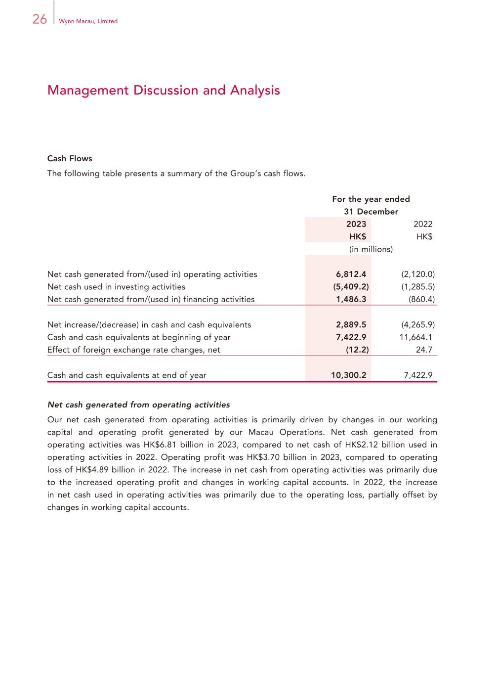 26 Wynn Macau, Limited Management Discussion and Analysis Cash Flows The following table presents a summary of the Group’s cash flows. For the year ended 31 December 2023 2022 HK$ HK$ (in millions) Net cash generated from/(used in) operating activities 6,812.4 (2,120.0) Net cash used in investing activities (5,409.2) (1,285.5) Net cash generated from/(used in) financing activities 1,486.3 (860.4) Net increase/(decrease) in cash and cash equivalents 2,889.5 (4,265.9) Cash and cash equivalents at beginning of year 7,422.9 11,664.1 Effect of foreign exchange rate changes, net (12.2) 24.7 Cash and cash equivalents at end of year 10,300.2 7,422.9 Net cash generated from operating activities Our net cash generated from operating activities is primarily driven by changes in our working capital and operating profit generated by our Macau Operations. Net cash generated from operating activities was HK$6.81 billion in 2023, compared to net cash of HK$2.12 billion used in operating activities in 2022. Operating profit was HK$3.70 billion in 2023, compared to operating loss of HK$4.89 billion in 2022. The increase in net cash from operating activities was primarily due to the increased operating profit and changes in working capital accounts. In 2022, the increase in net cash used in operating activities was primarily due to the operating loss, partially offset by changes in working capital accounts.