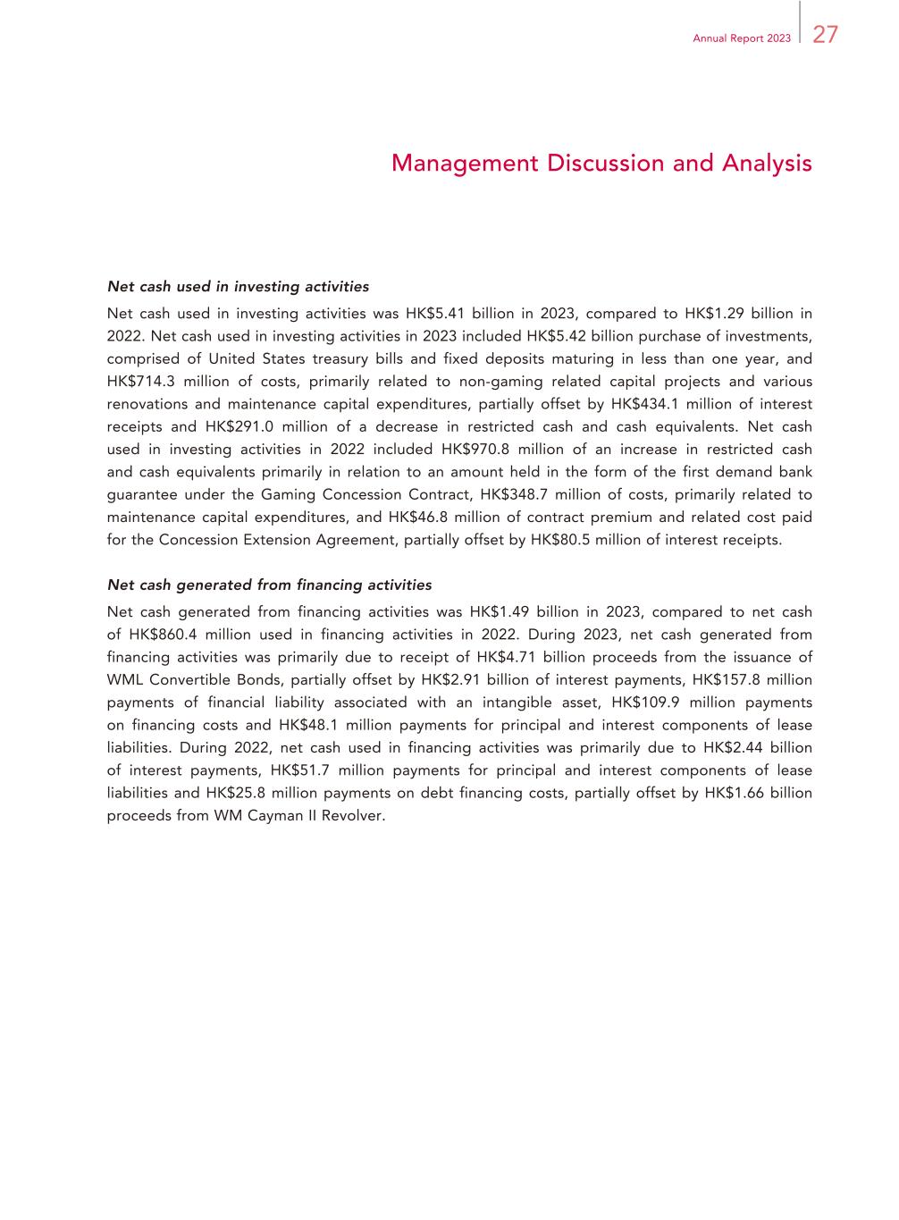 27Annual Report 2023 Management Discussion and Analysis Net cash used in investing activities Net cash used in investing activities was HK$5.41 billion in 2023, compared to HK$1.29 billion in 2022. Net cash used in investing activities in 2023 included HK$5.42 billion purchase of investments, comprised of United States treasury bills and fixed deposits maturing in less than one year, and HK$714.3 million of costs, primarily related to non-gaming related capital projects and various renovations and maintenance capital expenditures, partially offset by HK$434.1 million of interest receipts and HK$291.0 million of a decrease in restricted cash and cash equivalents. Net cash used in investing activities in 2022 included HK$970.8 million of an increase in restricted cash and cash equivalents primarily in relation to an amount held in the form of the first demand bank guarantee under the Gaming Concession Contract, HK$348.7 million of costs, primarily related to maintenance capital expenditures, and HK$46.8 million of contract premium and related cost paid for the Concession Extension Agreement, partially offset by HK$80.5 million of interest receipts. Net cash generated from financing activities Net cash generated from financing activities was HK$1.49 billion in 2023, compared to net cash of HK$860.4 million used in financing activities in 2022. During 2023, net cash generated from financing activities was primarily due to receipt of HK$4.71 billion proceeds from the issuance of WML Convertible Bonds, partially offset by HK$2.91 billion of interest payments, HK$157.8 million payments of financial liability associated with an intangible asset, HK$109.9 million payments on financing costs and HK$48.1 million payments for principal and interest components of lease liabilities. During 2022, net cash used in financing activities was primarily due to HK$2.44 billion of interest payments, HK$51.7 million payments for principal and interest components of lease liabilities and HK$25.8 million payments on debt financing costs, partially offset by HK$1.66 billion proceeds from WM Cayman II Revolver.
