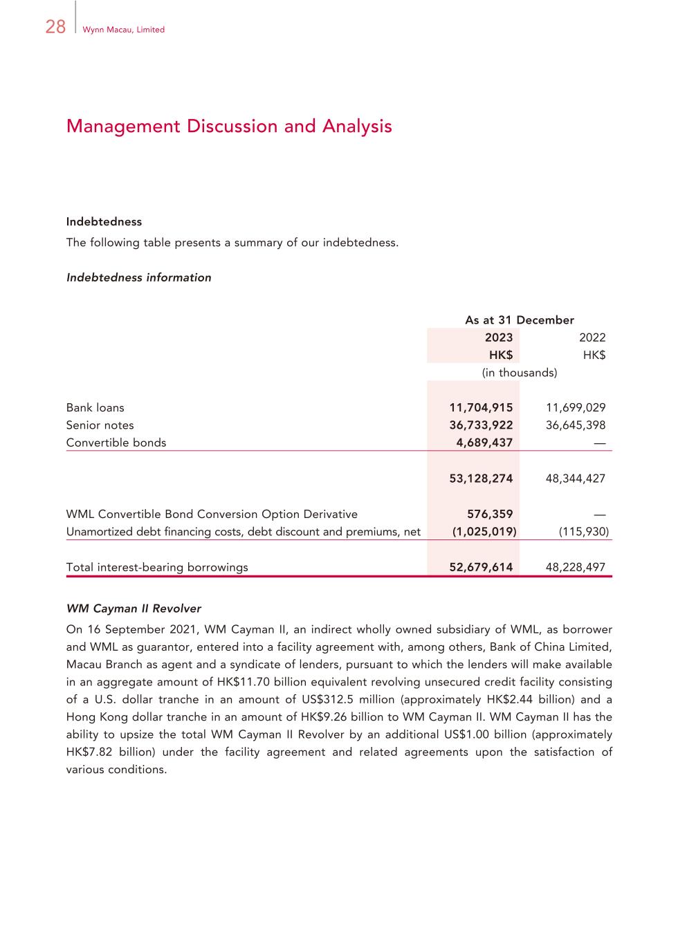 28 Wynn Macau, Limited Management Discussion and Analysis Indebtedness The following table presents a summary of our indebtedness. Indebtedness information As at 31 December 2023 2022 HK$ HK$ (in thousands) Bank loans 11,704,915 11,699,029 Senior notes 36,733,922 36,645,398 Convertible bonds 4,689,437 — 53,128,274 48,344,427 WML Convertible Bond Conversion Option Derivative 576,359 — Unamortized debt financing costs, debt discount and premiums, net (1,025,019) (115,930) Total interest-bearing borrowings 52,679,614 48,228,497 WM Cayman II Revolver On 16 September 2021, WM Cayman II, an indirect wholly owned subsidiary of WML, as borrower and WML as guarantor, entered into a facility agreement with, among others, Bank of China Limited, Macau Branch as agent and a syndicate of lenders, pursuant to which the lenders will make available in an aggregate amount of HK$11.70 billion equivalent revolving unsecured credit facility consisting of a U.S. dollar tranche in an amount of US$312.5 million (approximately HK$2.44 billion) and a Hong Kong dollar tranche in an amount of HK$9.26 billion to WM Cayman II. WM Cayman II has the ability to upsize the total WM Cayman II Revolver by an additional US$1.00 billion (approximately HK$7.82 billion) under the facility agreement and related agreements upon the satisfaction of various conditions.