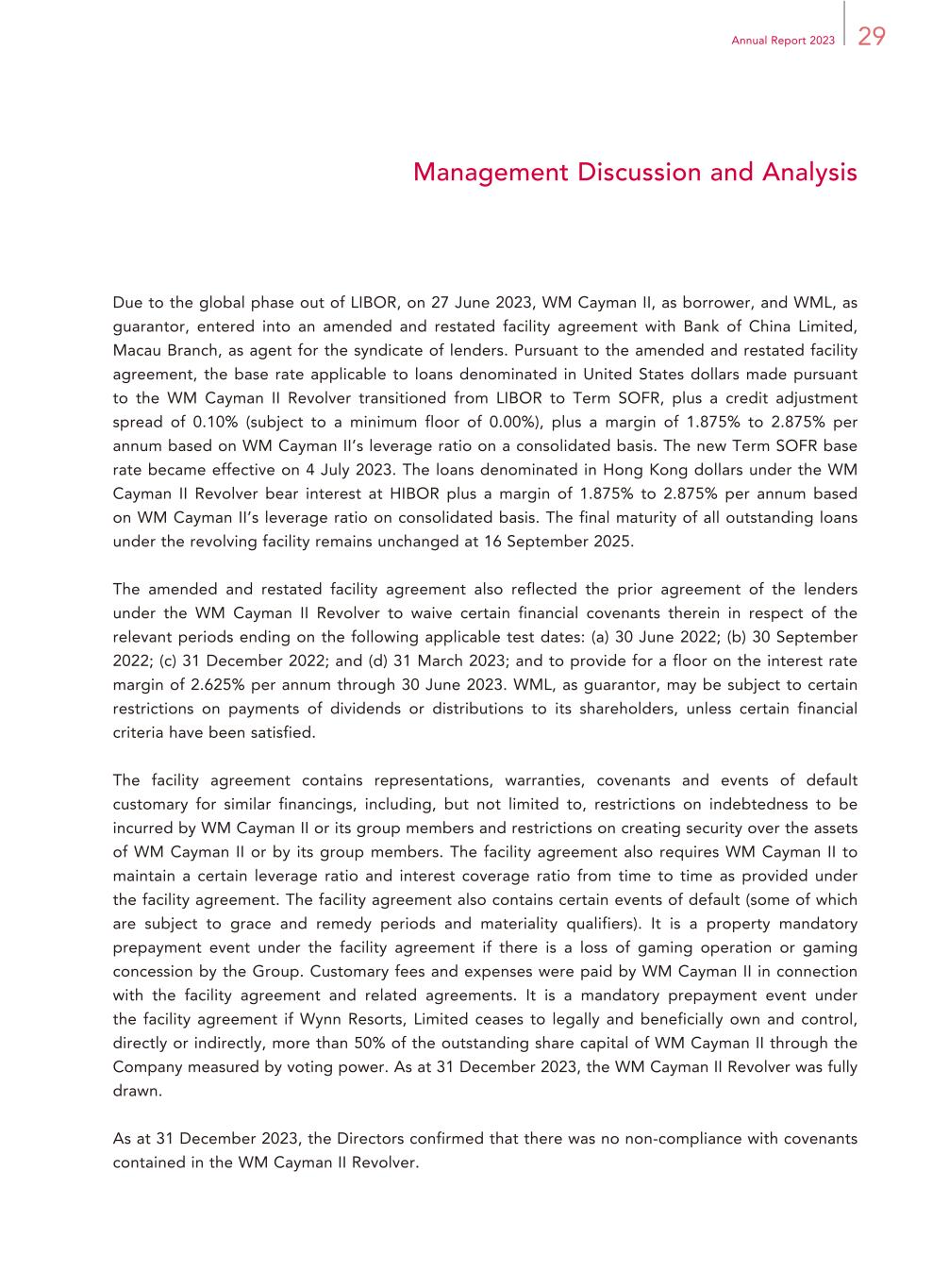 29Annual Report 2023 Management Discussion and Analysis Due to the global phase out of LIBOR, on 27 June 2023, WM Cayman II, as borrower, and WML, as guarantor, entered into an amended and restated facility agreement with Bank of China Limited, Macau Branch, as agent for the syndicate of lenders. Pursuant to the amended and restated facility agreement, the base rate applicable to loans denominated in United States dollars made pursuant to the WM Cayman II Revolver transitioned from LIBOR to Term SOFR, plus a credit adjustment spread of 0.10% (subject to a minimum floor of 0.00%), plus a margin of 1.875% to 2.875% per annum based on WM Cayman II’s leverage ratio on a consolidated basis. The new Term SOFR base rate became effective on 4 July 2023. The loans denominated in Hong Kong dollars under the WM Cayman II Revolver bear interest at HIBOR plus a margin of 1.875% to 2.875% per annum based on WM Cayman II’s leverage ratio on consolidated basis. The final maturity of all outstanding loans under the revolving facility remains unchanged at 16 September 2025. The amended and restated facility agreement also reflected the prior agreement of the lenders under the WM Cayman II Revolver to waive certain financial covenants therein in respect of the relevant periods ending on the following applicable test dates: (a) 30 June 2022; (b) 30 September 2022; (c) 31 December 2022; and (d) 31 March 2023; and to provide for a floor on the interest rate margin of 2.625% per annum through 30 June 2023. WML, as guarantor, may be subject to certain restrictions on payments of dividends or distributions to its shareholders, unless certain financial criteria have been satisfied. The facility agreement contains representations, warranties, covenants and events of default customary for similar financings, including, but not limited to, restrictions on indebtedness to be incurred by WM Cayman II or its group members and restrictions on creating security over the assets of WM Cayman II or by its group members. The facility agreement also requires WM Cayman II to maintain a certain leverage ratio and interest coverage ratio from time to time as provided under the facility agreement. The facility agreement also contains certain events of default (some of which are subject to grace and remedy periods and materiality qualifiers). It is a property mandatory prepayment event under the facility agreement if there is a loss of gaming operation or gaming concession by the Group. Customary fees and expenses were paid by WM Cayman II in connection with the facility agreement and related agreements. It is a mandatory prepayment event under the facility agreement if Wynn Resorts, Limited ceases to legally and beneficially own and control, directly or indirectly, more than 50% of the outstanding share capital of WM Cayman II through the Company measured by voting power. As at 31 December 2023, the WM Cayman II Revolver was fully drawn. As at 31 December 2023, the Directors confirmed that there was no non-compliance with covenants contained in the WM Cayman II Revolver.