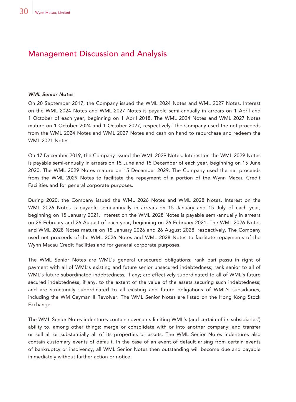 30 Wynn Macau, Limited Management Discussion and Analysis WML Senior Notes On 20 September 2017, the Company issued the WML 2024 Notes and WML 2027 Notes. Interest on the WML 2024 Notes and WML 2027 Notes is payable semi-annually in arrears on 1 April and 1 October of each year, beginning on 1 April 2018. The WML 2024 Notes and WML 2027 Notes mature on 1 October 2024 and 1 October 2027, respectively. The Company used the net proceeds from the WML 2024 Notes and WML 2027 Notes and cash on hand to repurchase and redeem the WML 2021 Notes. On 17 December 2019, the Company issued the WML 2029 Notes. Interest on the WML 2029 Notes is payable semi-annually in arrears on 15 June and 15 December of each year, beginning on 15 June 2020. The WML 2029 Notes mature on 15 December 2029. The Company used the net proceeds from the WML 2029 Notes to facilitate the repayment of a portion of the Wynn Macau Credit Facilities and for general corporate purposes. During 2020, the Company issued the WML 2026 Notes and WML 2028 Notes. Interest on the WML 2026 Notes is payable semi-annually in arrears on 15 January and 15 July of each year, beginning on 15 January 2021. Interest on the WML 2028 Notes is payable semi-annually in arrears on 26 February and 26 August of each year, beginning on 26 February 2021. The WML 2026 Notes and WML 2028 Notes mature on 15 January 2026 and 26 August 2028, respectively. The Company used net proceeds of the WML 2026 Notes and WML 2028 Notes to facilitate repayments of the Wynn Macau Credit Facilities and for general corporate purposes. The WML Senior Notes are WML’s general unsecured obligations; rank pari passu in right of payment with all of WML’s existing and future senior unsecured indebtedness; rank senior to all of WML’s future subordinated indebtedness, if any; are effectively subordinated to all of WML’s future secured indebtedness, if any, to the extent of the value of the assets securing such indebtedness; and are structurally subordinated to all existing and future obligations of WML’s subsidiaries, including the WM Cayman II Revolver. The WML Senior Notes are listed on the Hong Kong Stock Exchange. The WML Senior Notes indentures contain covenants limiting WML’s (and certain of its subsidiaries’) ability to, among other things: merge or consolidate with or into another company; and transfer or sell all or substantially all of its properties or assets. The WML Senior Notes indentures also contain customary events of default. In the case of an event of default arising from certain events of bankruptcy or insolvency, all WML Senior Notes then outstanding will become due and payable immediately without further action or notice.