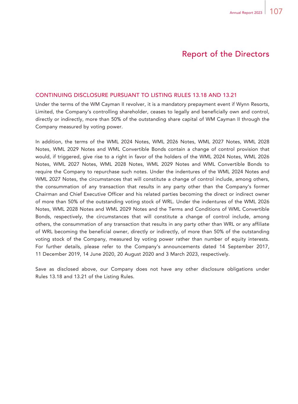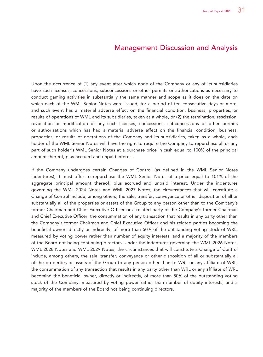 31Annual Report 2023 Management Discussion and Analysis Upon the occurrence of (1) any event after which none of the Company or any of its subsidiaries have such licenses, concessions, subconcessions or other permits or authorizations as necessary to conduct gaming activities in substantially the same manner and scope as it does on the date on which each of the WML Senior Notes were issued, for a period of ten consecutive days or more, and such event has a material adverse effect on the financial condition, business, properties, or results of operations of WML and its subsidiaries, taken as a whole, or (2) the termination, rescission, revocation or modification of any such licenses, concessions, subconcessions or other permits or authorizations which has had a material adverse effect on the financial condition, business, properties, or results of operations of the Company and its subsidiaries, taken as a whole, each holder of the WML Senior Notes will have the right to require the Company to repurchase all or any part of such holder’s WML Senior Notes at a purchase price in cash equal to 100% of the principal amount thereof, plus accrued and unpaid interest. If the Company undergoes certain Changes of Control (as defined in the WML Senior Notes indentures), it must offer to repurchase the WML Senior Notes at a price equal to 101% of the aggregate principal amount thereof, plus accrued and unpaid interest. Under the indentures governing the WML 2024 Notes and WML 2027 Notes, the circumstances that will constitute a Change of Control include, among others, the sale, transfer, conveyance or other disposition of all or substantially all of the properties or assets of the Group to any person other than to the Company’s former Chairman and Chief Executive Officer or a related party of the Company’s former Chairman and Chief Executive Officer, the consummation of any transaction that results in any party other than the Company’s former Chairman and Chief Executive Officer and his related parties becoming the beneficial owner, directly or indirectly, of more than 50% of the outstanding voting stock of WRL, measured by voting power rather than number of equity interests, and a majority of the members of the Board not being continuing directors. Under the indentures governing the WML 2026 Notes, WML 2028 Notes and WML 2029 Notes, the circumstances that will constitute a Change of Control include, among others, the sale, transfer, conveyance or other disposition of all or substantially all of the properties or assets of the Group to any person other than to WRL or any affiliate of WRL, the consummation of any transaction that results in any party other than WRL or any affiliate of WRL becoming the beneficial owner, directly or indirectly, of more than 50% of the outstanding voting stock of the Company, measured by voting power rather than number of equity interests, and a majority of the members of the Board not being continuing directors.