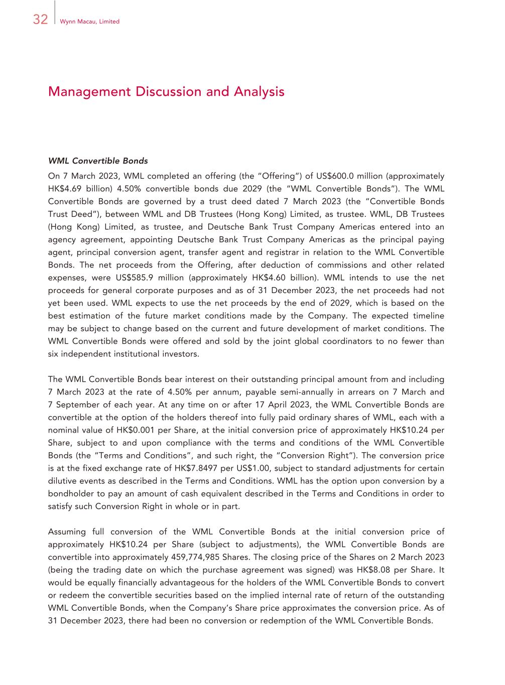 32 Wynn Macau, Limited Management Discussion and Analysis WML Convertible Bonds On 7 March 2023, WML completed an offering (the “Offering”) of US$600.0 million (approximately HK$4.69 billion) 4.50% convertible bonds due 2029 (the “WML Convertible Bonds”). The WML Convertible Bonds are governed by a trust deed dated 7 March 2023 (the “Convertible Bonds Trust Deed”), between WML and DB Trustees (Hong Kong) Limited, as trustee. WML, DB Trustees (Hong Kong) Limited, as trustee, and Deutsche Bank Trust Company Americas entered into an agency agreement, appointing Deutsche Bank Trust Company Americas as the principal paying agent, principal conversion agent, transfer agent and registrar in relation to the WML Convertible Bonds. The net proceeds from the Offering, after deduction of commissions and other related expenses, were US$585.9 million (approximately HK$4.60 billion). WML intends to use the net proceeds for general corporate purposes and as of 31 December 2023, the net proceeds had not yet been used. WML expects to use the net proceeds by the end of 2029, which is based on the best estimation of the future market conditions made by the Company. The expected timeline may be subject to change based on the current and future development of market conditions. The WML Convertible Bonds were offered and sold by the joint global coordinators to no fewer than six independent institutional investors. The WML Convertible Bonds bear interest on their outstanding principal amount from and including 7 March 2023 at the rate of 4.50% per annum, payable semi-annually in arrears on 7 March and 7 September of each year. At any time on or after 17 April 2023, the WML Convertible Bonds are convertible at the option of the holders thereof into fully paid ordinary shares of WML, each with a nominal value of HK$0.001 per Share, at the initial conversion price of approximately HK$10.24 per Share, subject to and upon compliance with the terms and conditions of the WML Convertible Bonds (the “Terms and Conditions”, and such right, the “Conversion Right”). The conversion price is at the fixed exchange rate of HK$7.8497 per US$1.00, subject to standard adjustments for certain dilutive events as described in the Terms and Conditions. WML has the option upon conversion by a bondholder to pay an amount of cash equivalent described in the Terms and Conditions in order to satisfy such Conversion Right in whole or in part. Assuming full conversion of the WML Convertible Bonds at the initial conversion price of approximately HK$10.24 per Share (subject to adjustments), the WML Convertible Bonds are convertible into approximately 459,774,985 Shares. The closing price of the Shares on 2 March 2023 (being the trading date on which the purchase agreement was signed) was HK$8.08 per Share. It would be equally financially advantageous for the holders of the WML Convertible Bonds to convert or redeem the convertible securities based on the implied internal rate of return of the outstanding WML Convertible Bonds, when the Company’s Share price approximates the conversion price. As of 31 December 2023, there had been no conversion or redemption of the WML Convertible Bonds.