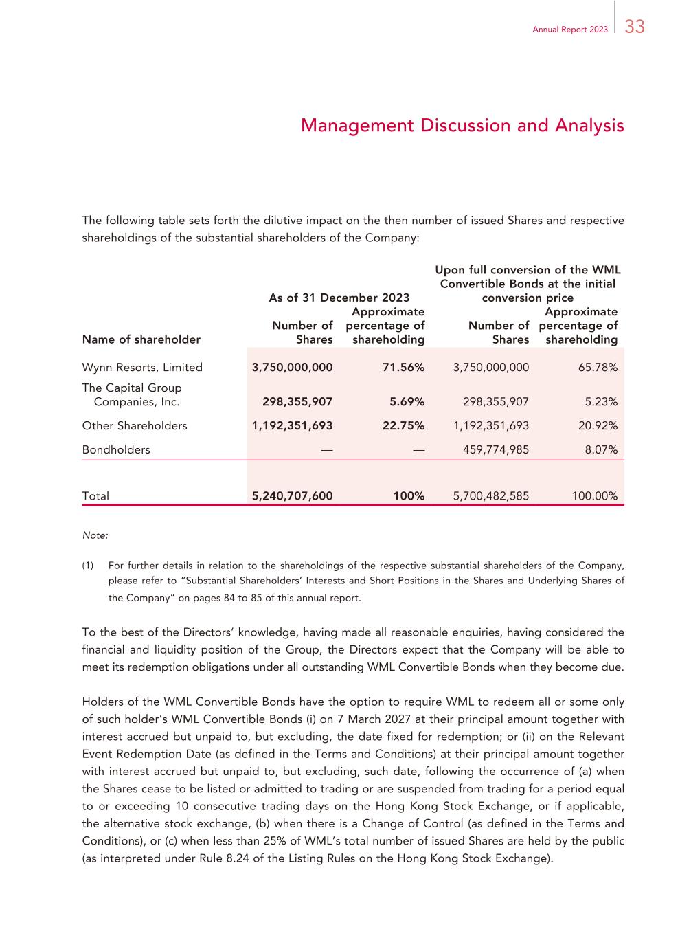 33Annual Report 2023 Management Discussion and Analysis The following table sets forth the dilutive impact on the then number of issued Shares and respective shareholdings of the substantial shareholders of the Company: Name of shareholder As of 31 December 2023 Upon full conversion of the WML Convertible Bonds at the initial conversion price Number of Shares Approximate percentage of shareholding Number of Shares Approximate percentage of shareholding Wynn Resorts, Limited 3,750,000,000 71.56% 3,750,000,000 65.78% The Capital Group Companies, Inc. 298,355,907 5.69% 298,355,907 5.23% Other Shareholders 1,192,351,693 22.75% 1,192,351,693 20.92% Bondholders — — 459,774,985 8.07% Total 5,240,707,600 100% 5,700,482,585 100.00% Note: (1) For further details in relation to the shareholdings of the respective substantial shareholders of the Company, please refer to “Substantial Shareholders’ Interests and Short Positions in the Shares and Underlying Shares of the Company” on pages 84 to 85 of this annual report. To the best of the Directors’ knowledge, having made all reasonable enquiries, having considered the financial and liquidity position of the Group, the Directors expect that the Company will be able to meet its redemption obligations under all outstanding WML Convertible Bonds when they become due. Holders of the WML Convertible Bonds have the option to require WML to redeem all or some only of such holder’s WML Convertible Bonds (i) on 7 March 2027 at their principal amount together with interest accrued but unpaid to, but excluding, the date fixed for redemption; or (ii) on the Relevant Event Redemption Date (as defined in the Terms and Conditions) at their principal amount together with interest accrued but unpaid to, but excluding, such date, following the occurrence of (a) when the Shares cease to be listed or admitted to trading or are suspended from trading for a period equal to or exceeding 10 consecutive trading days on the Hong Kong Stock Exchange, or if applicable, the alternative stock exchange, (b) when there is a Change of Control (as defined in the Terms and Conditions), or (c) when less than 25% of WML’s total number of issued Shares are held by the public (as interpreted under Rule 8.24 of the Listing Rules on the Hong Kong Stock Exchange).