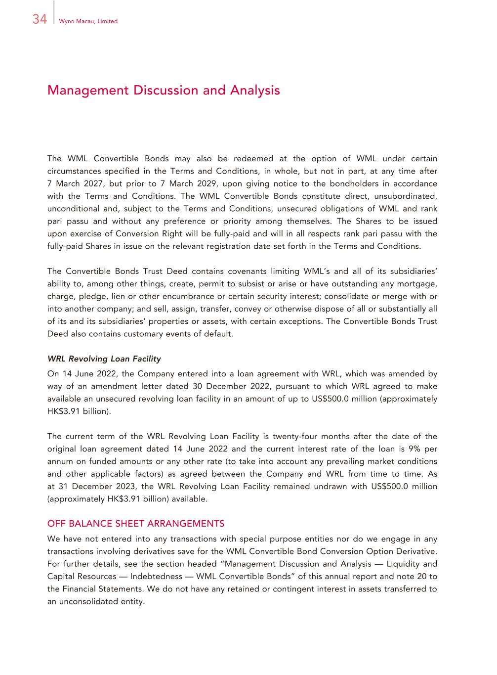 34 Wynn Macau, Limited Management Discussion and Analysis The WML Convertible Bonds may also be redeemed at the option of WML under certain circumstances specified in the Terms and Conditions, in whole, but not in part, at any time after 7 March 2027, but prior to 7 March 2029, upon giving notice to the bondholders in accordance with the Terms and Conditions. The WML Convertible Bonds constitute direct, unsubordinated, unconditional and, subject to the Terms and Conditions, unsecured obligations of WML and rank pari passu and without any preference or priority among themselves. The Shares to be issued upon exercise of Conversion Right will be fully-paid and will in all respects rank pari passu with the fully-paid Shares in issue on the relevant registration date set forth in the Terms and Conditions. The Convertible Bonds Trust Deed contains covenants limiting WML’s and all of its subsidiaries’ ability to, among other things, create, permit to subsist or arise or have outstanding any mortgage, charge, pledge, lien or other encumbrance or certain security interest; consolidate or merge with or into another company; and sell, assign, transfer, convey or otherwise dispose of all or substantially all of its and its subsidiaries’ properties or assets, with certain exceptions. The Convertible Bonds Trust Deed also contains customary events of default. WRL Revolving Loan Facility On 14 June 2022, the Company entered into a loan agreement with WRL, which was amended by way of an amendment letter dated 30 December 2022, pursuant to which WRL agreed to make available an unsecured revolving loan facility in an amount of up to US$500.0 million (approximately HK$3.91 billion). The current term of the WRL Revolving Loan Facility is twenty-four months after the date of the original loan agreement dated 14 June 2022 and the current interest rate of the loan is 9% per annum on funded amounts or any other rate (to take into account any prevailing market conditions and other applicable factors) as agreed between the Company and WRL from time to time. As at 31 December 2023, the WRL Revolving Loan Facility remained undrawn with US$500.0 million (approximately HK$3.91 billion) available. OFF BALANCE SHEET ARRANGEMENTS We have not entered into any transactions with special purpose entities nor do we engage in any transactions involving derivatives save for the WML Convertible Bond Conversion Option Derivative. For further details, see the section headed “Management Discussion and Analysis — Liquidity and Capital Resources — Indebtedness — WML Convertible Bonds” of this annual report and note 20 to the Financial Statements. We do not have any retained or contingent interest in assets transferred to an unconsolidated entity.