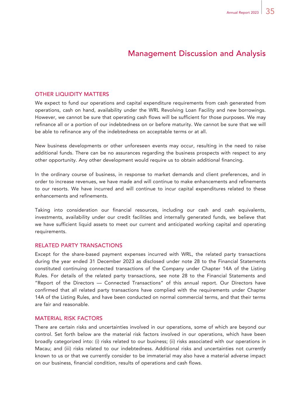 35Annual Report 2023 Management Discussion and Analysis OTHER LIQUIDITY MATTERS We expect to fund our operations and capital expenditure requirements from cash generated from operations, cash on hand, availability under the WRL Revolving Loan Facility and new borrowings. However, we cannot be sure that operating cash flows will be sufficient for those purposes. We may refinance all or a portion of our indebtedness on or before maturity. We cannot be sure that we will be able to refinance any of the indebtedness on acceptable terms or at all. New business developments or other unforeseen events may occur, resulting in the need to raise additional funds. There can be no assurances regarding the business prospects with respect to any other opportunity. Any other development would require us to obtain additional financing. In the ordinary course of business, in response to market demands and client preferences, and in order to increase revenues, we have made and will continue to make enhancements and refinements to our resorts. We have incurred and will continue to incur capital expenditures related to these enhancements and refinements. Taking into consideration our financial resources, including our cash and cash equivalents, investments, availability under our credit facilities and internally generated funds, we believe that we have sufficient liquid assets to meet our current and anticipated working capital and operating requirements. RELATED PARTY TRANSACTIONS Except for the share-based payment expenses incurred with WRL, the related party transactions during the year ended 31 December 2023 as disclosed under note 28 to the Financial Statements constituted continuing connected transactions of the Company under Chapter 14A of the Listing Rules. For details of the related party transactions, see note 28 to the Financial Statements and “Report of the Directors — Connected Transactions” of this annual report. Our Directors have confirmed that all related party transactions have complied with the requirements under Chapter 14A of the Listing Rules, and have been conducted on normal commercial terms, and that their terms are fair and reasonable. MATERIAL RISK FACTORS There are certain risks and uncertainties involved in our operations, some of which are beyond our control. Set forth below are the material risk factors involved in our operations, which have been broadly categorized into: (i) risks related to our business; (ii) risks associated with our operations in Macau; and (iii) risks related to our indebtedness. Additional risks and uncertainties not currently known to us or that we currently consider to be immaterial may also have a material adverse impact on our business, financial condition, results of operations and cash flows.