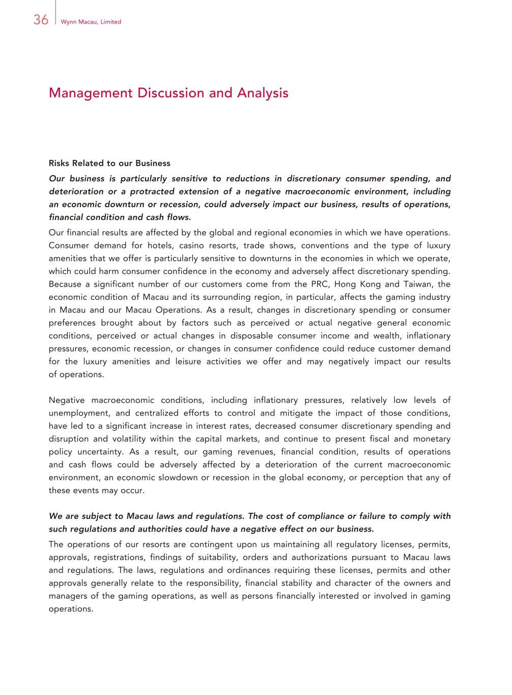36 Wynn Macau, Limited Management Discussion and Analysis Risks Related to our Business Our business is particularly sensitive to reductions in discretionary consumer spending, and deterioration or a protracted extension of a negative macroeconomic environment, including an economic downturn or recession, could adversely impact our business, results of operations, financial condition and cash flows. Our financial results are affected by the global and regional economies in which we have operations. Consumer demand for hotels, casino resorts, trade shows, conventions and the type of luxury amenities that we offer is particularly sensitive to downturns in the economies in which we operate, which could harm consumer confidence in the economy and adversely affect discretionary spending. Because a significant number of our customers come from the PRC, Hong Kong and Taiwan, the economic condition of Macau and its surrounding region, in particular, affects the gaming industry in Macau and our Macau Operations. As a result, changes in discretionary spending or consumer preferences brought about by factors such as perceived or actual negative general economic conditions, perceived or actual changes in disposable consumer income and wealth, inflationary pressures, economic recession, or changes in consumer confidence could reduce customer demand for the luxury amenities and leisure activities we offer and may negatively impact our results of operations. Negative macroeconomic conditions, including inflationary pressures, relatively low levels of unemployment, and centralized efforts to control and mitigate the impact of those conditions, have led to a significant increase in interest rates, decreased consumer discretionary spending and disruption and volatility within the capital markets, and continue to present fiscal and monetary policy uncertainty. As a result, our gaming revenues, financial condition, results of operations and cash flows could be adversely affected by a deterioration of the current macroeconomic environment, an economic slowdown or recession in the global economy, or perception that any of these events may occur. We are subject to Macau laws and regulations. The cost of compliance or failure to comply with such regulations and authorities could have a negative effect on our business. The operations of our resorts are contingent upon us maintaining all regulatory licenses, permits, approvals, registrations, findings of suitability, orders and authorizations pursuant to Macau laws and regulations. The laws, regulations and ordinances requiring these licenses, permits and other approvals generally relate to the responsibility, financial stability and character of the owners and managers of the gaming operations, as well as persons financially interested or involved in gaming operations.