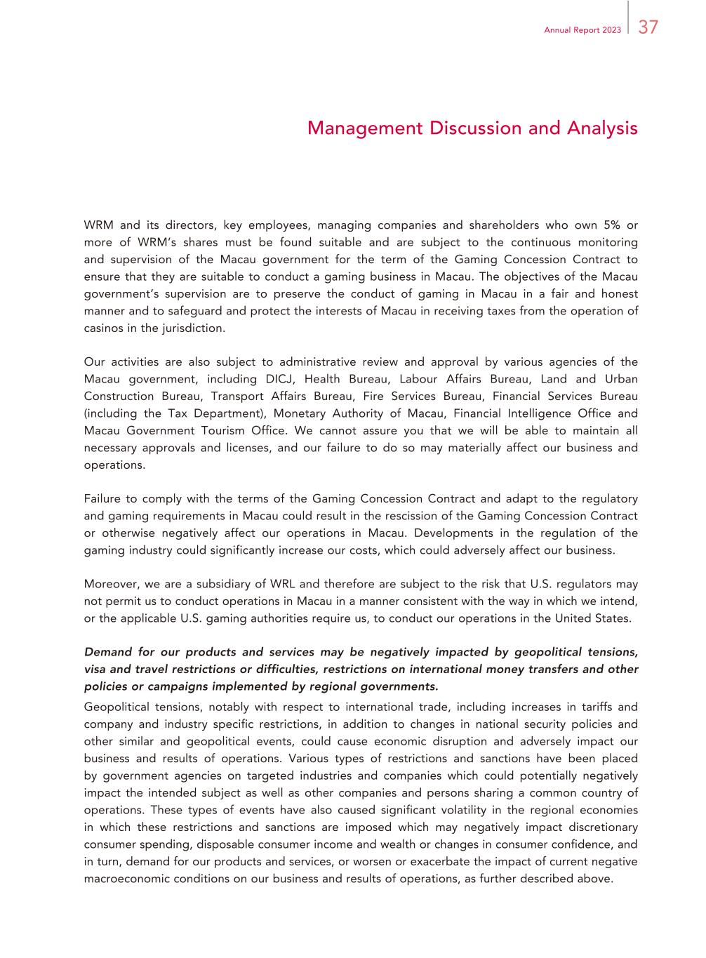 37Annual Report 2023 Management Discussion and Analysis WRM and its directors, key employees, managing companies and shareholders who own 5% or more of WRM’s shares must be found suitable and are subject to the continuous monitoring and supervision of the Macau government for the term of the Gaming Concession Contract to ensure that they are suitable to conduct a gaming business in Macau. The objectives of the Macau government’s supervision are to preserve the conduct of gaming in Macau in a fair and honest manner and to safeguard and protect the interests of Macau in receiving taxes from the operation of casinos in the jurisdiction. Our activities are also subject to administrative review and approval by various agencies of the Macau government, including DICJ, Health Bureau, Labour Affairs Bureau, Land and Urban Construction Bureau, Transport Affairs Bureau, Fire Services Bureau, Financial Services Bureau (including the Tax Department), Monetary Authority of Macau, Financial Intelligence Office and Macau Government Tourism Office. We cannot assure you that we will be able to maintain all necessary approvals and licenses, and our failure to do so may materially affect our business and operations. Failure to comply with the terms of the Gaming Concession Contract and adapt to the regulatory and gaming requirements in Macau could result in the rescission of the Gaming Concession Contract or otherwise negatively affect our operations in Macau. Developments in the regulation of the gaming industry could significantly increase our costs, which could adversely affect our business. Moreover, we are a subsidiary of WRL and therefore are subject to the risk that U.S. regulators may not permit us to conduct operations in Macau in a manner consistent with the way in which we intend, or the applicable U.S. gaming authorities require us, to conduct our operations in the United States. Demand for our products and services may be negatively impacted by geopolitical tensions, visa and travel restrictions or difficulties, restrictions on international money transfers and other policies or campaigns implemented by regional governments. Geopolitical tensions, notably with respect to international trade, including increases in tariffs and company and industry specific restrictions, in addition to changes in national security policies and other similar and geopolitical events, could cause economic disruption and adversely impact our business and results of operations. Various types of restrictions and sanctions have been placed by government agencies on targeted industries and companies which could potentially negatively impact the intended subject as well as other companies and persons sharing a common country of operations. These types of events have also caused significant volatility in the regional economies in which these restrictions and sanctions are imposed which may negatively impact discretionary consumer spending, disposable consumer income and wealth or changes in consumer confidence, and in turn, demand for our products and services, or worsen or exacerbate the impact of current negative macroeconomic conditions on our business and results of operations, as further described above.